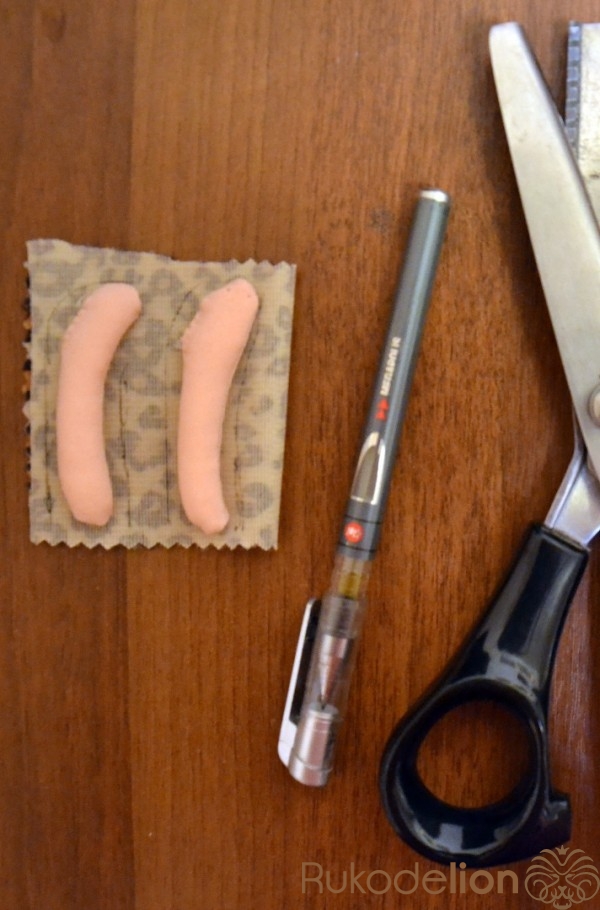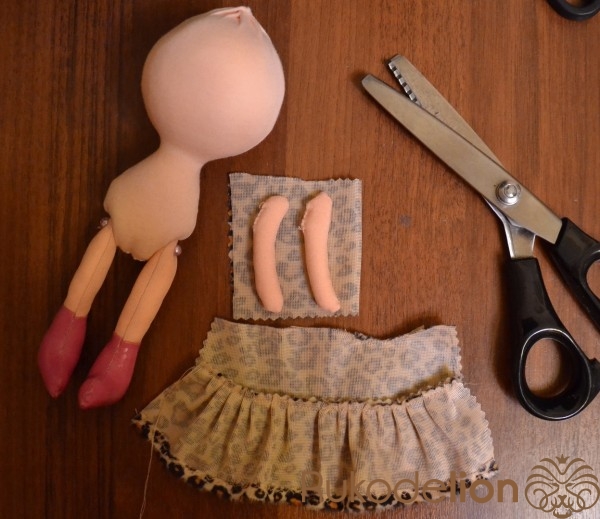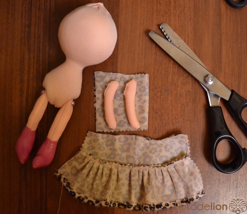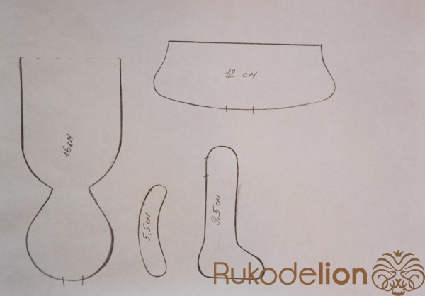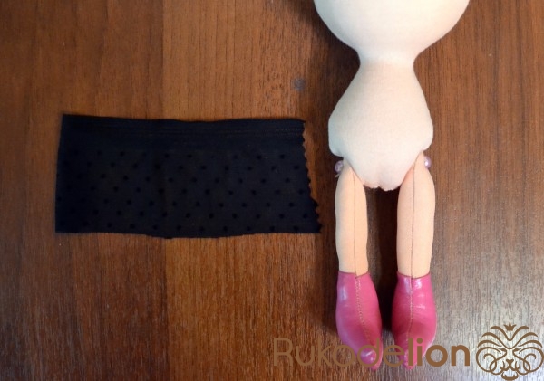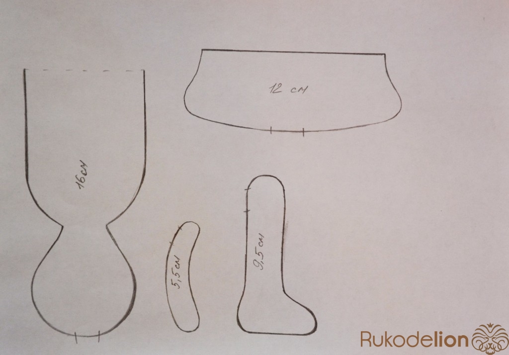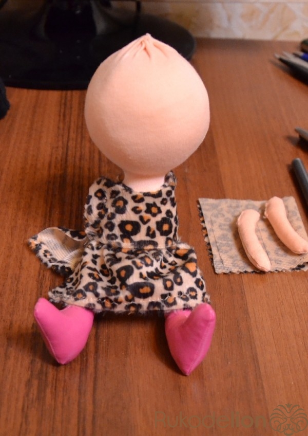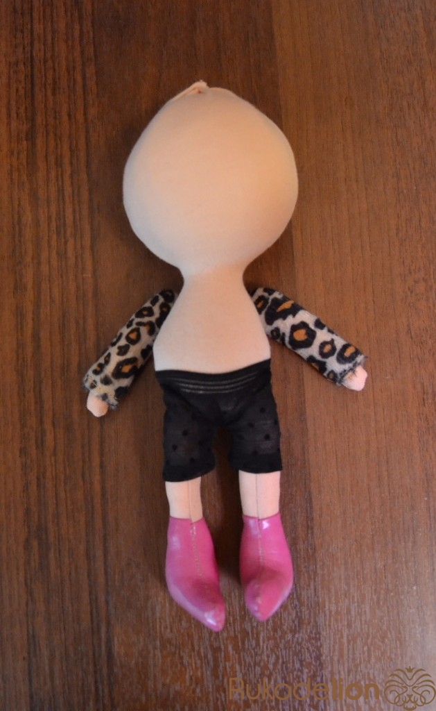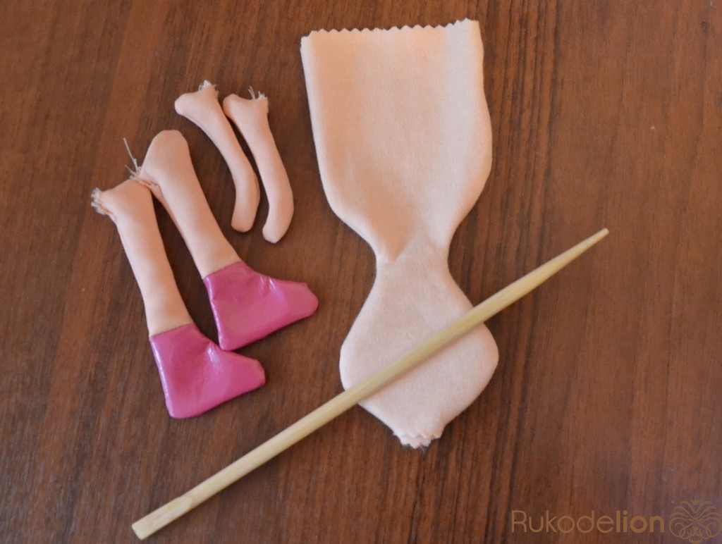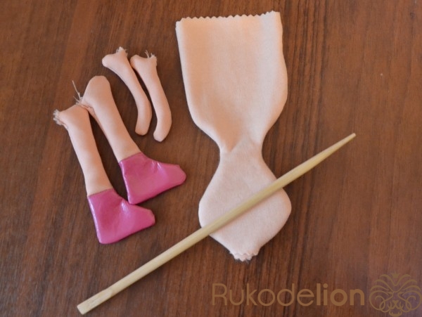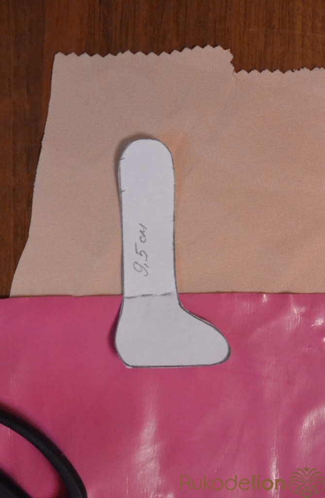 Так же из габардина (либо другого не тянущегося материала) выкраиваем  ручки и ножки. Если Вы не хотите в конечном итоге мучиться с обувью, можно выкроить ножку сразу с ботиночком. Прикладываем и пришиваем к кусочку телесного цвета любой другой (у меня искусственная кожа).