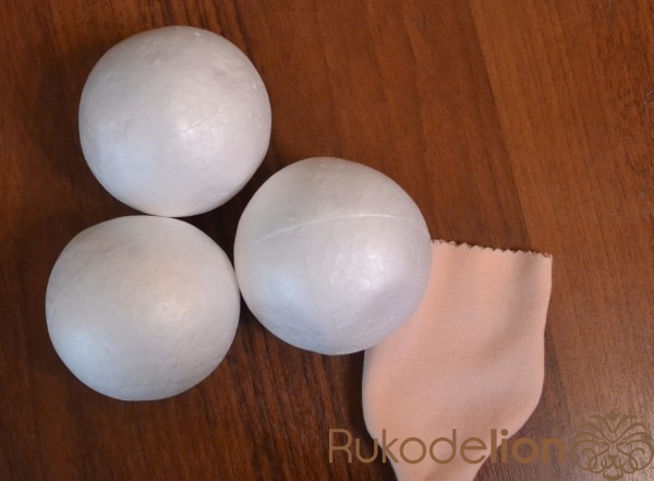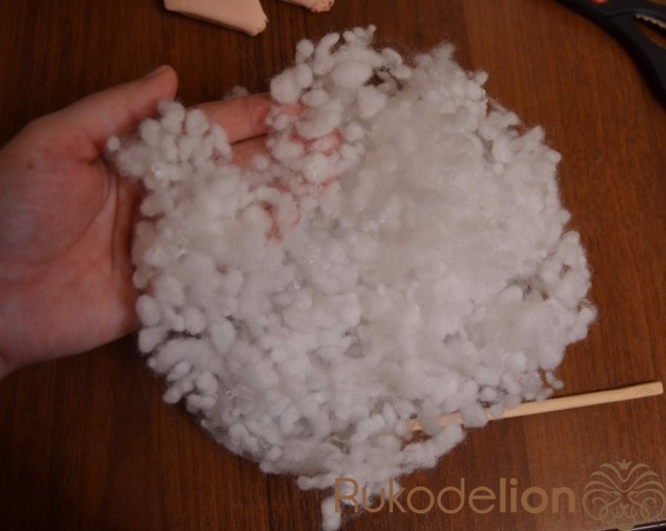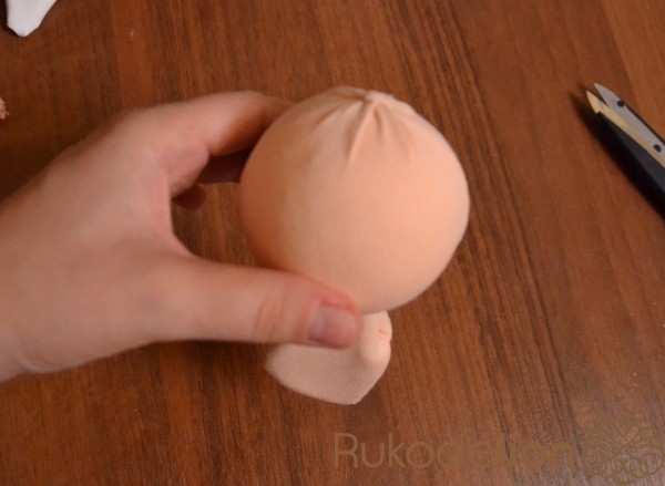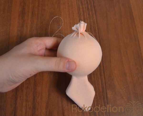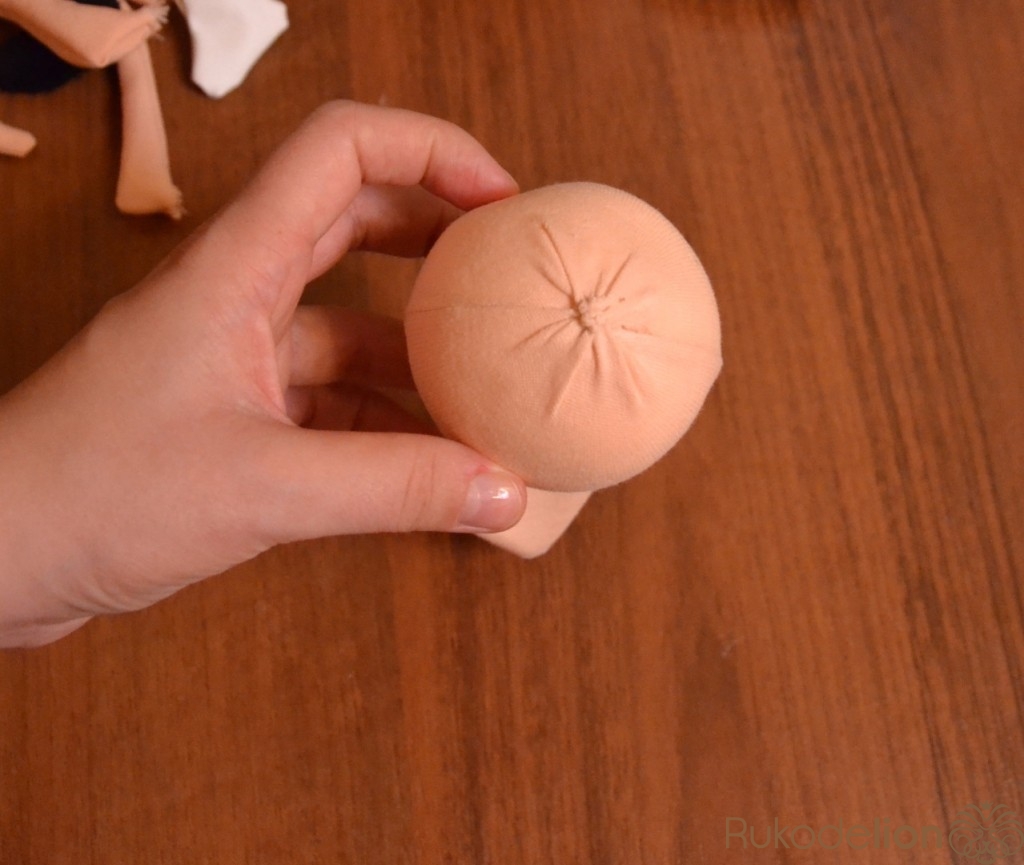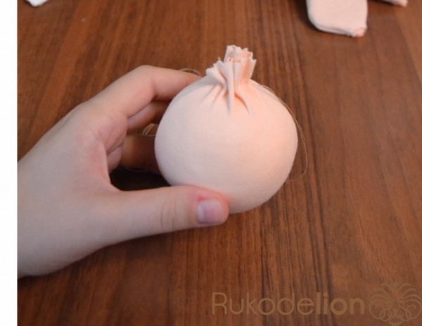 Для головки я использую пенопластовые шарики диаметром в 6 см. Если шарик меньше - оборачиваем его слоем синтепона. Вставляем шарик в отверстие, натягиваем ткань и аккуратно начинаем собирать все в "луковичку". Лишнюю ткань срезаем.