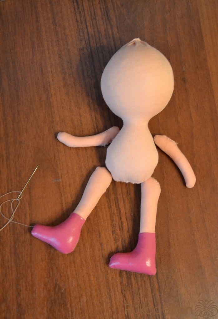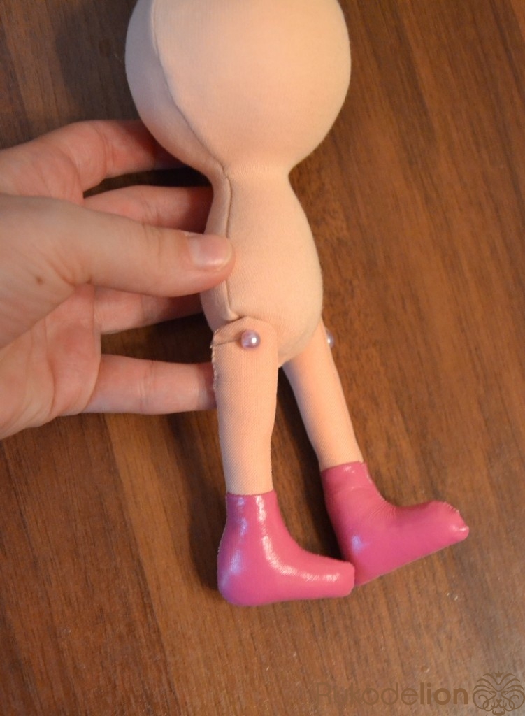Чтобы куколка могла сидеть, ножки пришиваем "пуговичным креплением". Я использую бусинку. Прикалываем ноги к туловищу. Проверяем - все ли ровно? Пробуем во всех положениях ног, т.е. и стоя и сидя должно быть все симметрично. Нитку с иголкой  выводим через туловище. Теперь берем вторую ногу и выводим нитку с иголкой снаружи вовнутрь, через место отметки.
