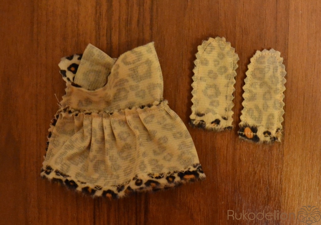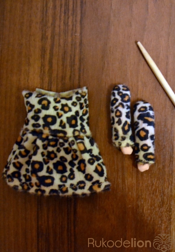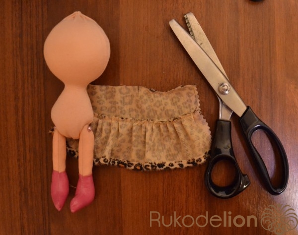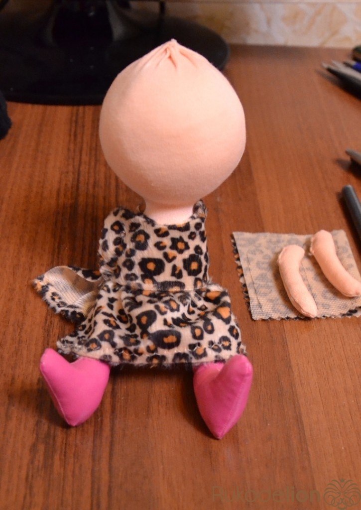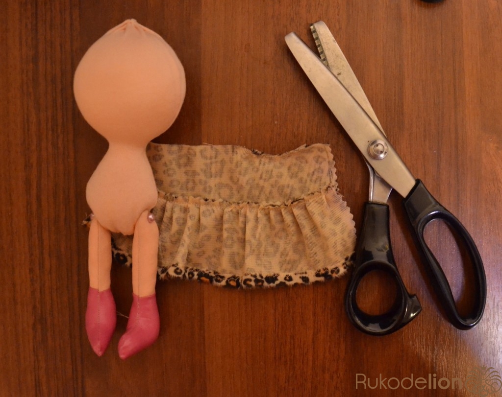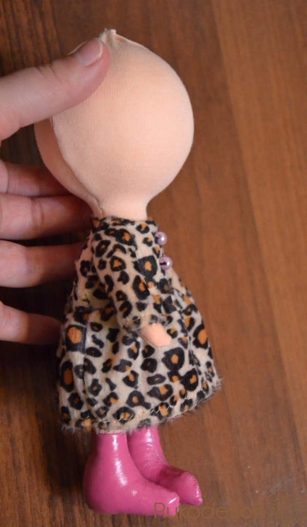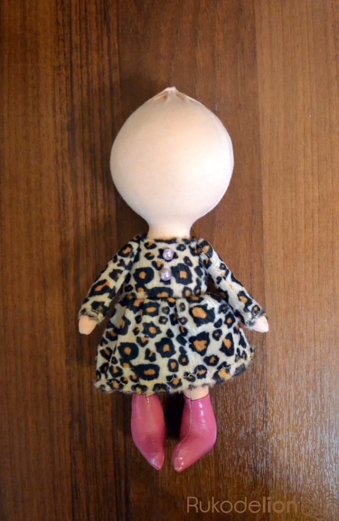 Наше платье будет не съемным. Надеваем его, пришиваем к куколке сбоку (таким образом шов спрячется под ручкой)