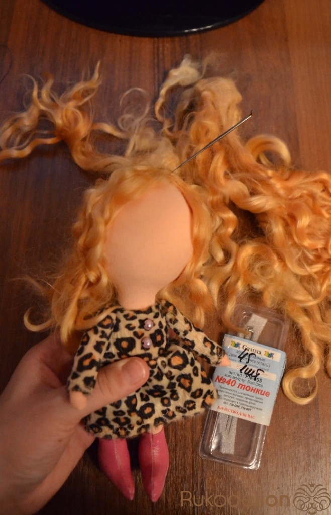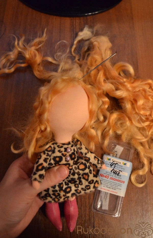 Приступаем к формированию прически. Можно использовать готовые парички, трессы, шерсть для валяния. Я использую козьи локоны. С помощью иглы для валяния (важный момент - иглы должны быть прямыми, обратные будут рвать ткань) приваливаем локоны к головке. Несмотря на тоненький слой ткани на пенопластовом шарике, шерсть держится хорошо.