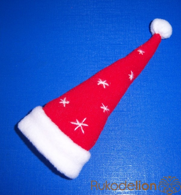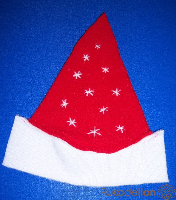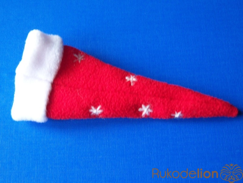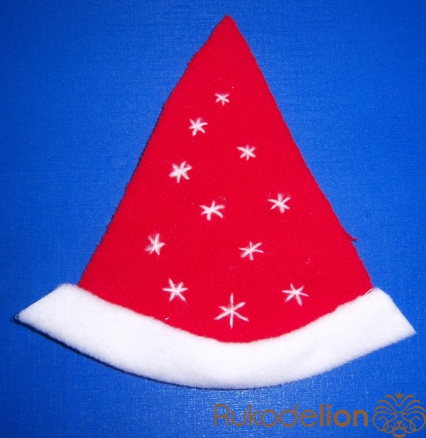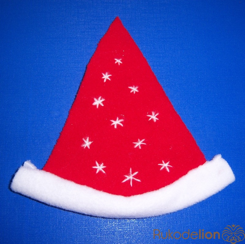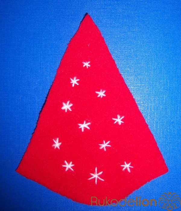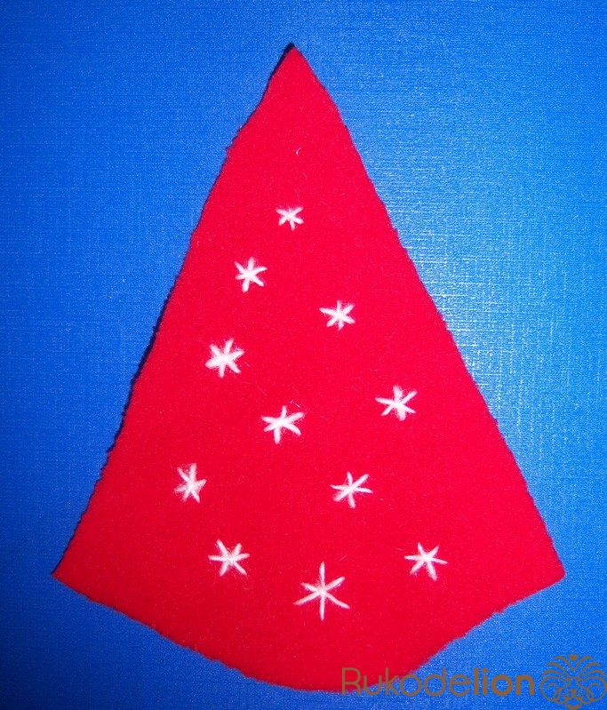 1. Вырезаем основу (можно просто треугольник, в котором основа имеет необходимую длину для охвата шапочки, но мне захотелось вот так :-)))) и украшаем ее снежинками