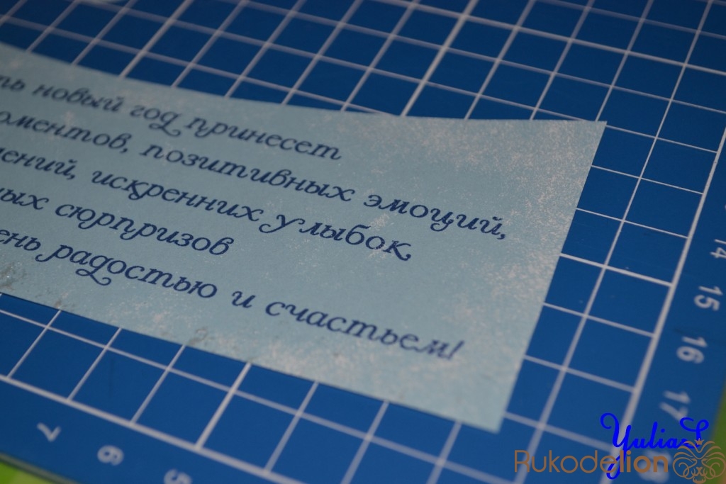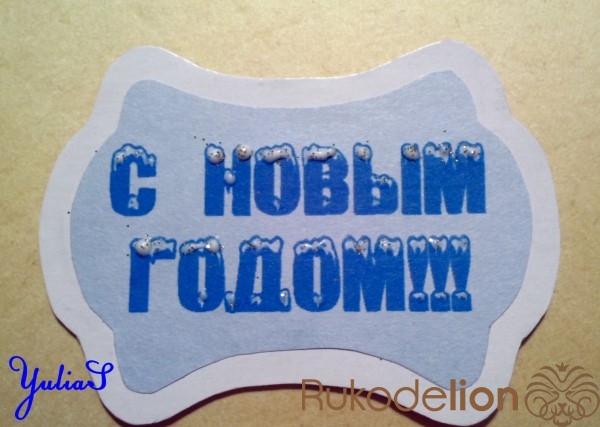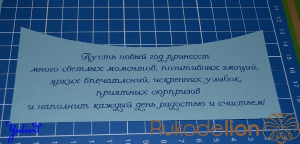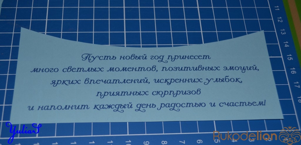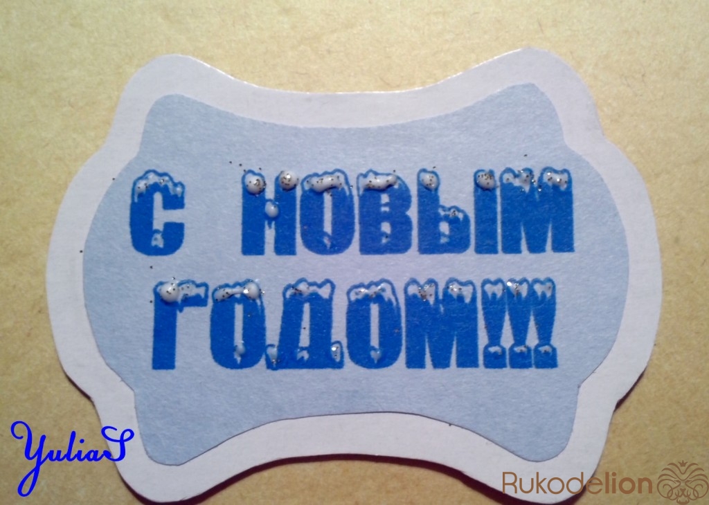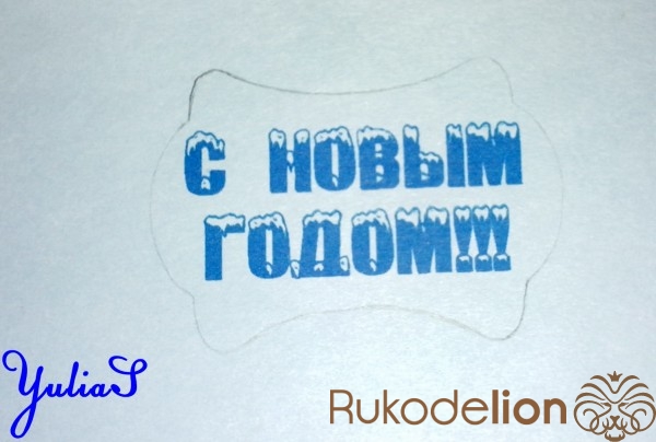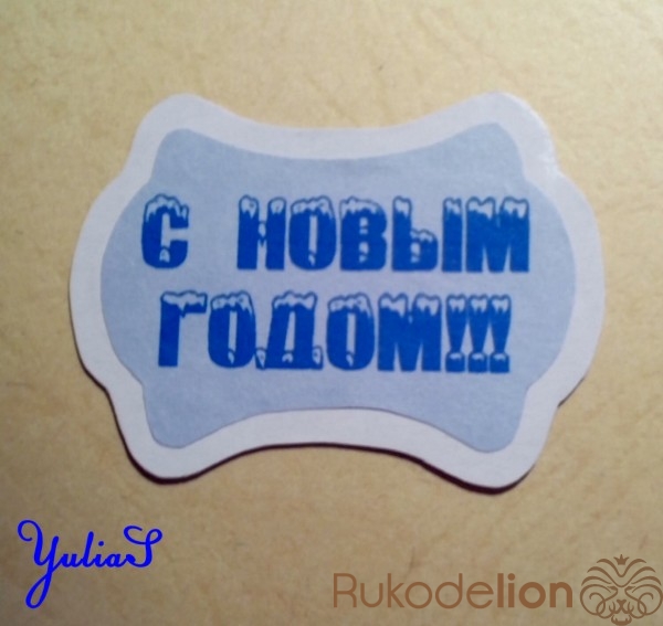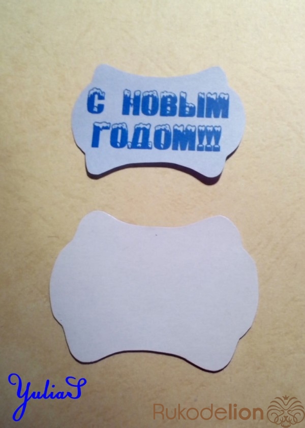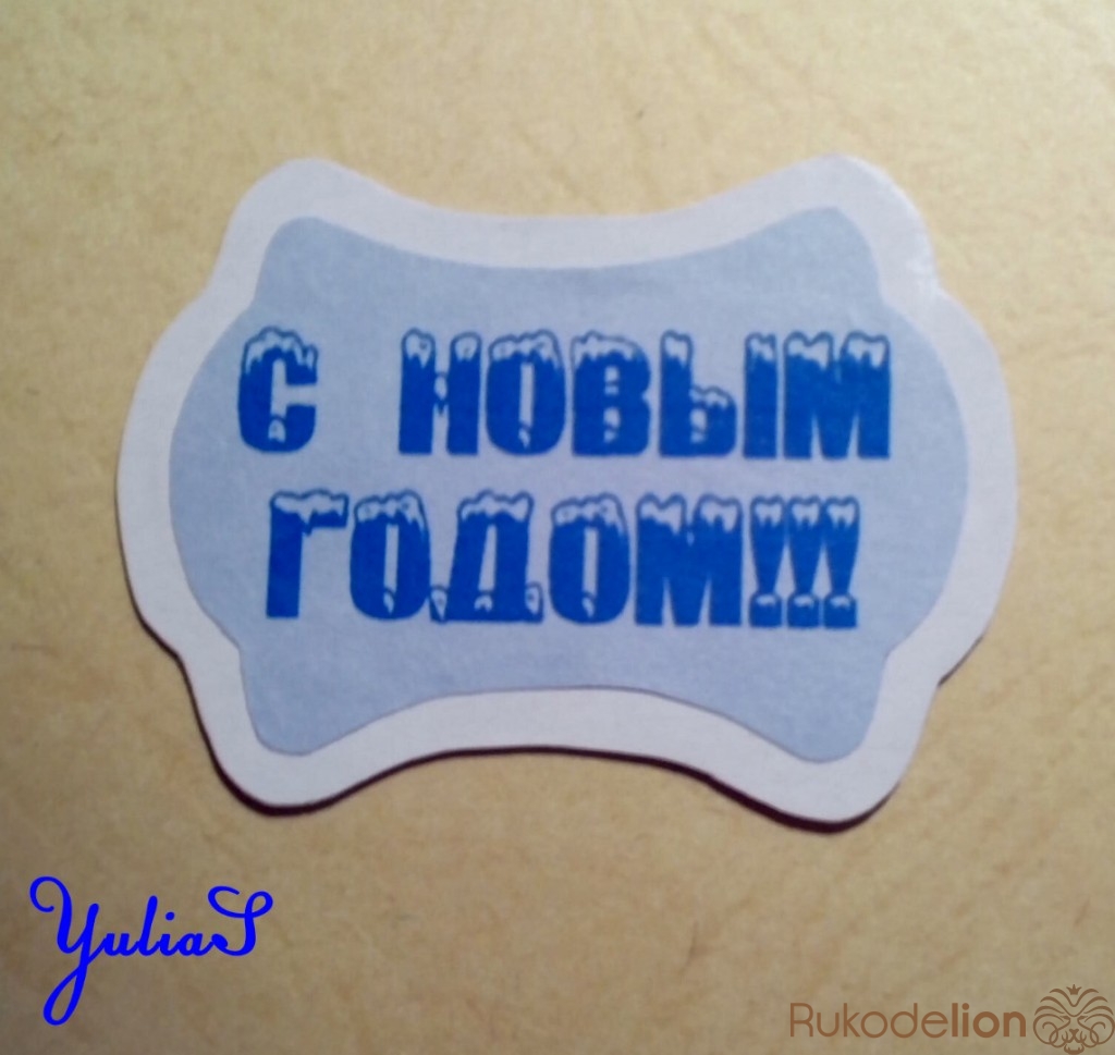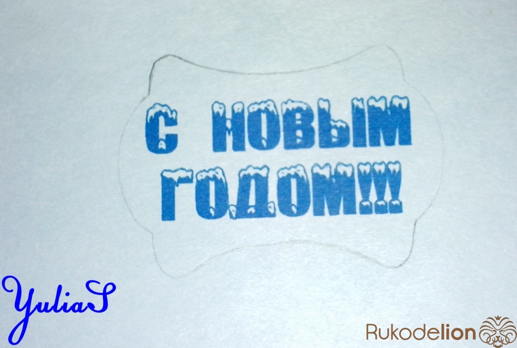 Далее на офисной цветной бумаге распечатываем поздравительную надпись «С Новым годом», либо небольшое пожелание. Для надписи я выбрала шрифт «Занесенный». Вырезаем надпись в виде квадрата, овала, либо небольшой фигурной рамки.