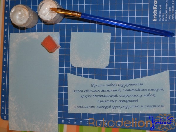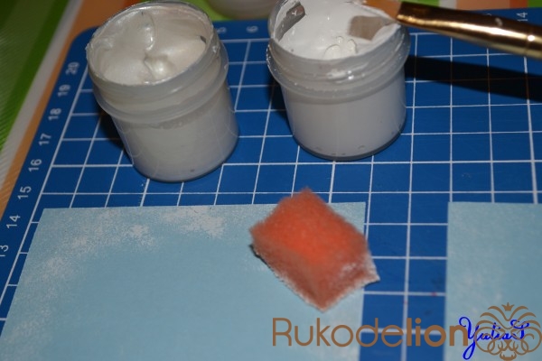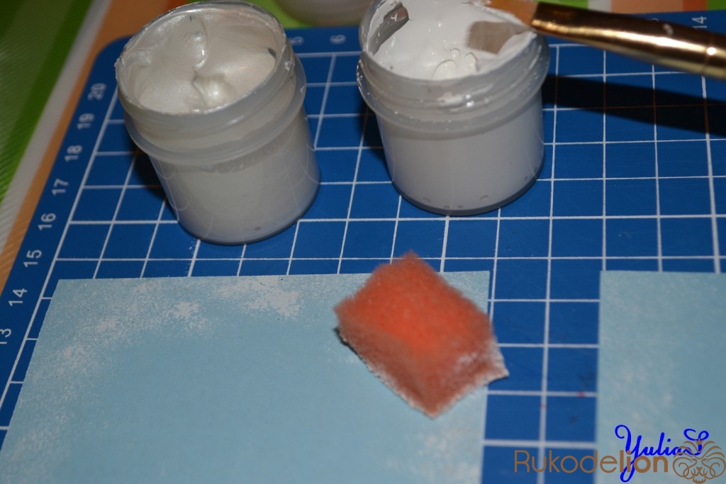 Далее берем акриловые краски и небольшую губку. Обмакиваем губку в белую краску, при необходимости снимаем излишки краски и точечными движениями по краям вырезанных деталей из офисной бумаги наносим рисунок, имитируя иней. Затем точно также поверх белой краски наносим перламутровую, благодаря которой образуется переливающийся блеск. Таким образом окрашиваем только один прямоугольник размером 8,5х16 см, один прямоугольник размером 6,5х5,5 см и скругленный прямоугольник.
