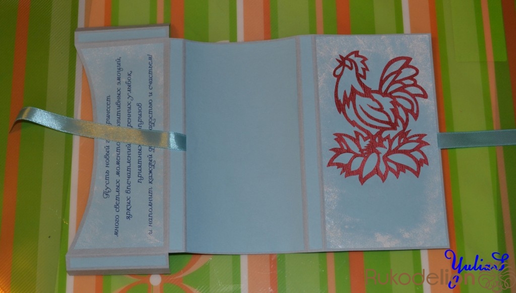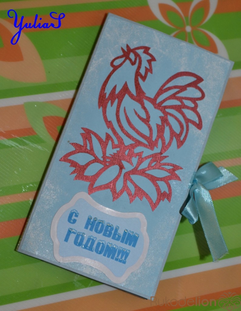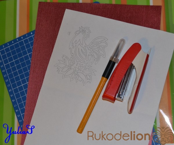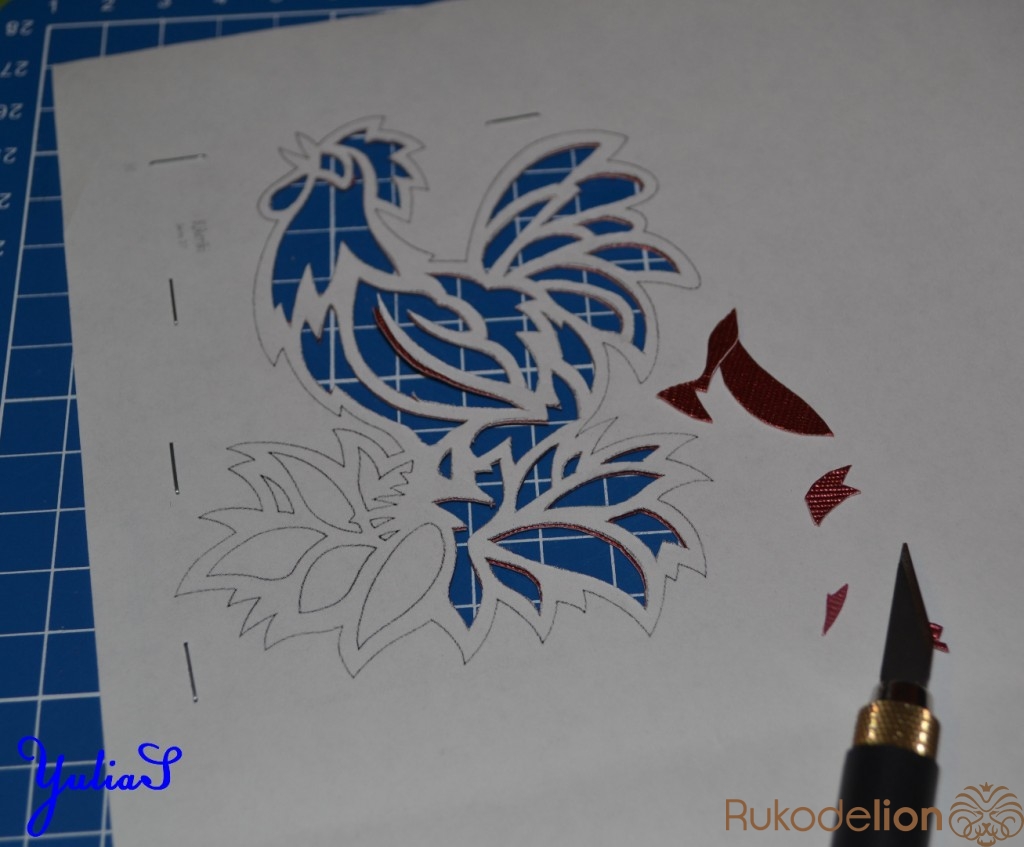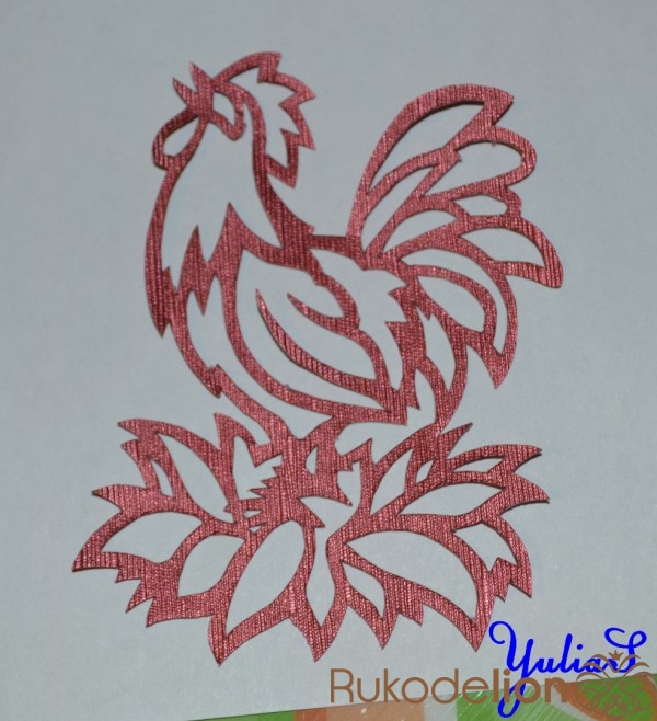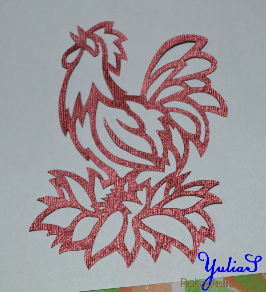 Оформляем верхнюю крышку шоколадницы. Для этого вырезаем картинку в технике вытынанка. Это может быть картинка с елочным шариком, елочкой, Дедом Морозом или любой другой новогодней тематики. Поскольку наступающий 2017 год будет годом огненного петуха, то я взяла картинку с петухом и темно-красную бумагу для скрапбукинга. С помощью степлера скрепляем картинку с бумагой для скрапбукинга. На мате для резки цанговым ножом вырезаем картинку. В результате у меня получился вот такой петушок.