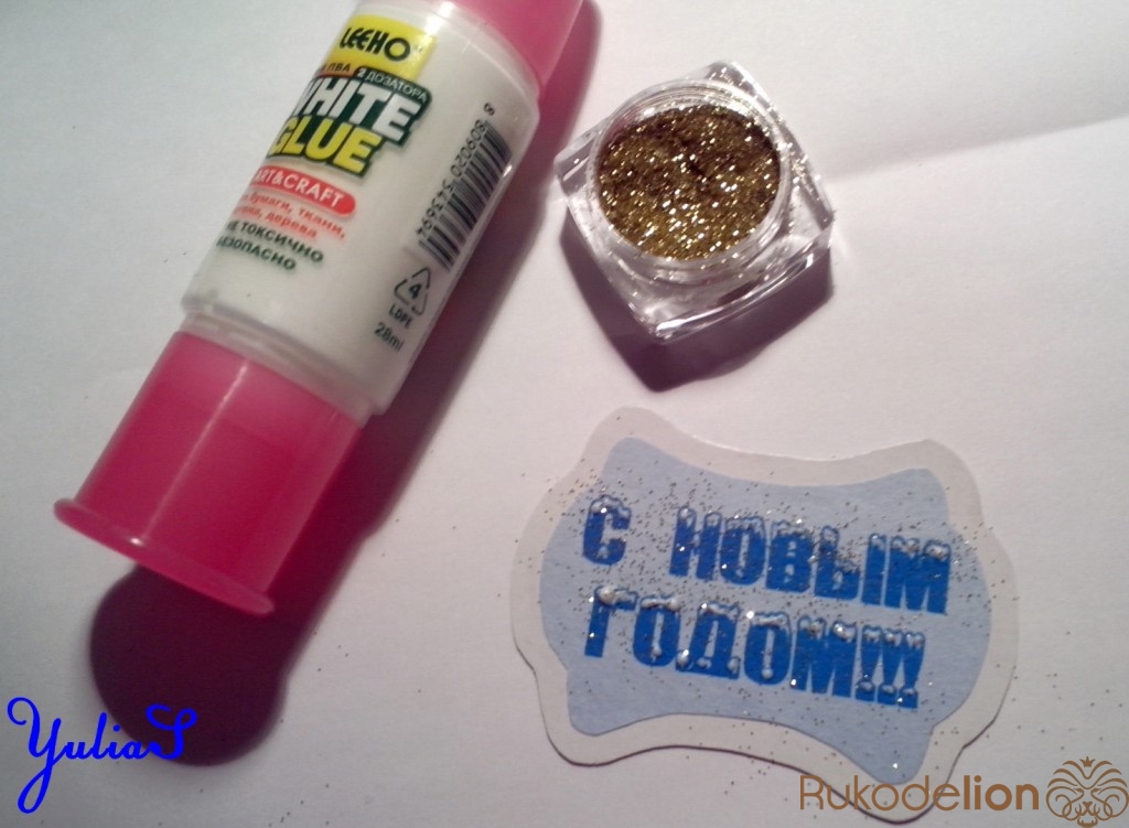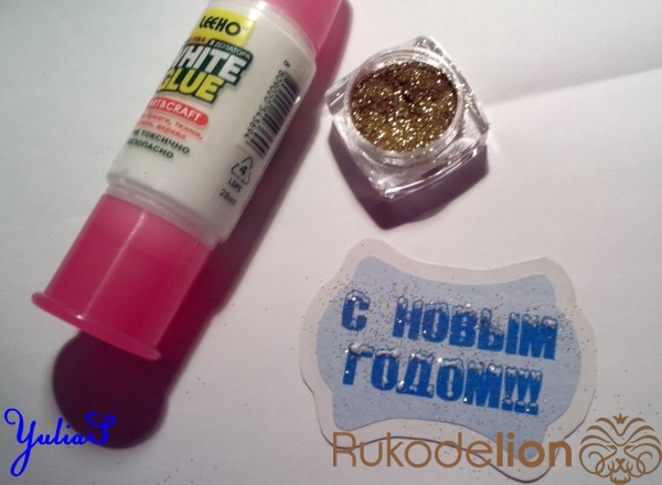 Далее с помощью клея ПВА приклеиваем глиттер на буквы. После высыхания смахиваем излишки блесток. Затем приклеиваем вырезанного петушка и надпись на один из прямоугольников размером 8,5х16 см (будущая крышка шоколадницы).