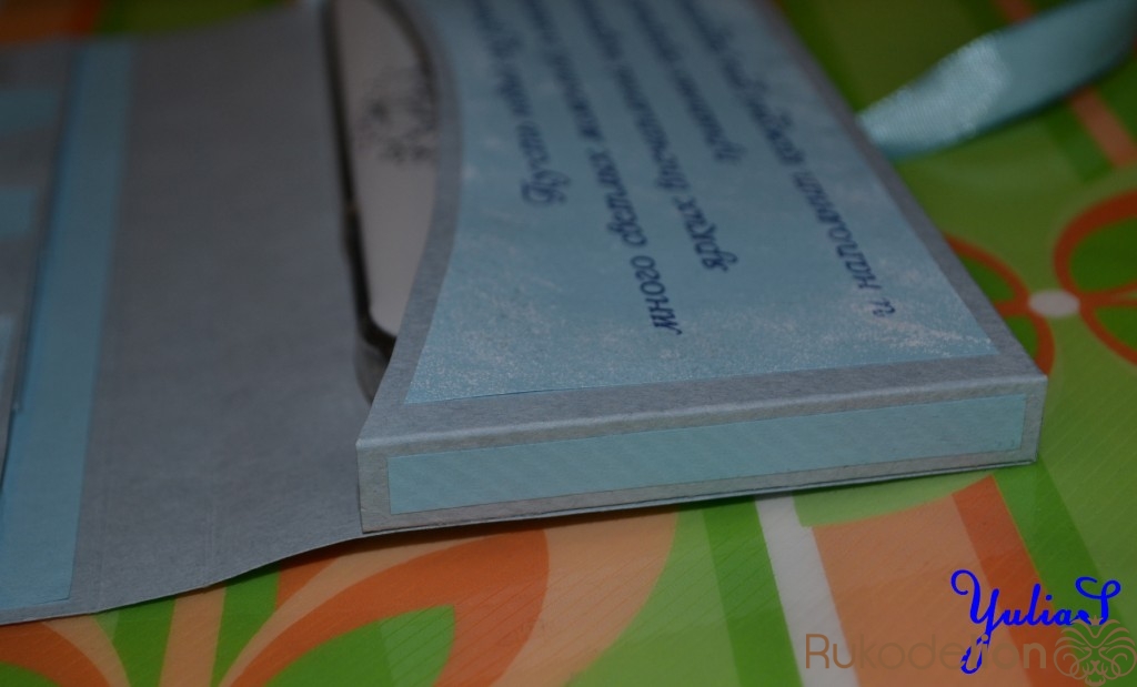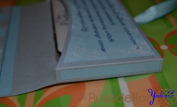 Далее с помощью клея-карандаша приклеиваем заготовки из бумаги к самой шоколаднице, при этом с двух сторон под бумагу приклеиваем атласную ленточку (как показано на фото), и кармашкам для чая. Оставляем заготовку сушиться.