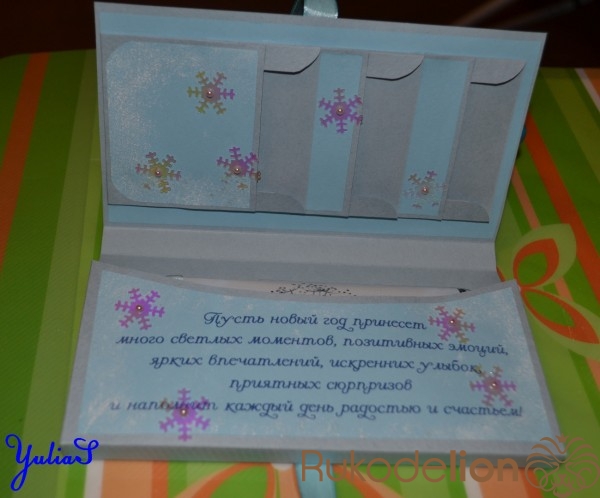 Теперь можно склеить саму шоколадницу. При желании ее можно дополнительно украсить блестками, снежинками, микробисером и т.п. Я использовала переливающиеся снежинки и перламутровые клейкие полубусины.