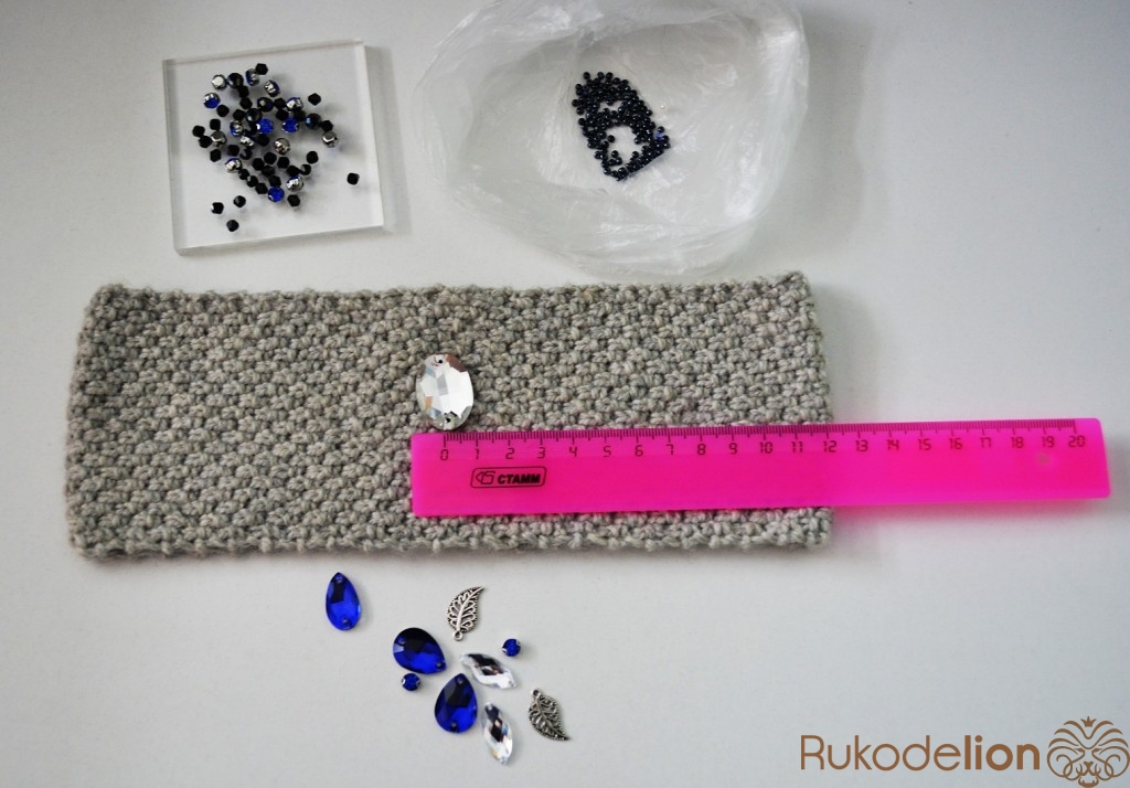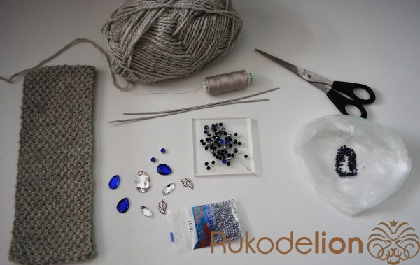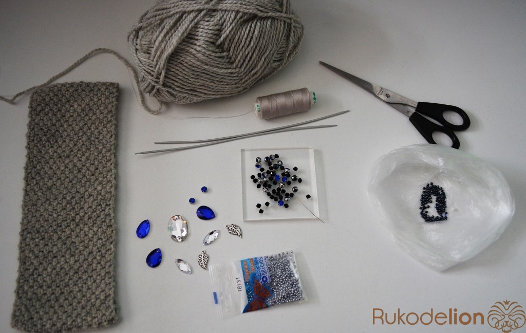 Для такой повязки понадобится пряжа (на ваш вкус и цвет), стразы разных цветов и размеров, бусинки, бисер, иголка и нить, иглы для вязания.