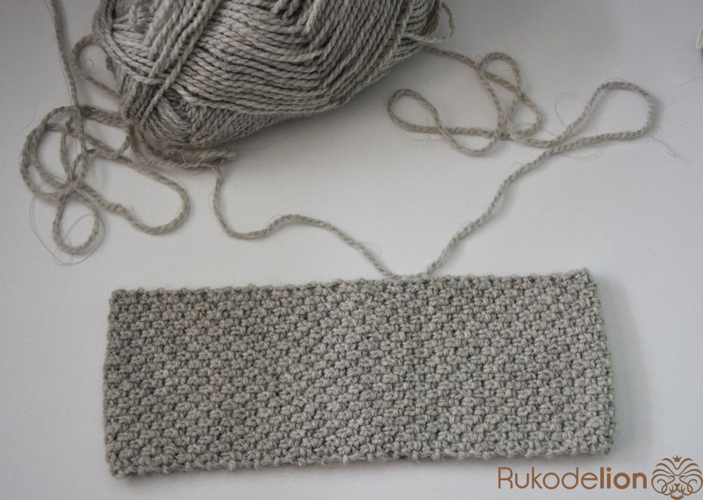 Когда повязка готова, складываем концы вместе и связываем их крючком или сшиваем иголкой и ниткой.