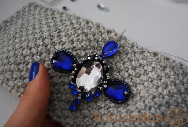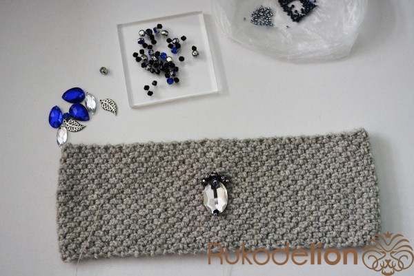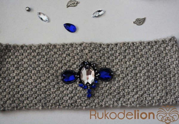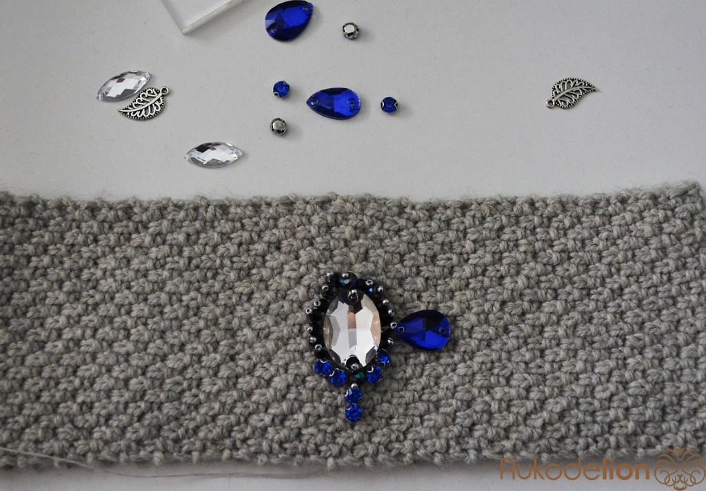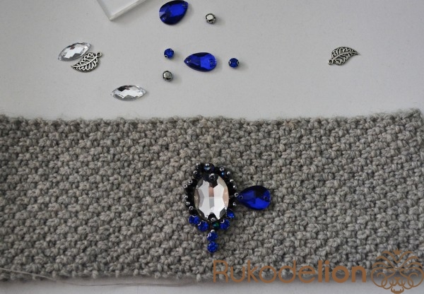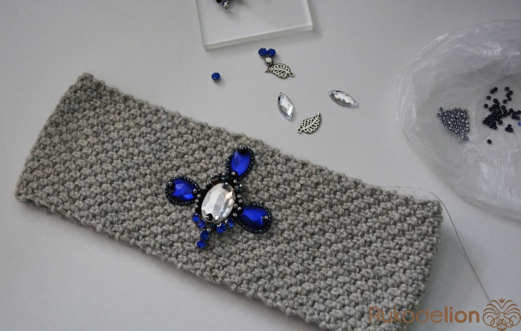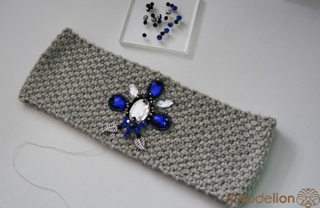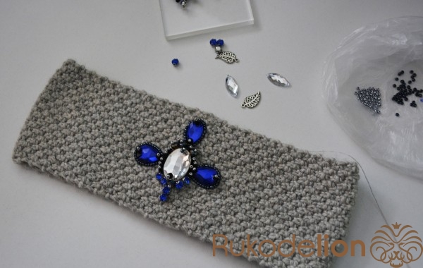 Находим середину повязочки и пришиваем крупный овальный камень.