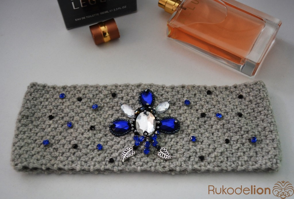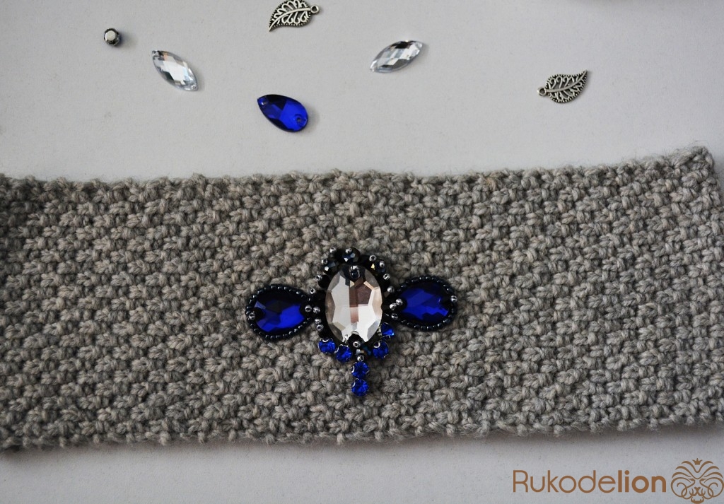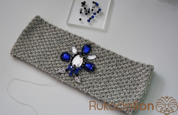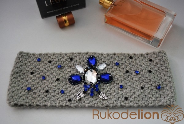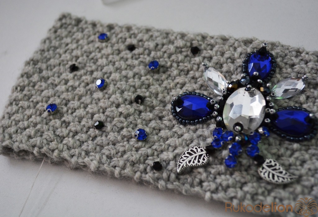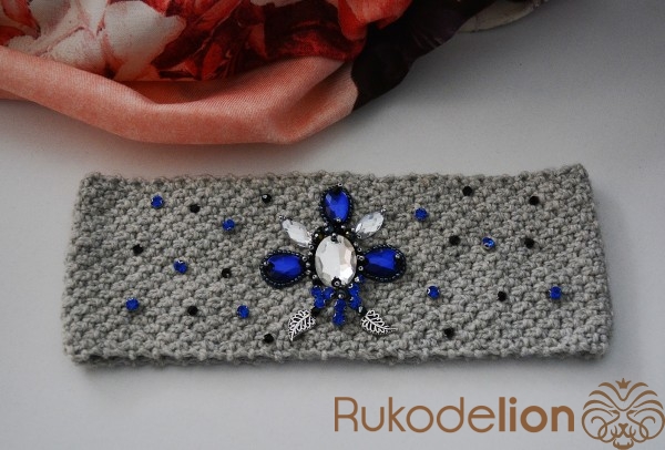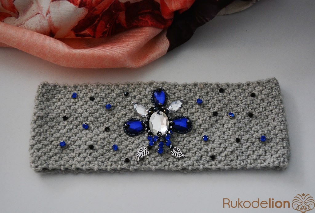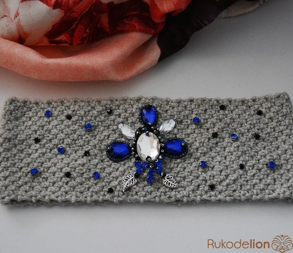Вязаная повязка на голову расшитая стразами и бусинками