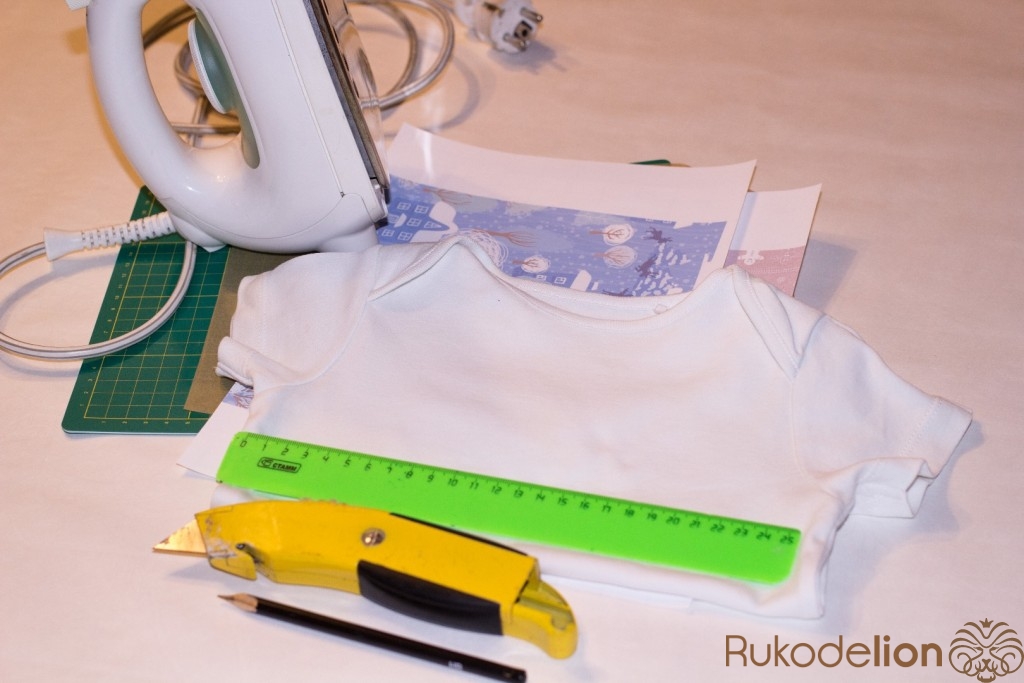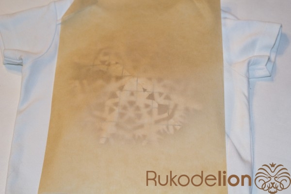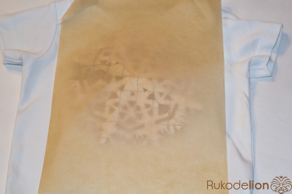 После этого кладем бумагу изображением вниз на предварительно разглаженную поверхность футболки.