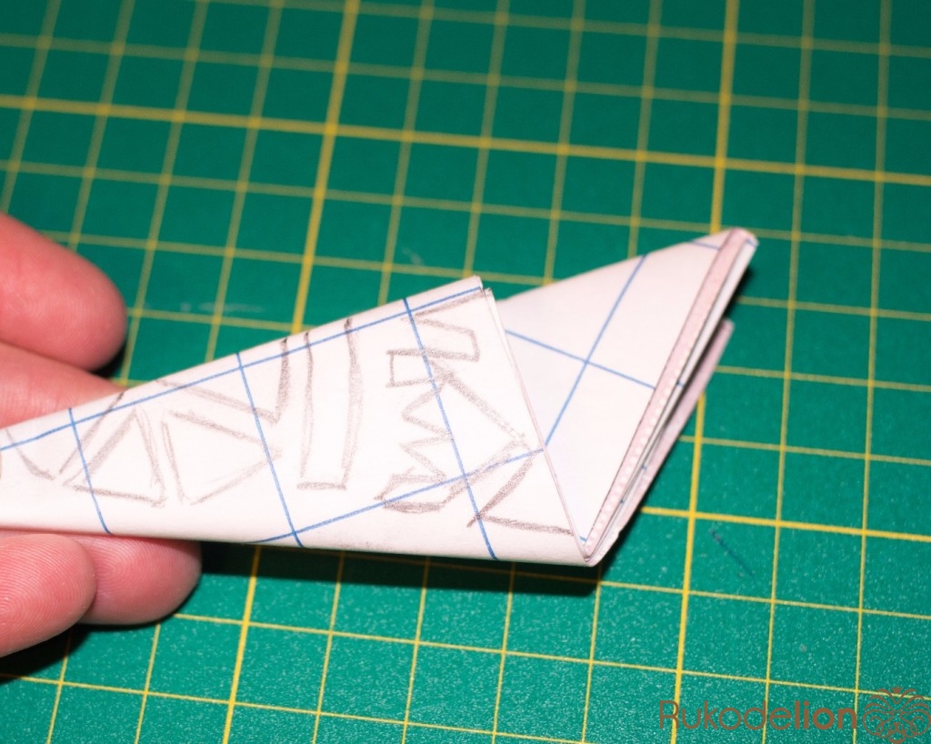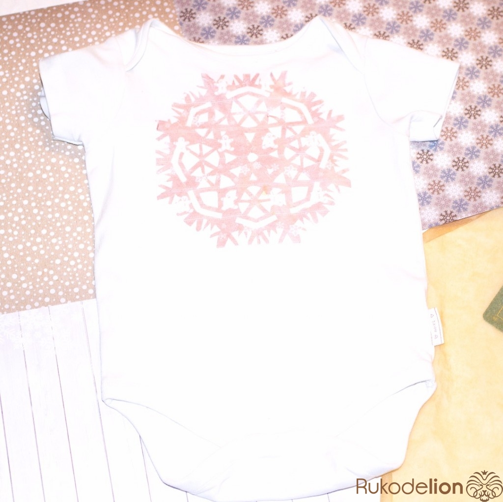 Распечатываем на термотрансферной бумаге понравившуюся картинку. Я вырезала снежинку примерно из половины формата А4, но думаю, что лучше еще поменьше выбрать размер. Складываем бумагу по схеме. Рисуем карандашом шаблон снежинки.