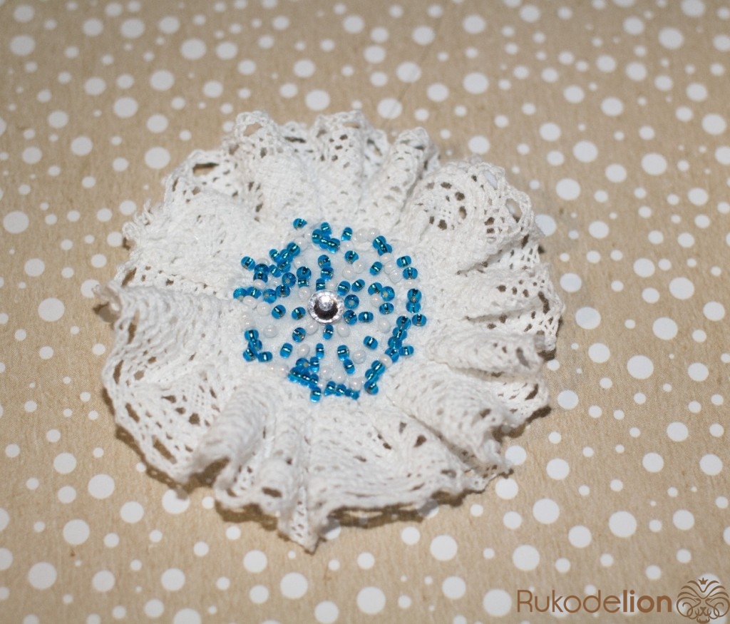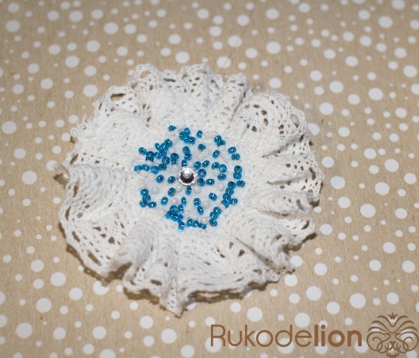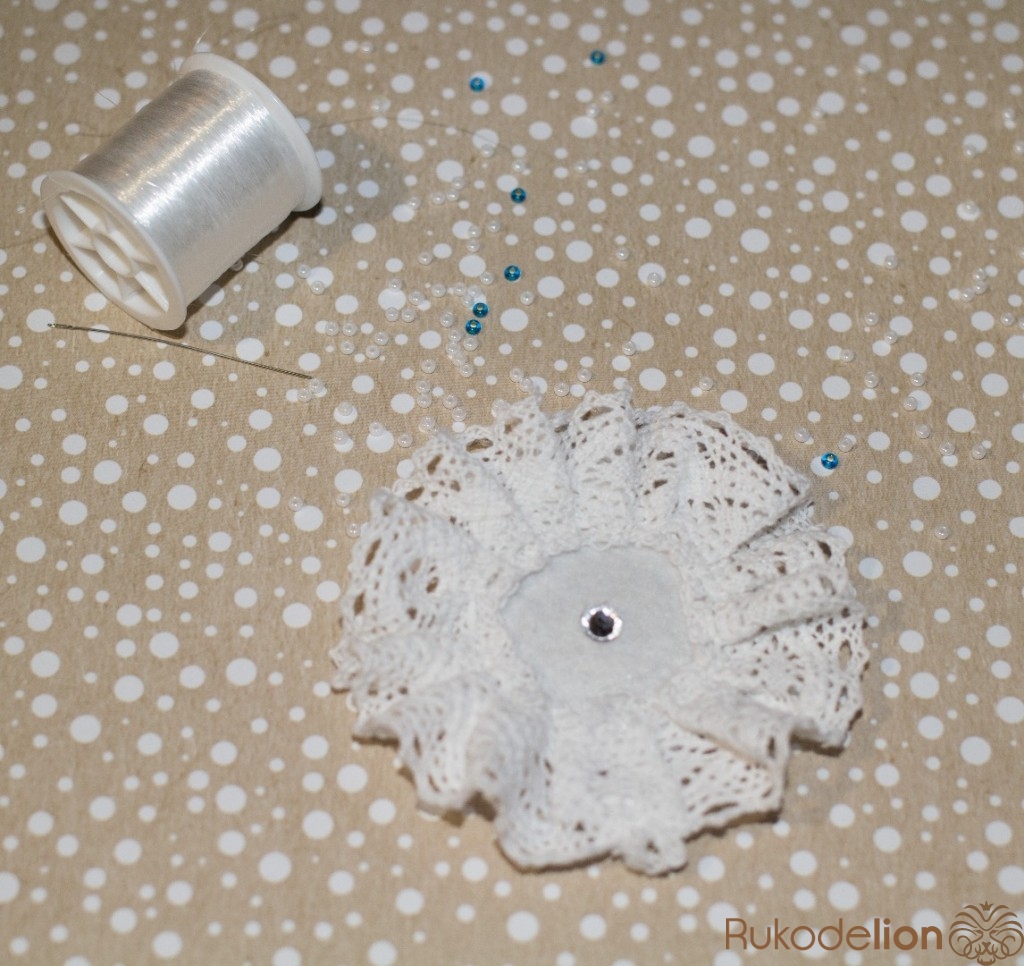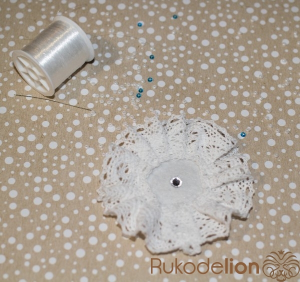 Берем один кружочек и обшиваем его кружевом, которое произвольно присобираем по кругу. Я пришиваю мононитью, очень удобно, она прозрачная и получается аккуратно. Кстати, у меня всегда была проблема с завязыванием узелка и мне пришло в голову опалять край зажигалкой, кончик становится толстым и не нужно делать узелок. Наверняка такой способ уже существует, что же, хорошие мысли бывает сходятся.