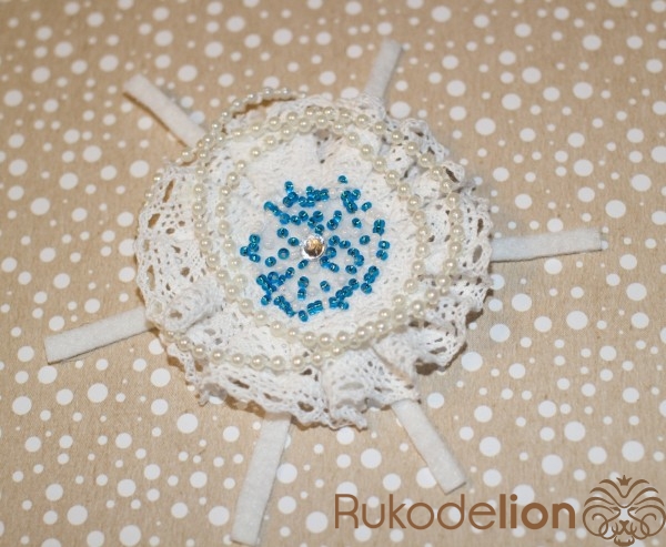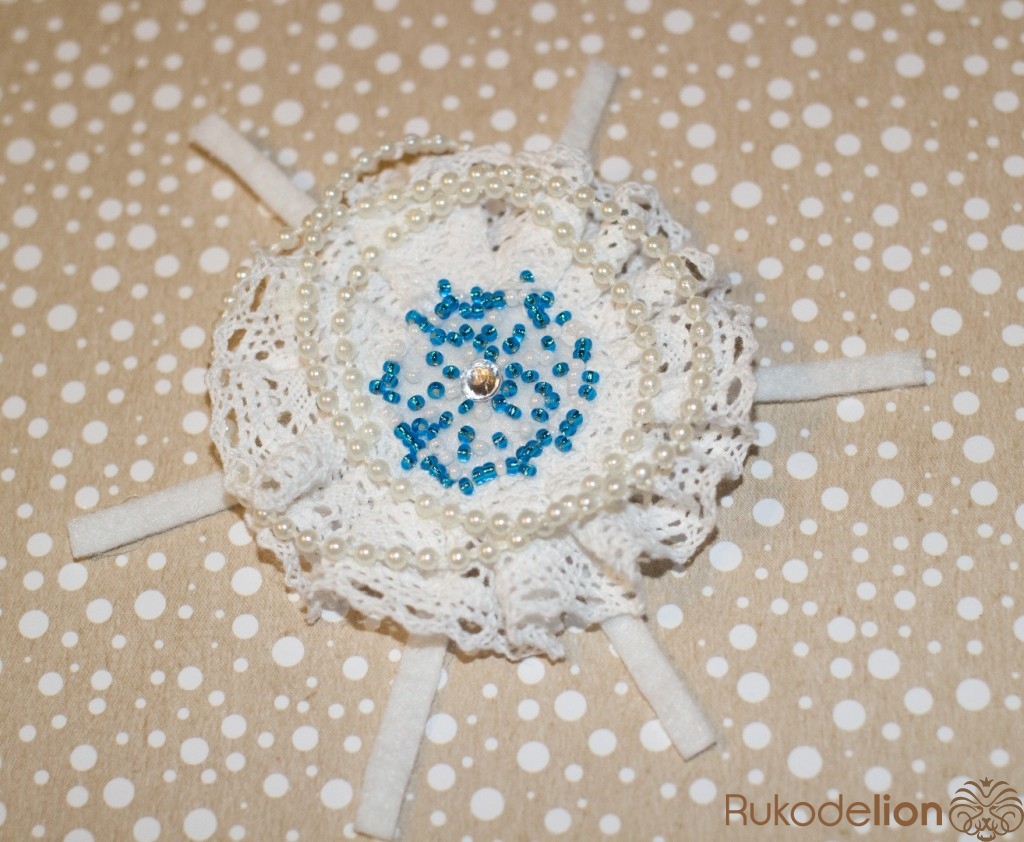 Теперь займемся украшением середины снежинки. У меня завалялась блестящая бусинка и я решила поместить ее в центр снежинки, приклеила термоклеем. Затем хаотично пришьем бисер, набирая на мононить по 1-5 шт бисеринок.