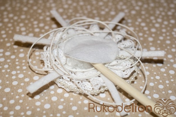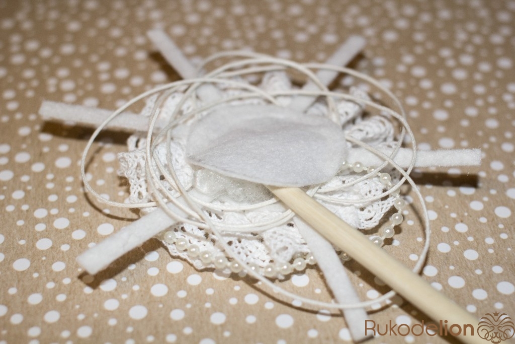 Украсим лицевую сторону нитью с бусинками, аккуратно работаем термопистолетом. На обратную сторону приклеим полоски фетра, сложенные в форме снежинки, а также произвольно сложенную вощеную нить, это придаст воздушности конструкции.