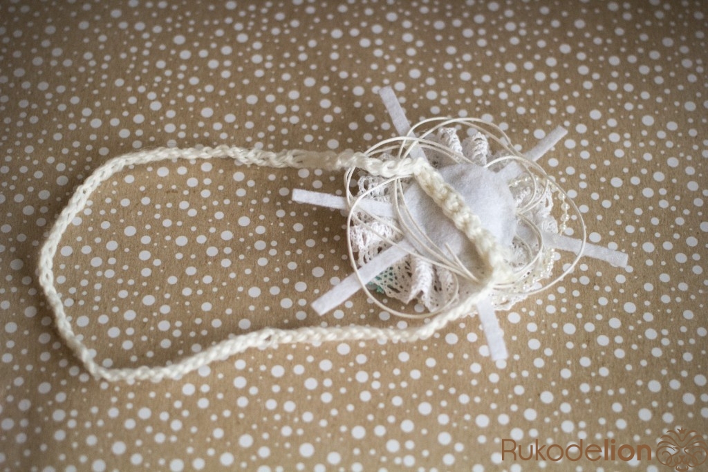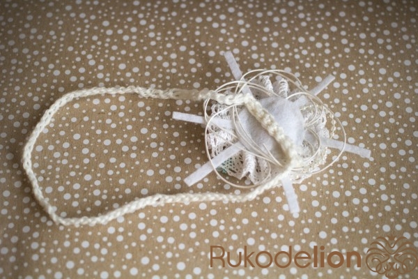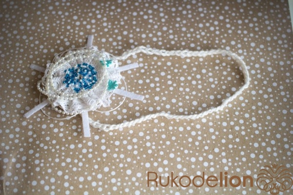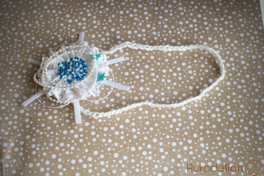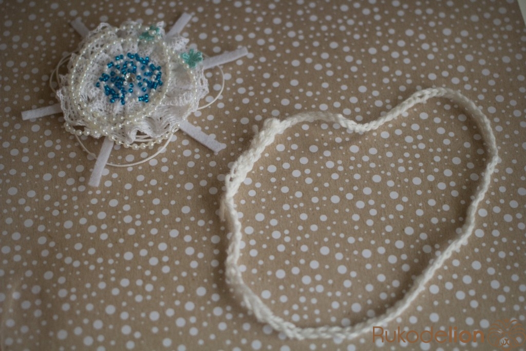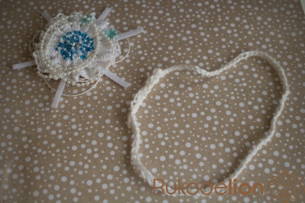 Теперь берем крючок и нитки и набираем цепочку из воздушных петель, равную обхвату головы, соединяем в круг и провязываем столбиком без накида 3-4 см, чтобы создать большую поверхность для соединения снежинки с повязочкой.