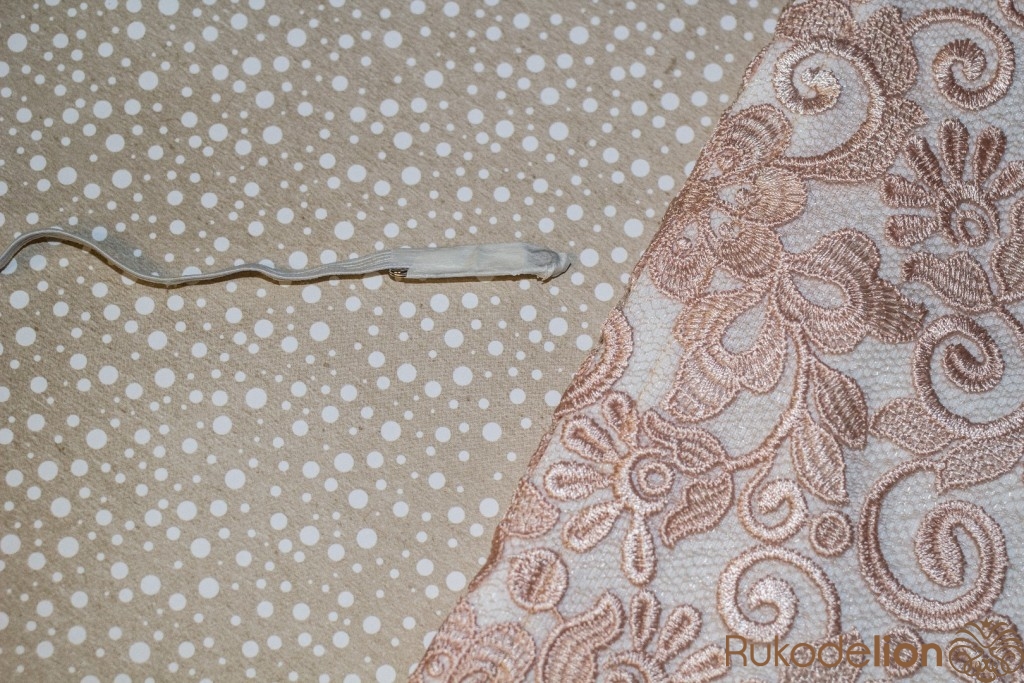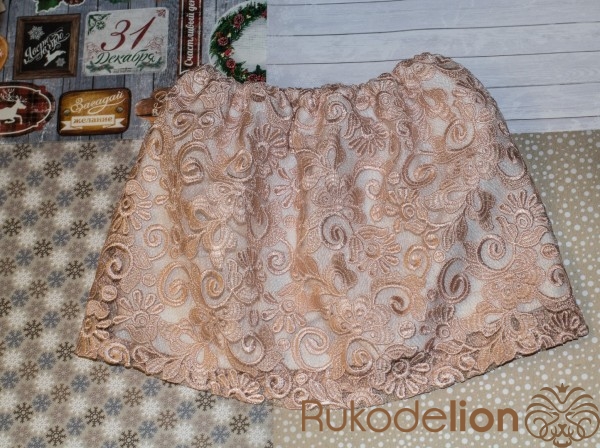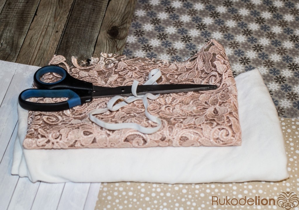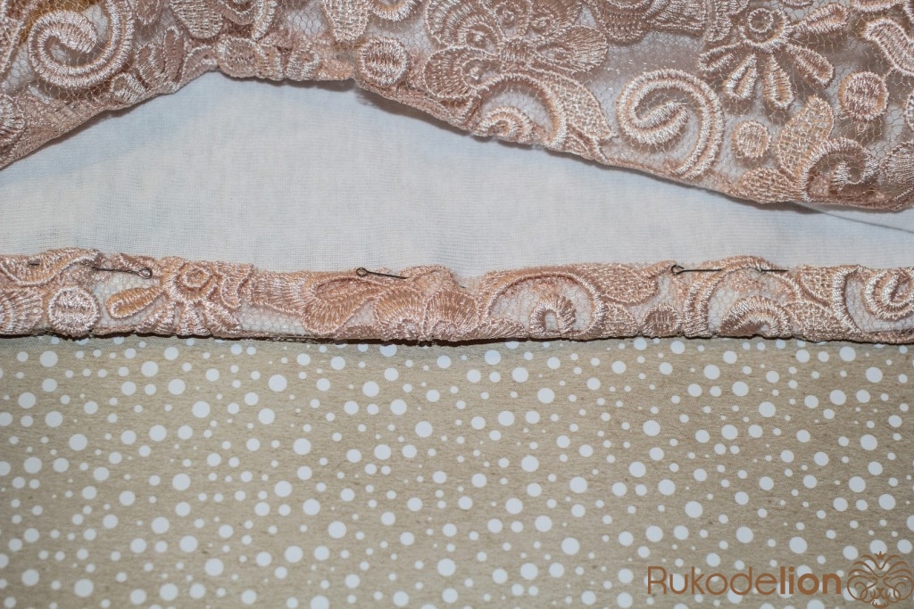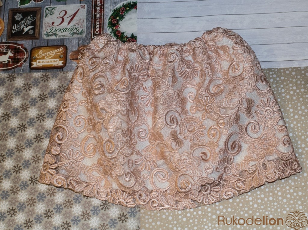 Отрезаем из кружева и трикотажа прямоугольники, длина 25см+ 5см на подгибки, ширина 80см. Это размеры для девочки двух лет. Ширины в 80 см достаточно, так мы сохраняем рисунок кружева, он не прячется в излишних складках и чтобы резинку от излишних складок не повело в разные стороны. Сшиваем наши прямоугольники по бокам. Утюжим швы. Затем вставляем трикотаж в кружево лицо к изнанке и сшиваем их вместе. Утюжим шов.