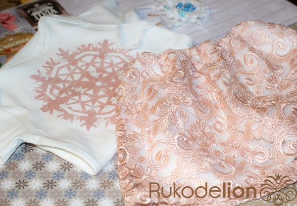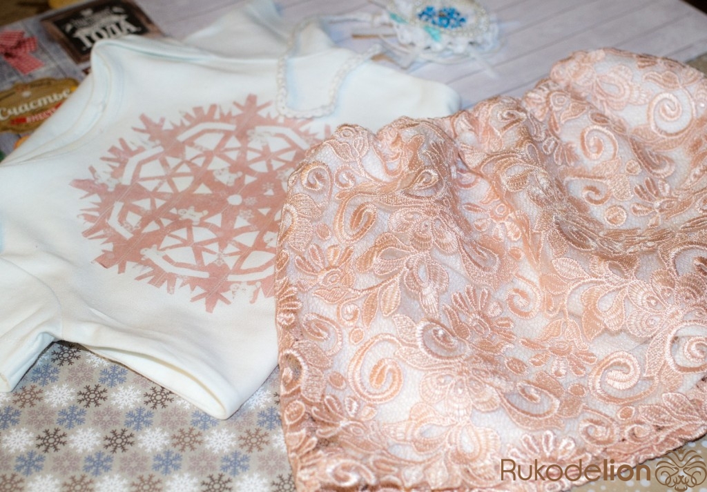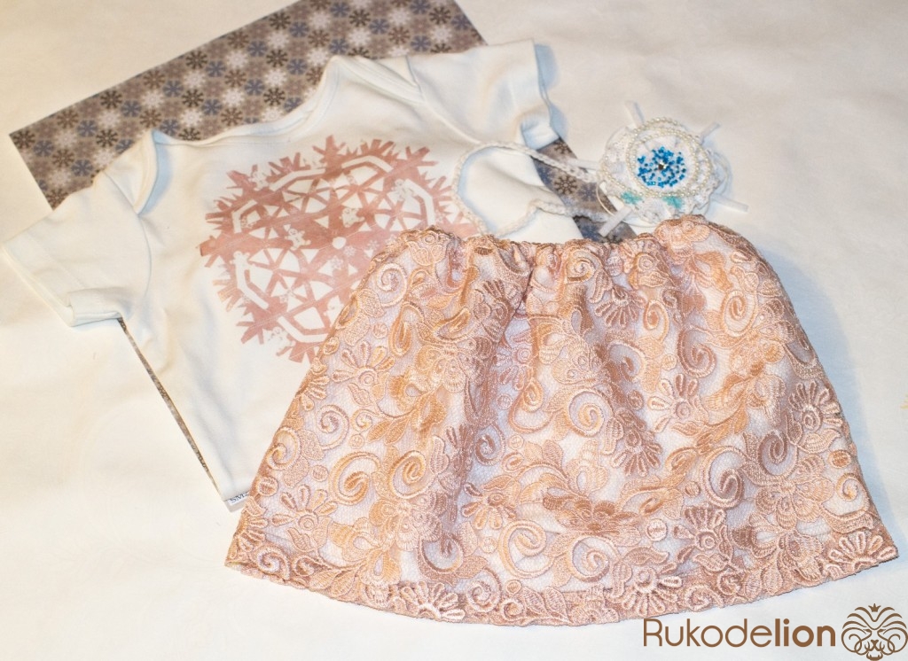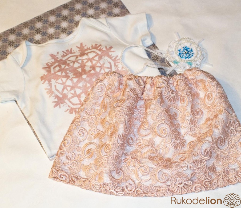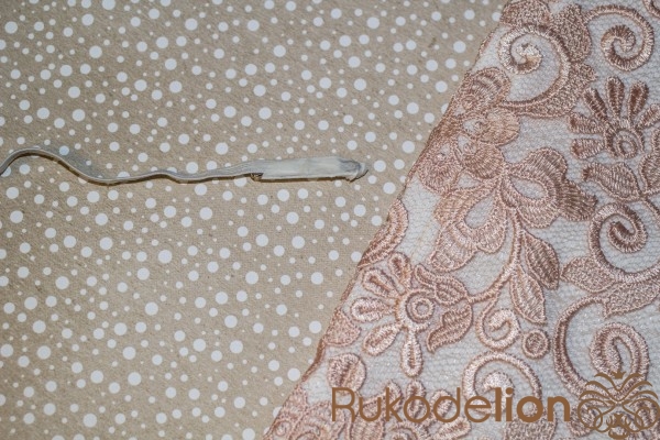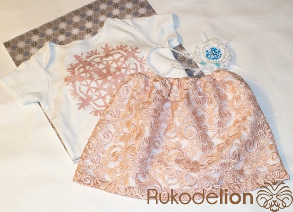 Отрезаем из кружева и трикотажа прямоугольники, длина 25см+ 5см на подгибки, ширина 80см. Это размеры для девочки двух лет. Ширины в 80 см достаточно, так мы сохраняем рисунок кружева, он не прячется в излишних складках и чтобы резинку от излишних складок не повело в разные стороны. Сшиваем наши прямоугольники по бокам. Утюжим швы. Затем вставляем трикотаж в кружево лицо к изнанке и сшиваем их вместе. Утюжим шов.
