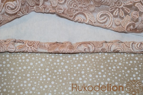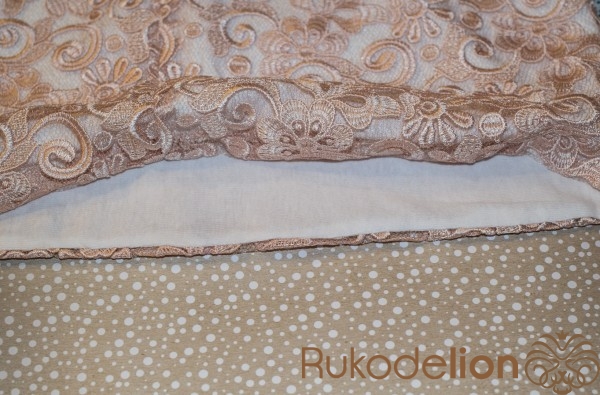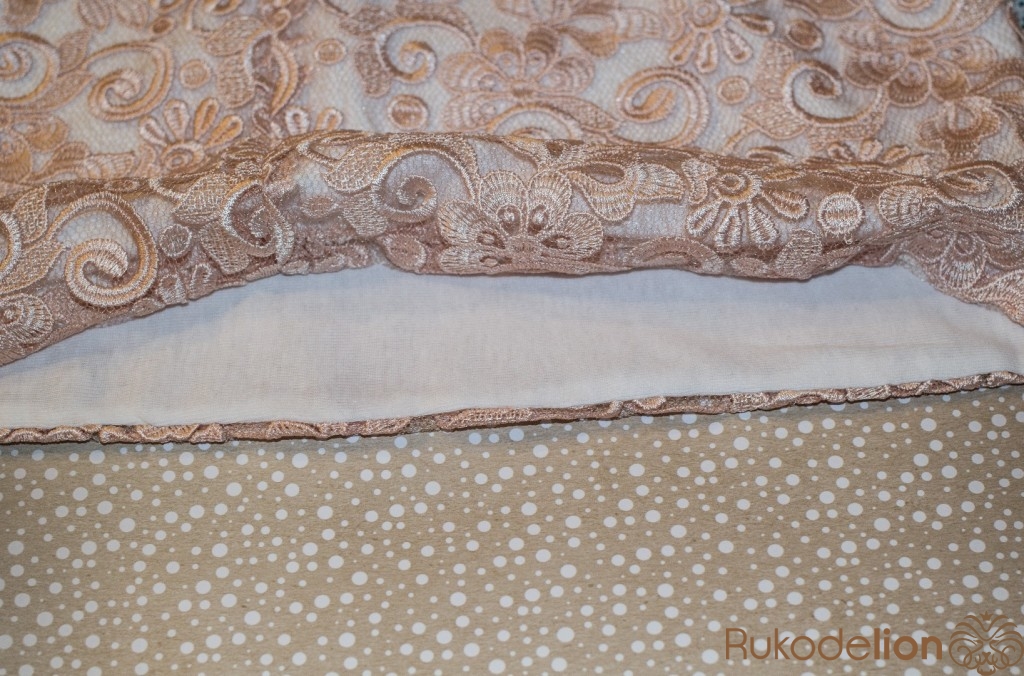 Теперь подшиваем край кружева. Смотрим, может наш трикотаж нужно подрезать, чтобы он не был виден и тоже подшиваем. Утюжим швы. Любуемся!
