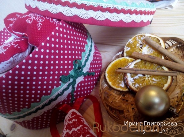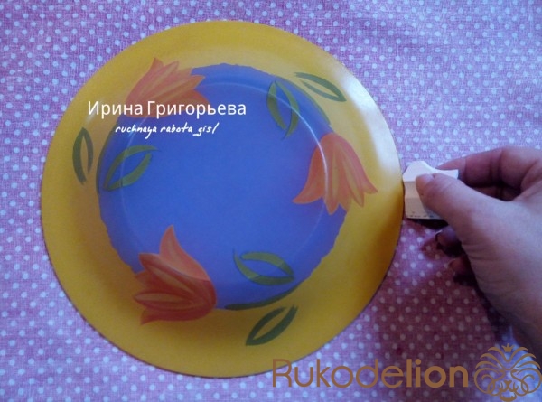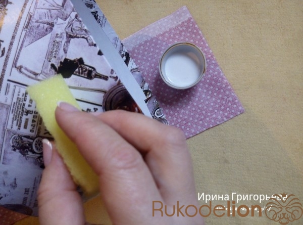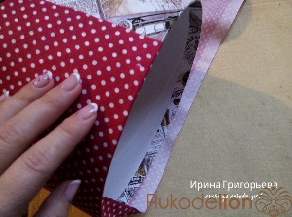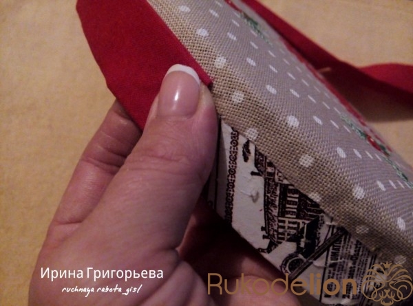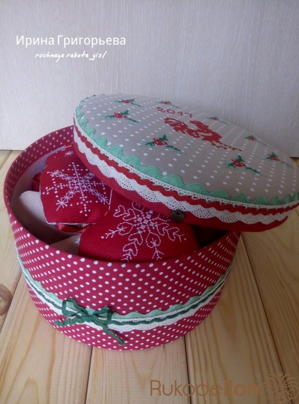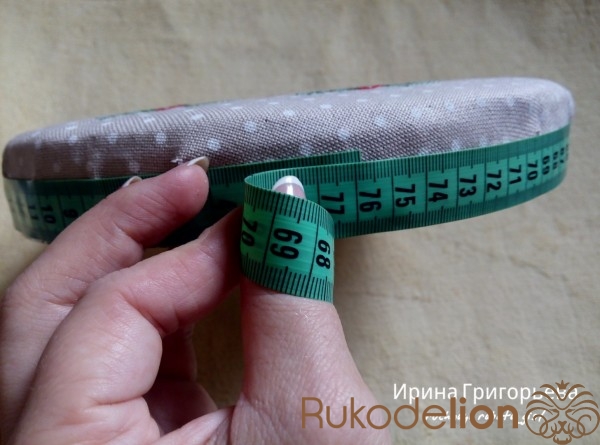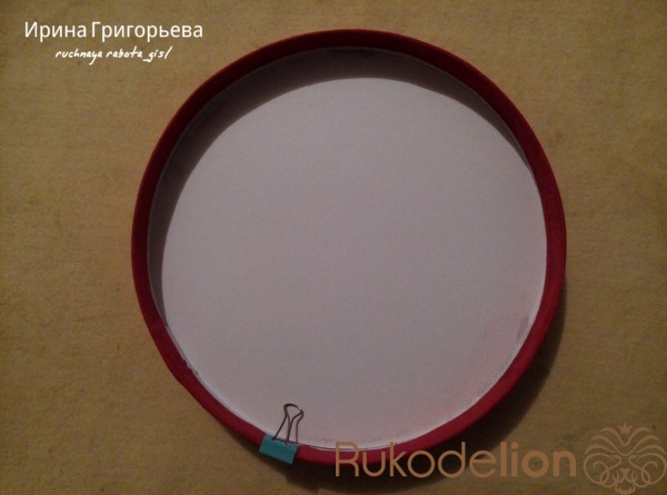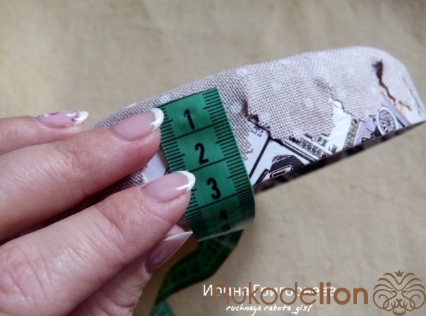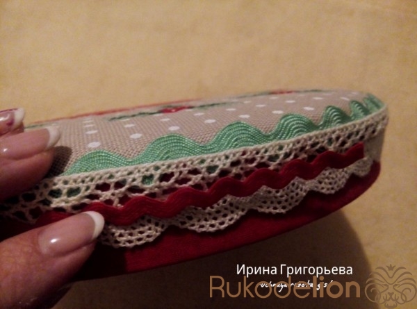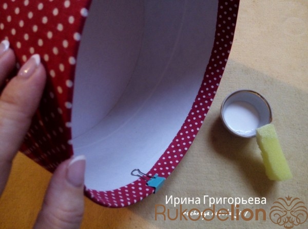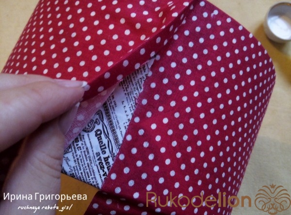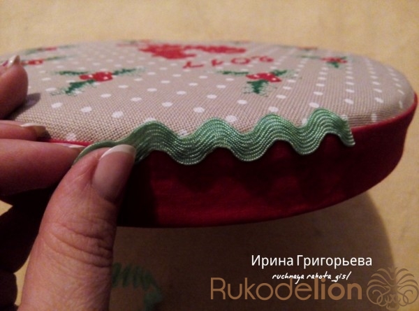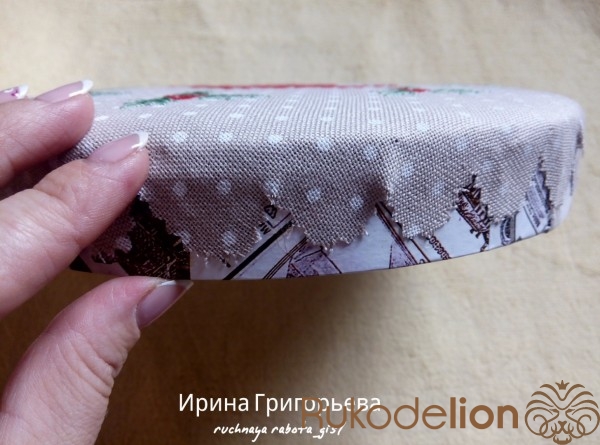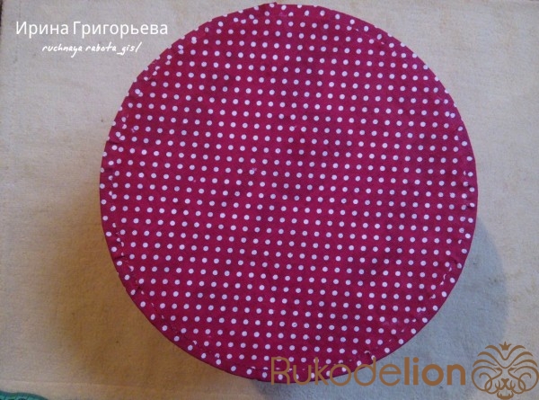 Для того, чтобы закрыть наружное дно коробки, вырежьте из ткани круг чуть меньшего диаметра самого дна (я использовала для этой цели тарелочку). Смажьте дно клеем ПВА и приклейте круг из ткани. В данном случае края ткани не нужно подгибать, так как клей достаточно прочно закрепляет её и нити не будут осыпаться.