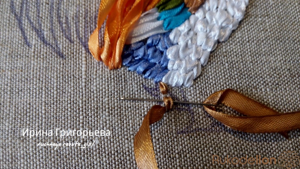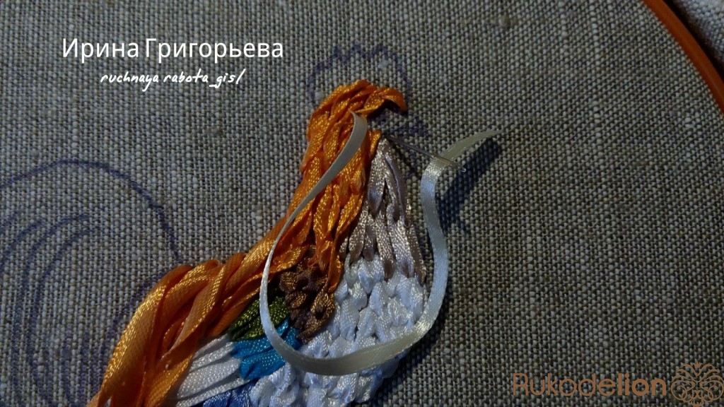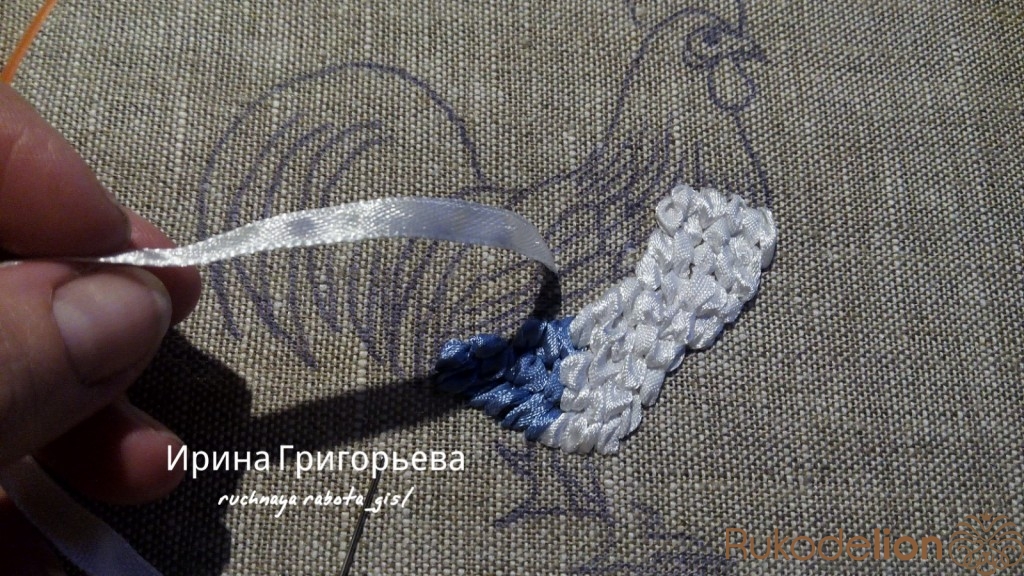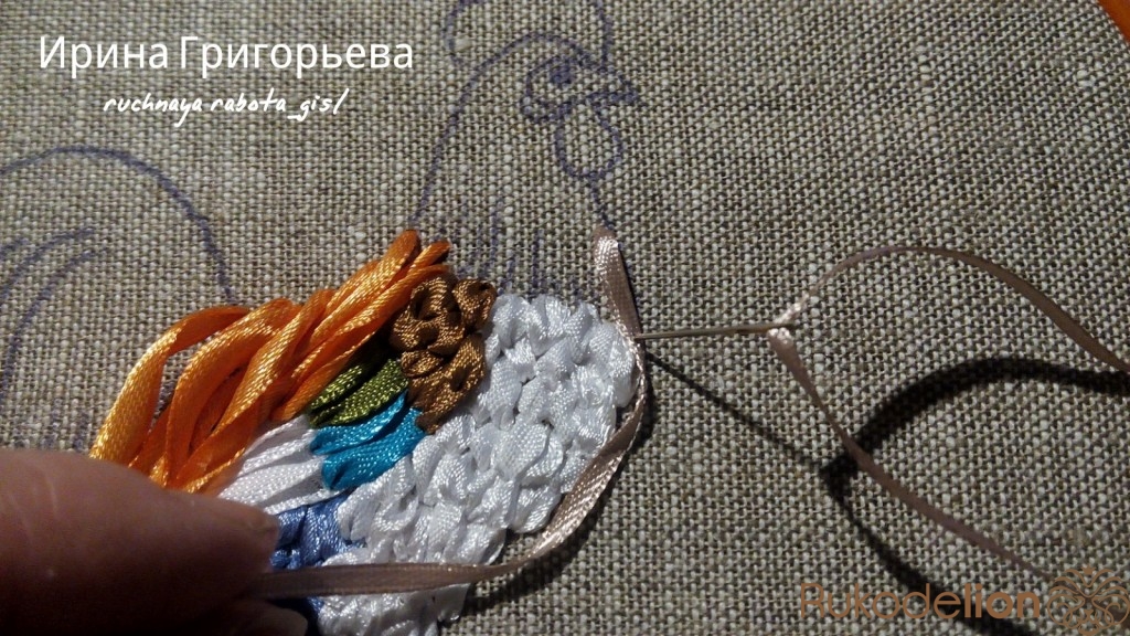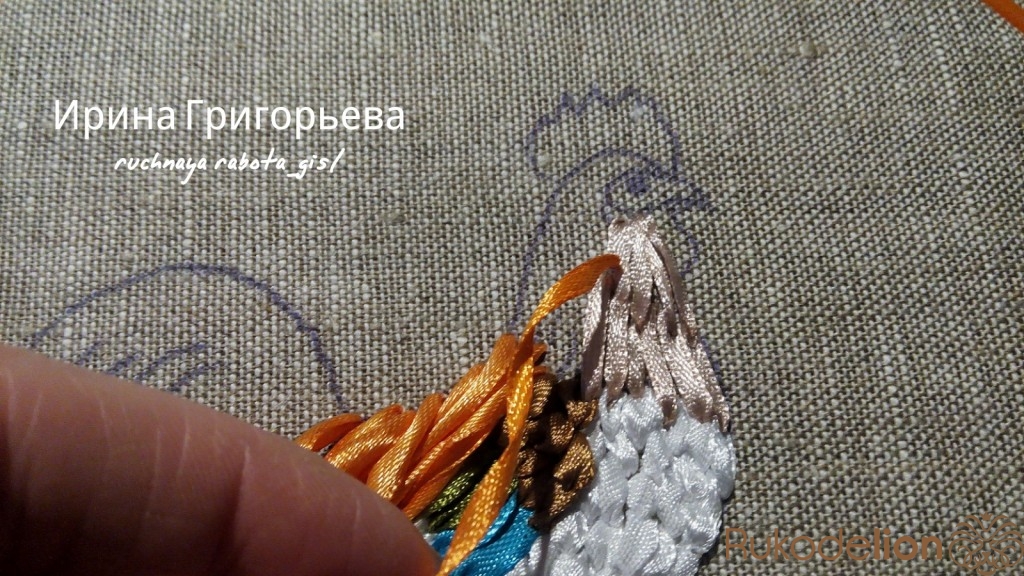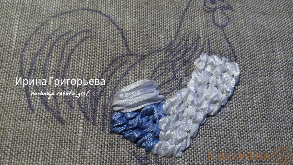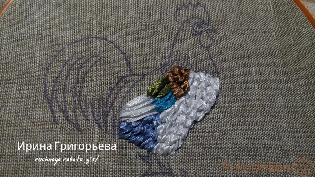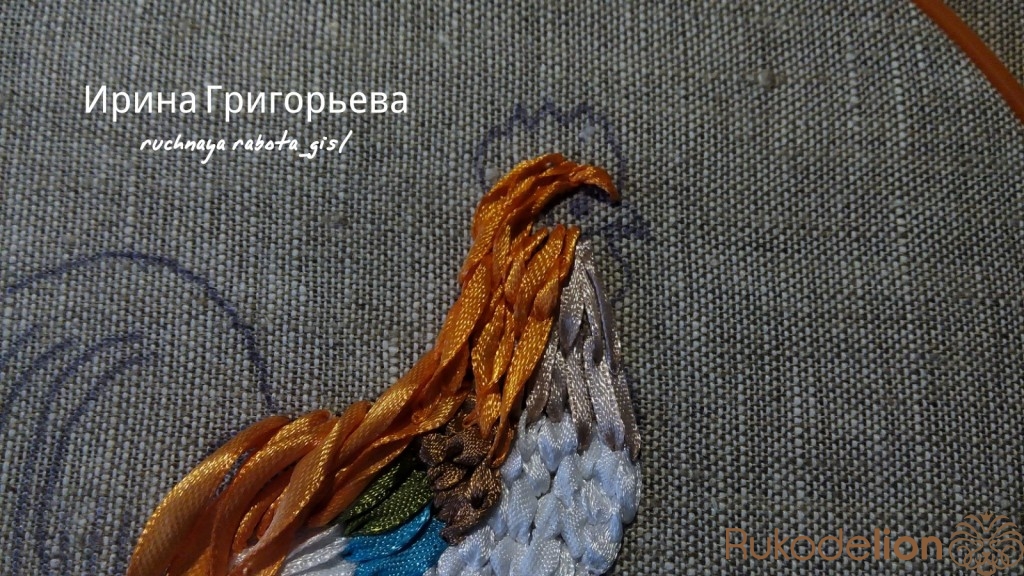 Теперь вышьем крылышко, оно состоит из нескольких цветов лент. Начинаем с нижней части - имитируем оперение. Возьмите белую ленту ш.6мм и сделайте четыре прямых удлинённых стежка, затем проложите по два стежка зелёной и голубой лентой. Не забывайте вводить иглу с лентой в стежки предыдущего ряда, чтобы не образовывались чёткие границы, а был плавный переход из одного ряда в другой. Далее вышейте два ряда коротких прямых стежков лентой ш.6мм коричневого цвета.