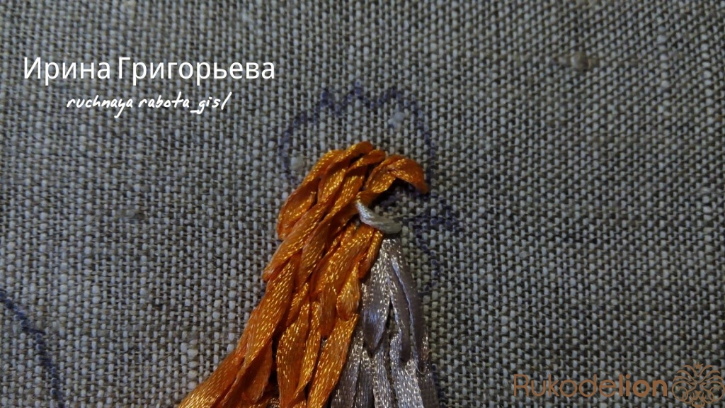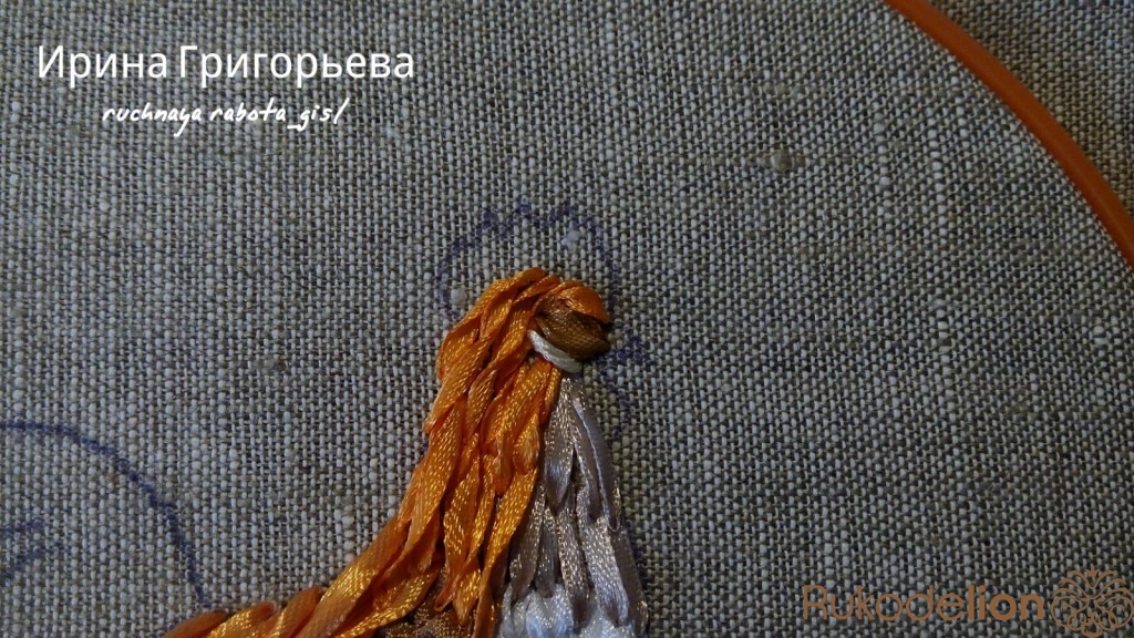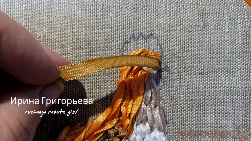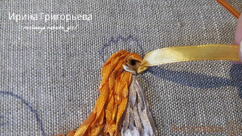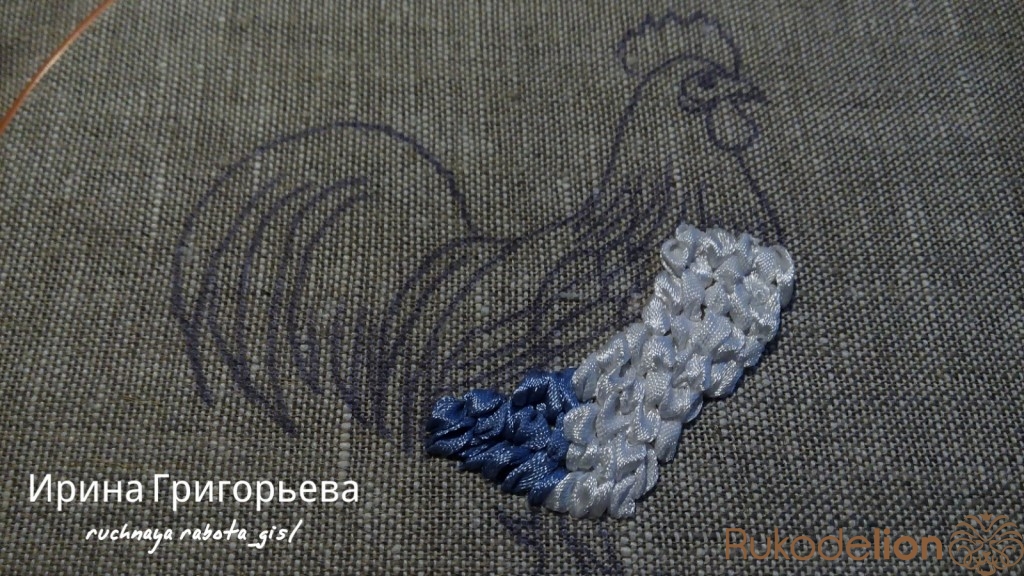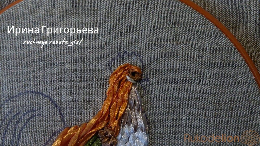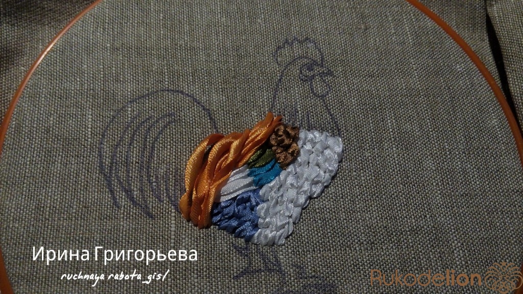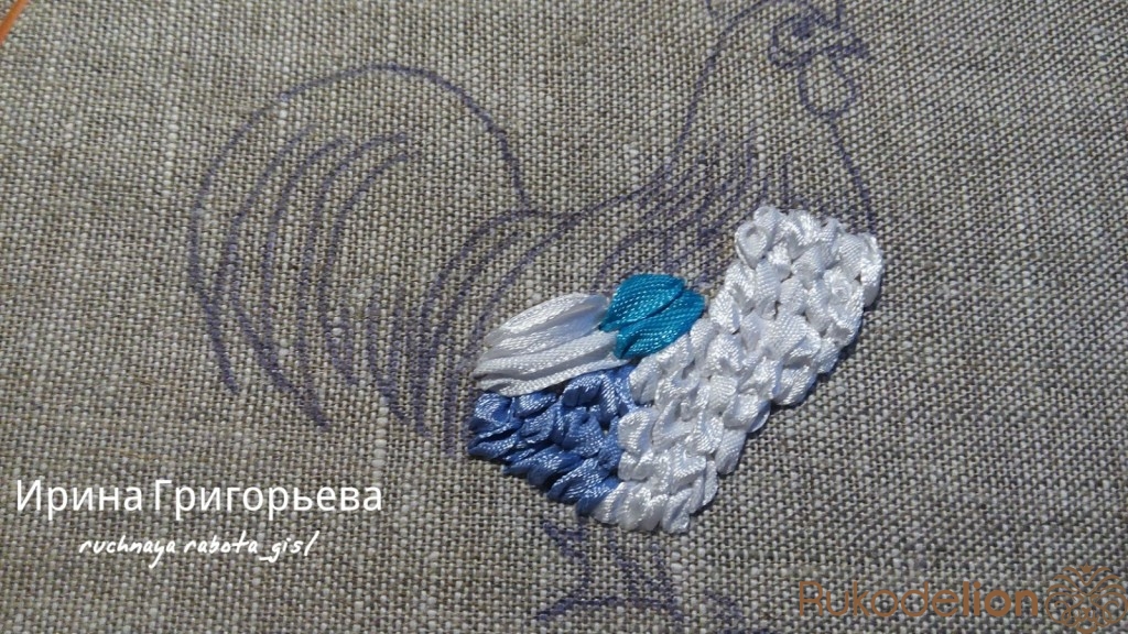 Теперь вышьем крылышко, оно состоит из нескольких цветов лент. Начинаем с нижней части - имитируем оперение. Возьмите белую ленту ш.6мм и сделайте четыре прямых удлинённых стежка, затем проложите по два стежка зелёной и голубой лентой. Не забывайте вводить иглу с лентой в стежки предыдущего ряда, чтобы не образовывались чёткие границы, а был плавный переход из одного ряда в другой. Далее вышейте два ряда коротких прямых стежков лентой ш.6мм коричневого цвета.