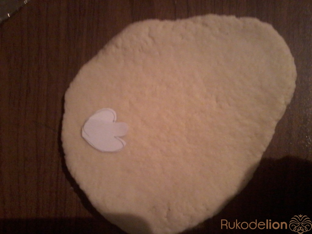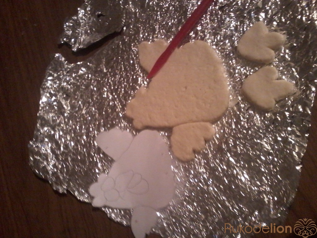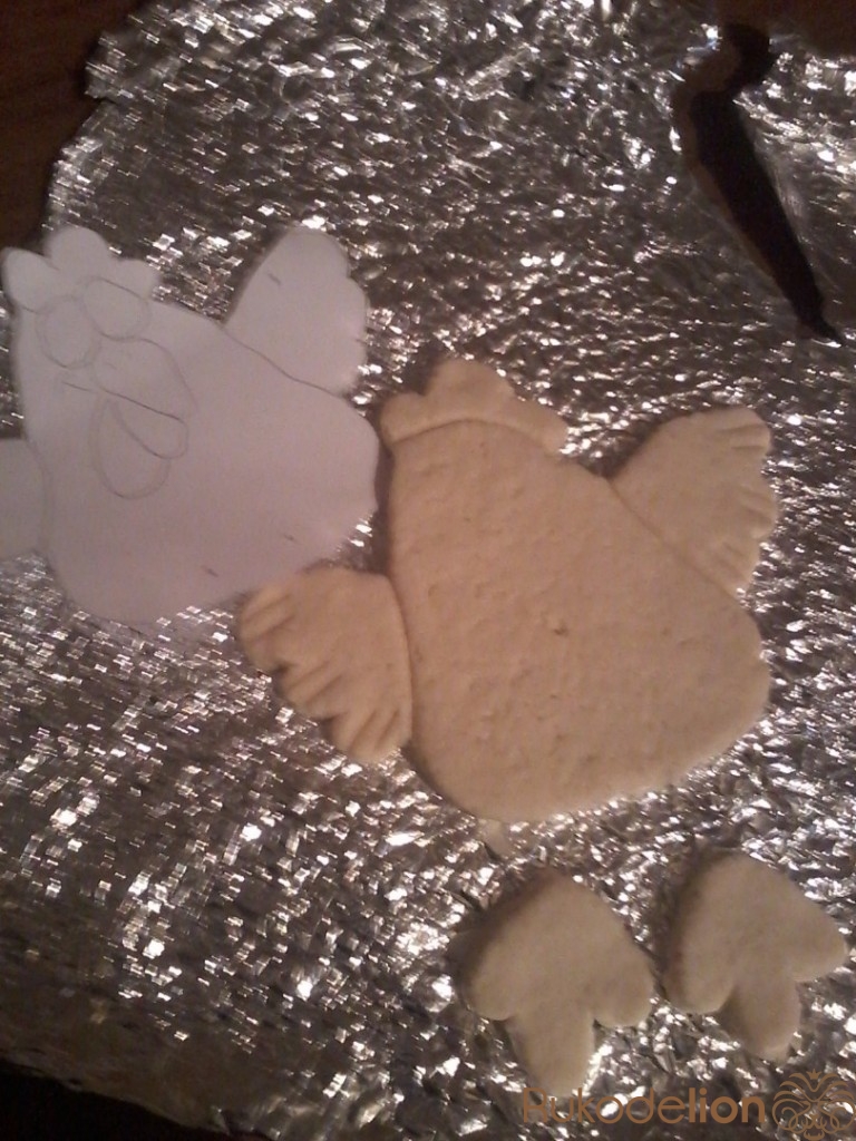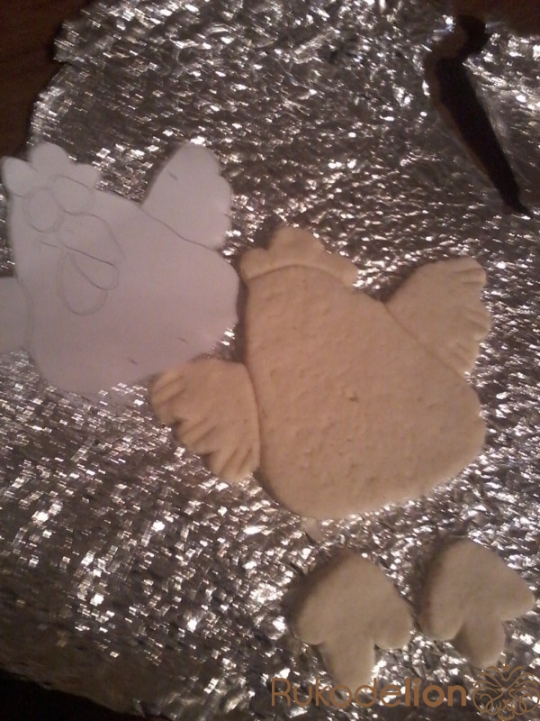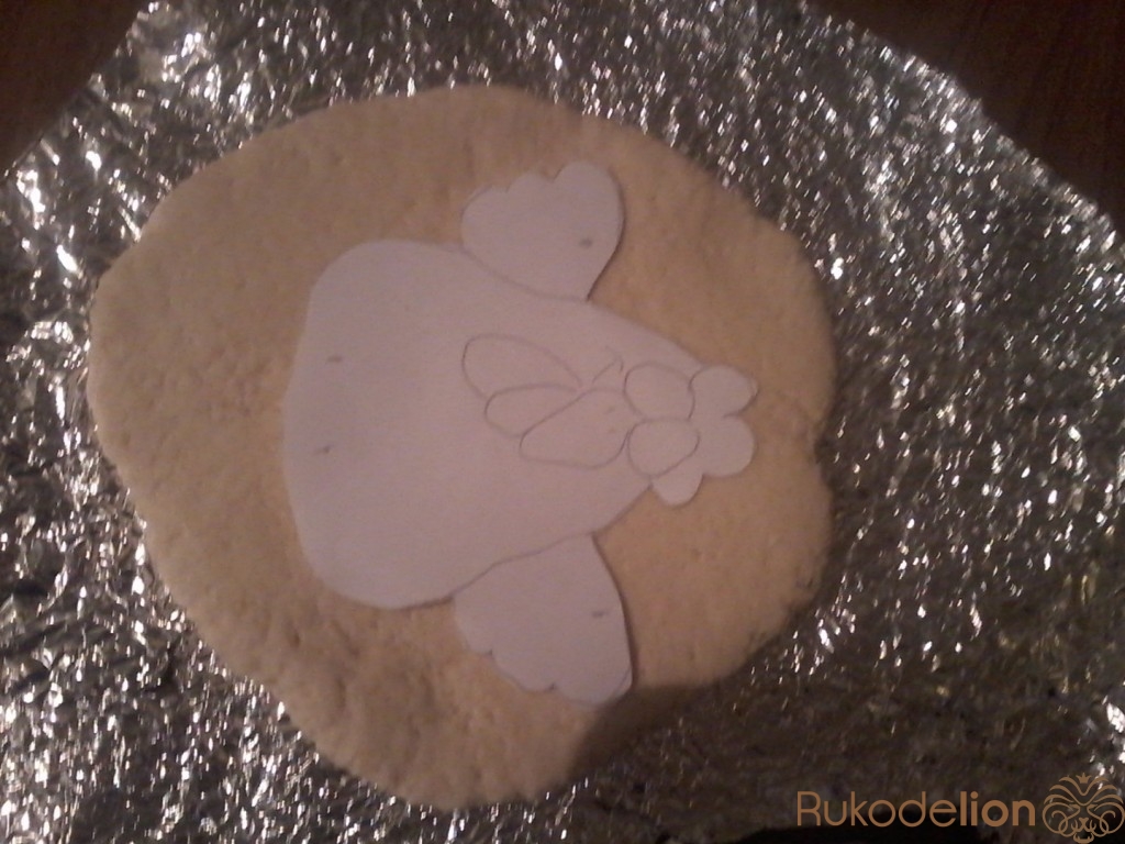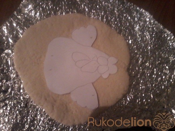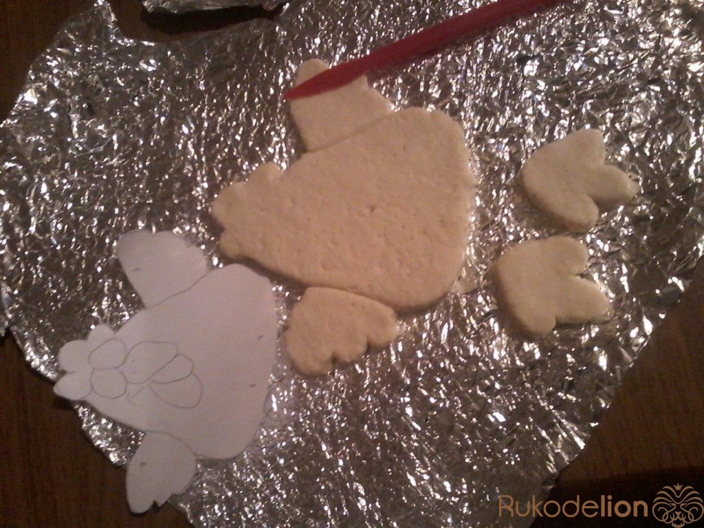 Ну а теперь сам процесс, и так… отщипываем небольшой кусочек теста и скатываем в шарик, затем берем скалку и раскатываем лепешку толщиной 1 см. Вырезаем трафарет будущего петушка по шаблону. Накладываем шаблон на тесто и вырезаем стеком по контуру. Должен получится вот такой шаблончик только из теста. По такому же принципу вырезаем лапки