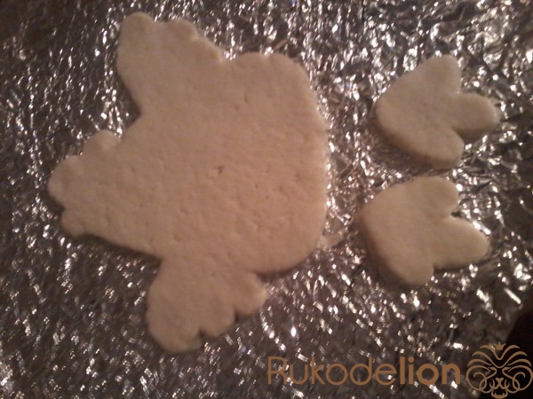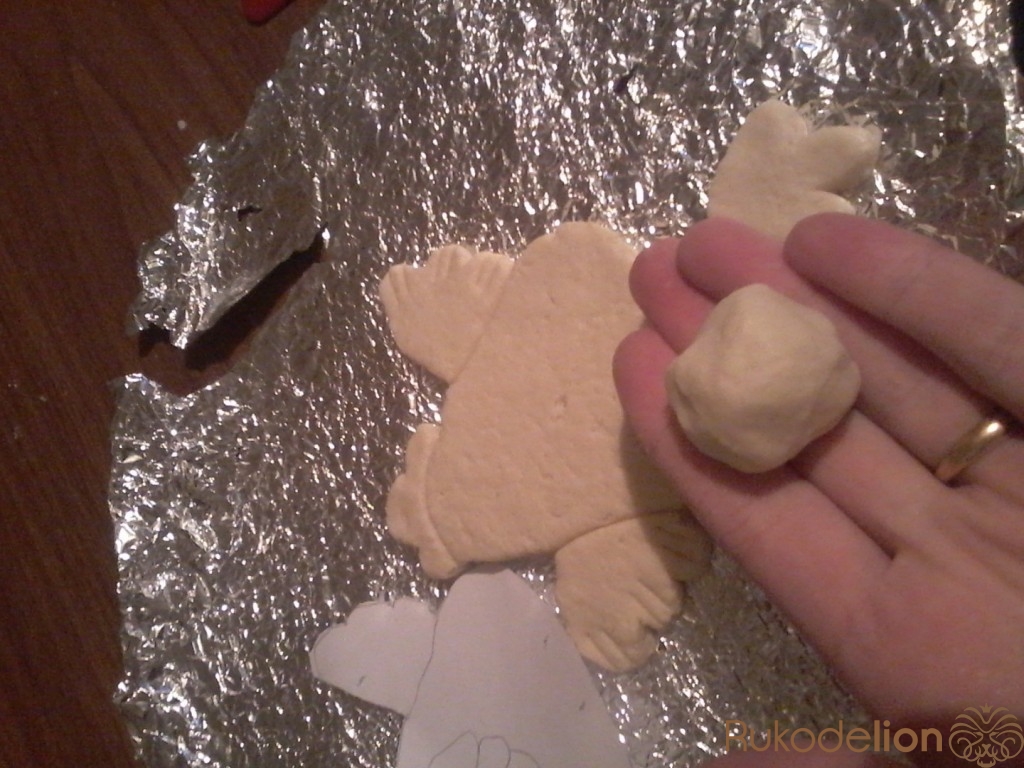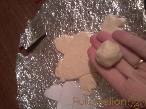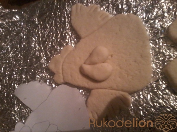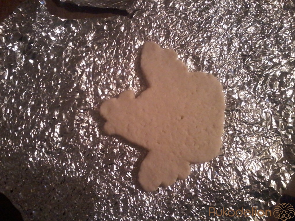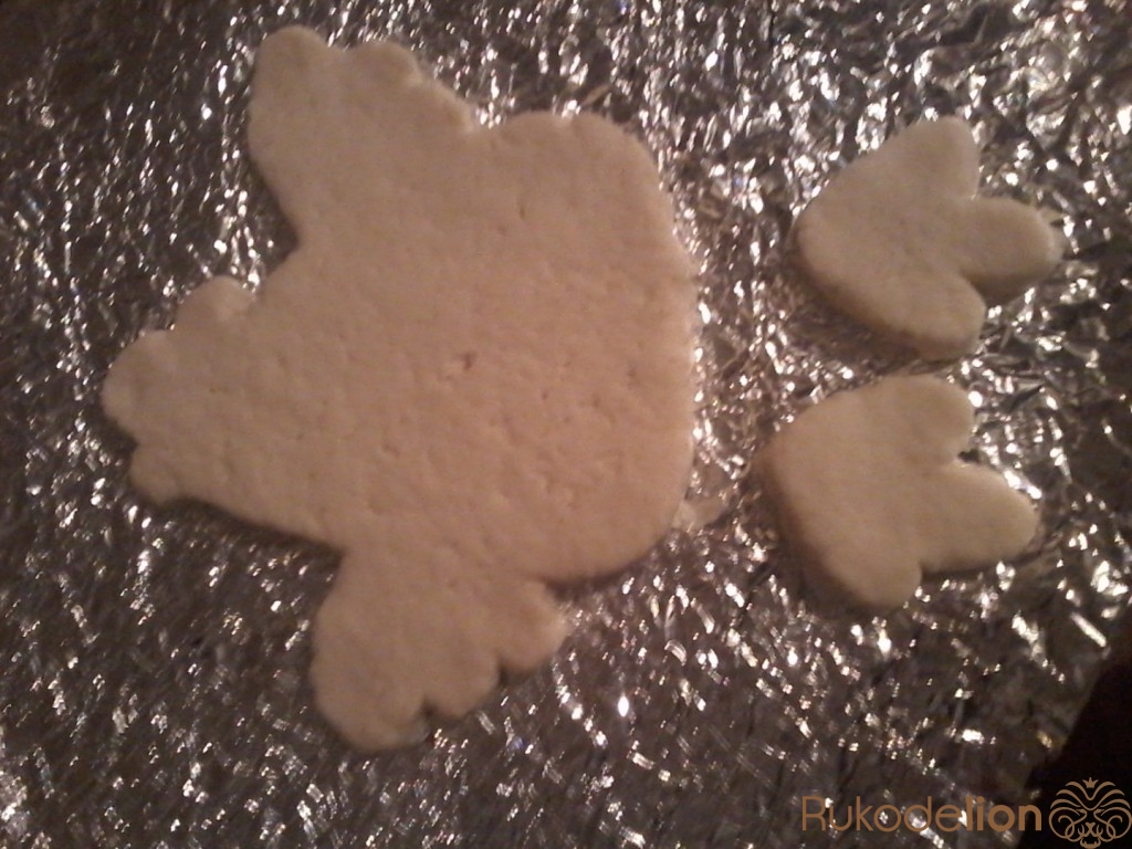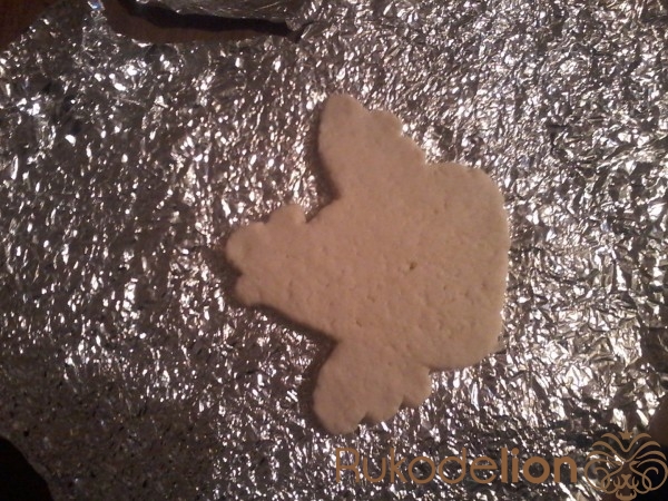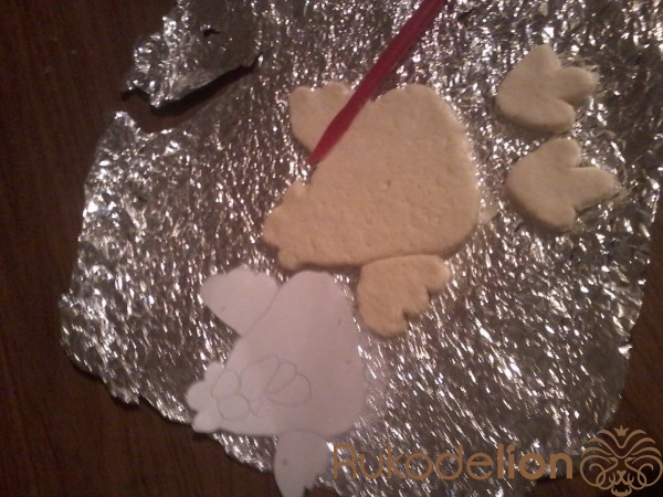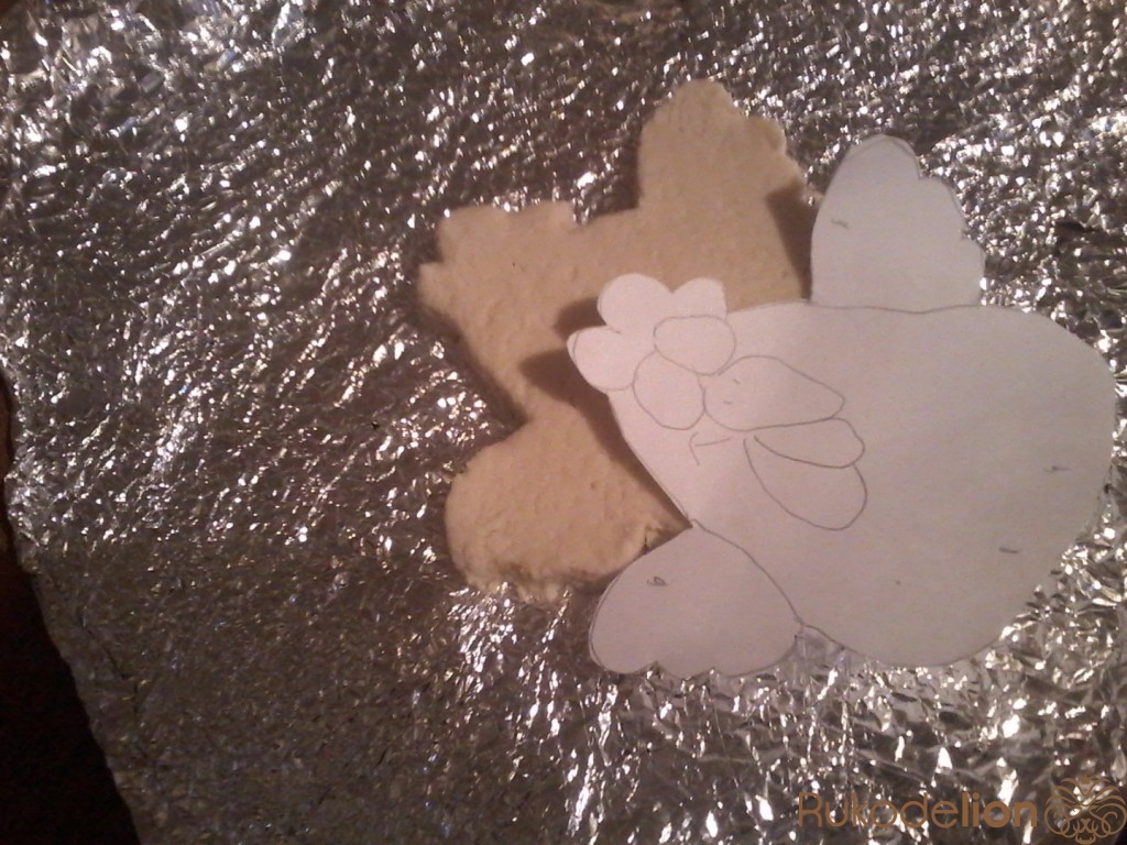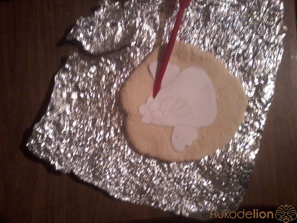 Ну а теперь сам процесс, и так… отщипываем небольшой кусочек теста и скатываем в шарик, затем берем скалку и раскатываем лепешку толщиной 1 см. Вырезаем трафарет будущего петушка по шаблону. Накладываем шаблон на тесто и вырезаем стеком по контуру. Должен получится вот такой шаблончик только из теста. По такому же принципу вырезаем лапки