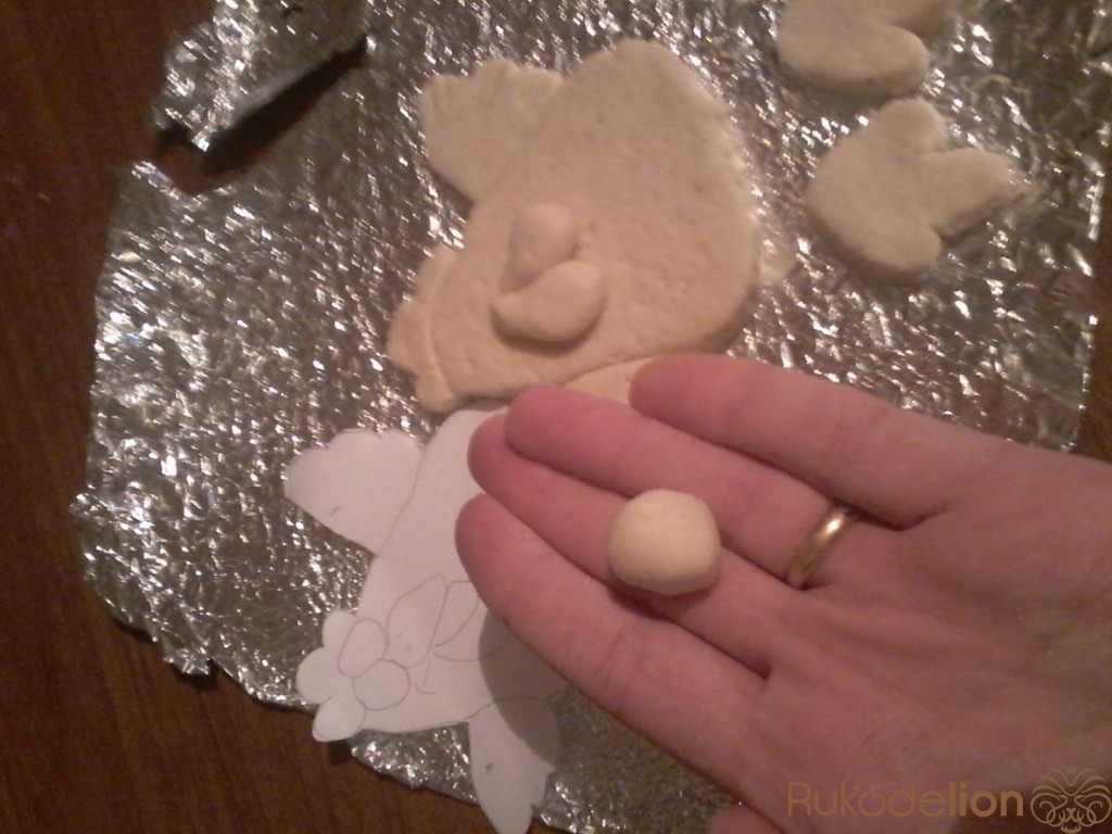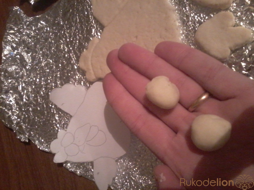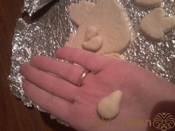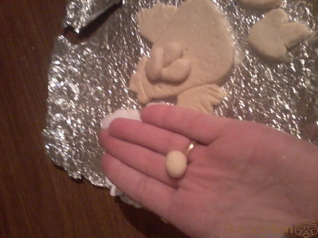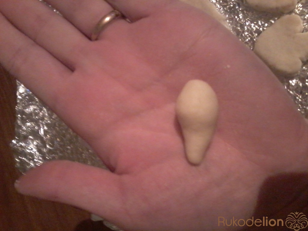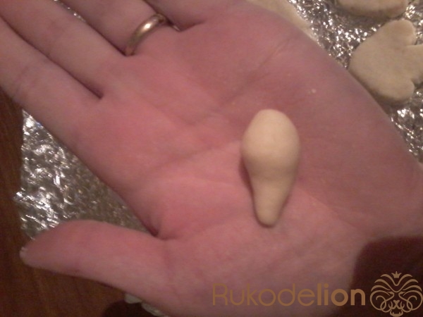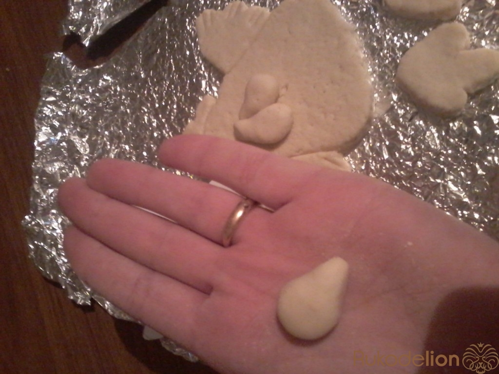 Затем берем небольшой кусочек теста, катаем шарик и делим его пополам…потом придаем каждому кусочку форму виде капельки..это у нас подбородок. Проделываем тоже самое со вторым кусочком и прилипаем к нашему петушку.