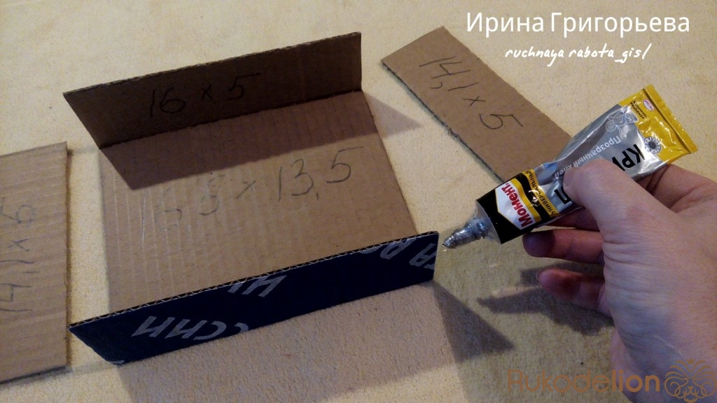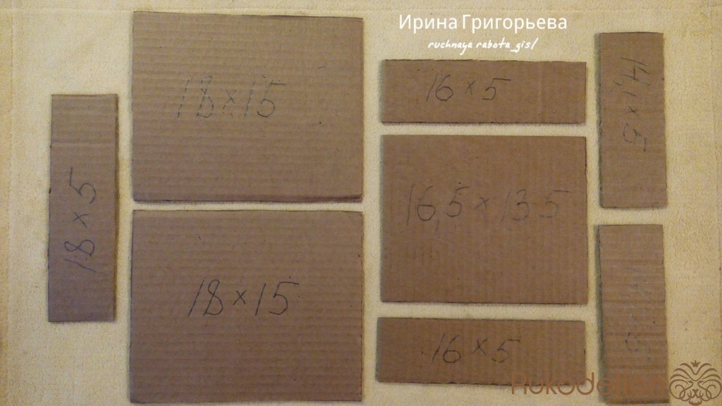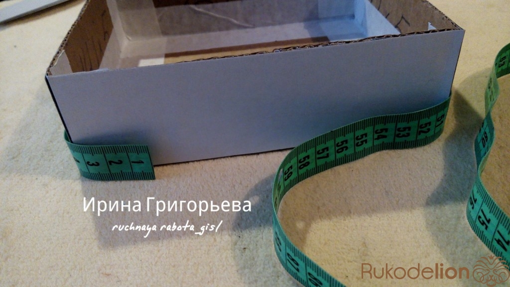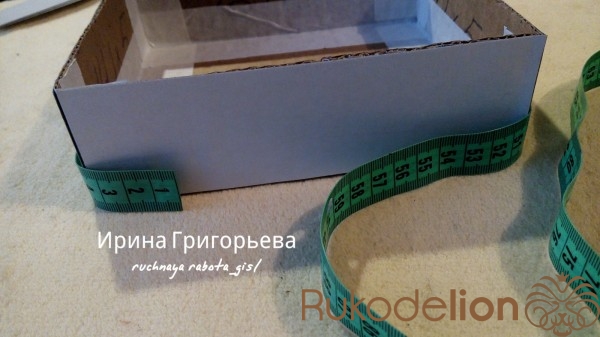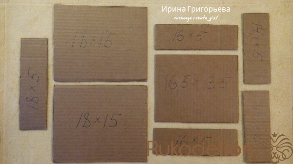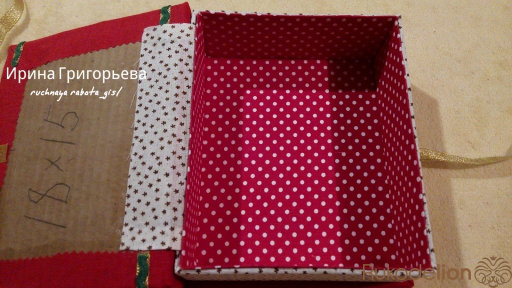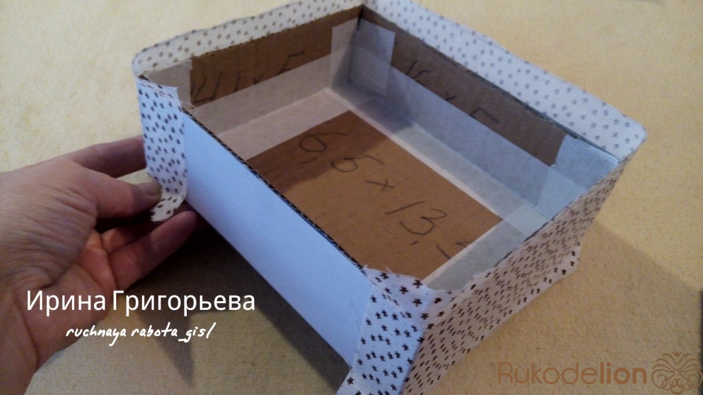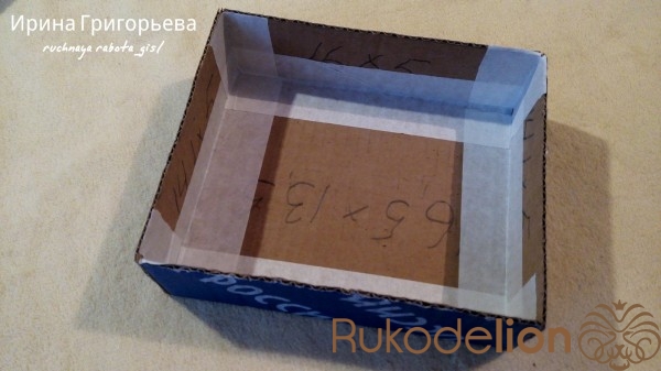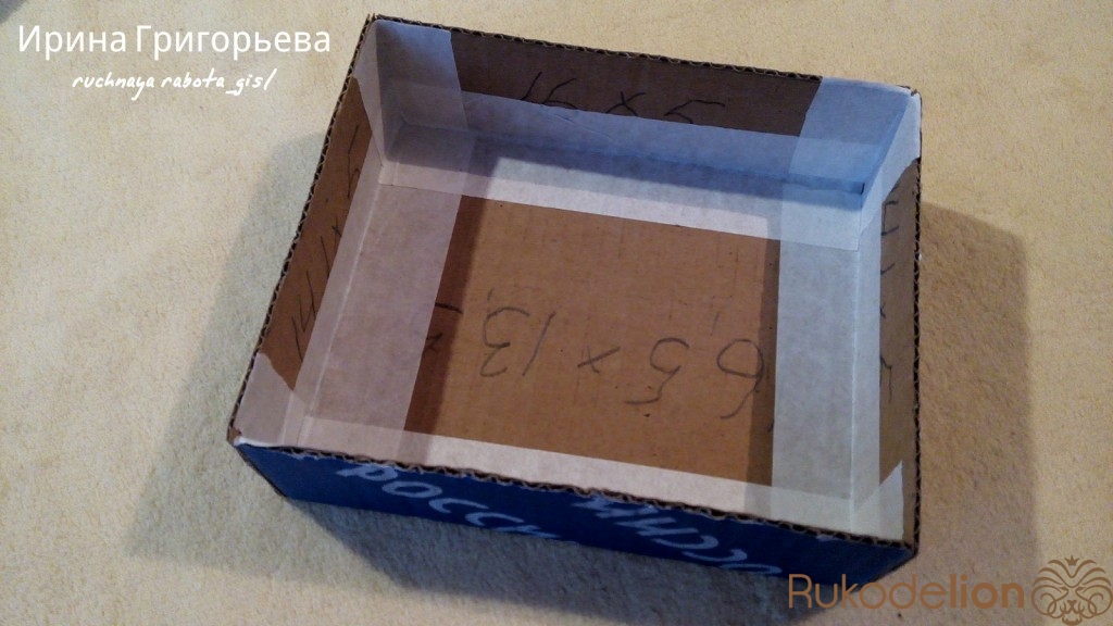 Для изготовления шкатулки я использовала обычную коробочку от посылки)) (всё идёт в дело) Для начала нарежьте детали для внутренней и внешней частей шкатулки. Свои размеры я указала, исходя из них, вы можете увеличить или уменьшить размер своей шкатулки. Начнём с внутренней части: к детали (16,5/13,5см) приклейте боковые стороны (16,5/5см -2шт и 14,1/5см-2шт). Затем проклейте внутренние и внешние углы и стыки деталей молярным скотчем. Чтобы через ткань не просвечивал рисунок коробки, обклейте внешние стороны белым картоном или ватманом.