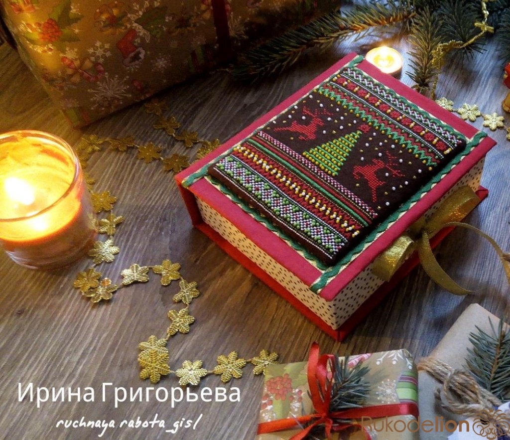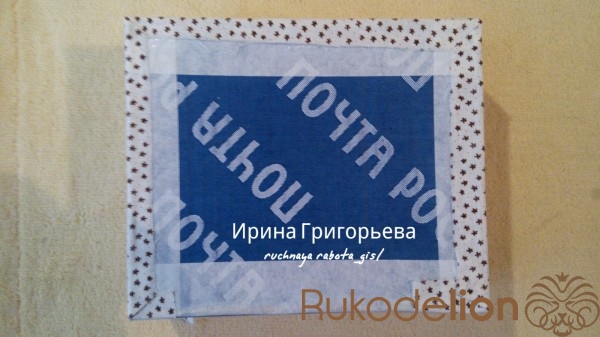 Приклейте деталь, обтянутую тканью, на внутреннюю часть крышки, следите за тем, чтобы при склеивании клапан не плотно прилегал к крышке. Это необходимо для свободного раскрытия и закрытия крышки шкатулки. Крышку шкатулки я украсила шовчиковым сюжетом (по схеме Анастасии Шахмаровой) - натянула ткань с вышивкой на деталь картона и синтепона, загнула края и приклеила на крышку шкатулки.