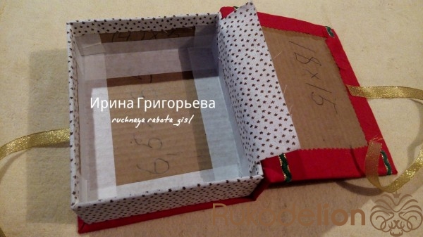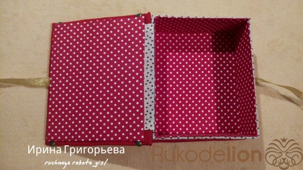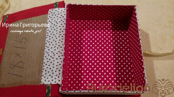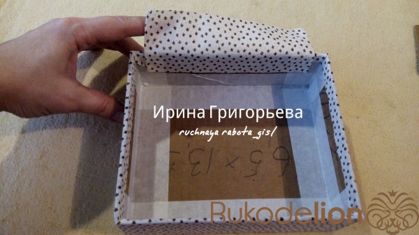 По размерам внутреннего дна и крышки вырежьте детали из белого картона. Деталь для крышки обтяните тканью, загнув края. У детали дна края оставьте не загнутыми, приклейте эту деталь на дно шкатулки, а края ткани к боковым сторонам. Также вырежьте детали для блоковых внутренних сторон и обтяните тканью. Важно! детали вырезайте на 2-3мм меньше настоящих размеров, чтобы не было излишков при склеивании.