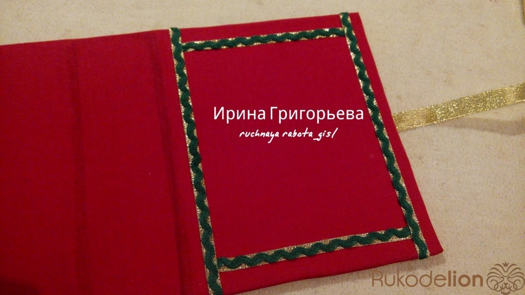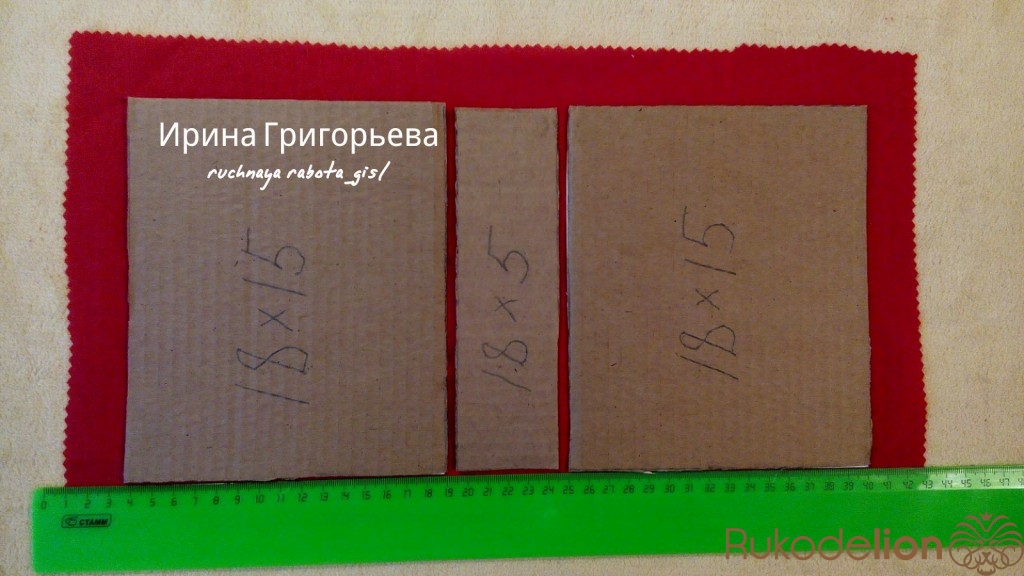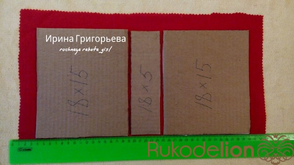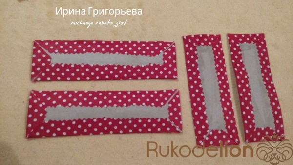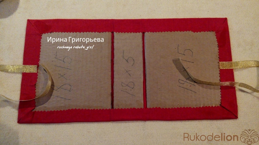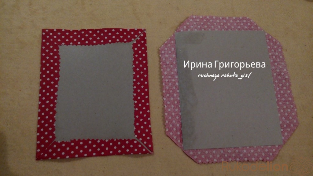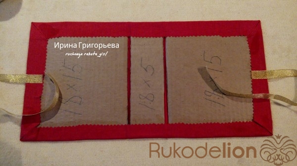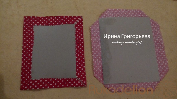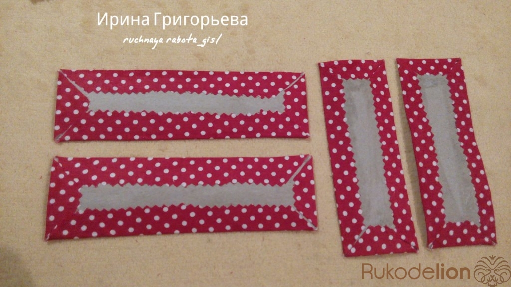 Измерьте внешнюю длинну каркаса и вырежьте полоску ткани соответствующего размера (размер моей полосы 53/8см), приклейте, оставляя края для подгиба. Подогните и приклейте края на внешнюю и внутреннюю стороны. Вырежьте из ткани деталь клапана (17/6см), подогните края на сантиметр и приклейте к внутренней стороне каркаса.