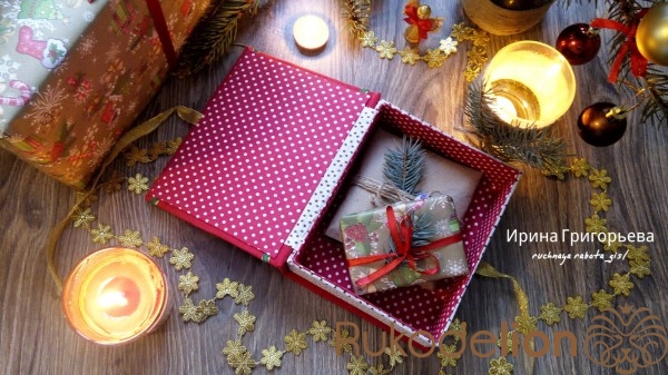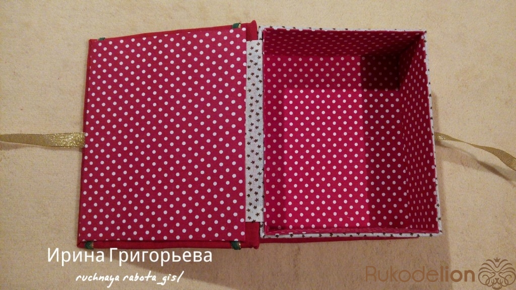 Вырежьте из ткани деталь для внешней части шкатулки. Расположите на ткани детали и приклейте, оставляя между ними промежуток в 0,5см, загните края и приклейте. Расположите и приклейте декоративные элементы: я использовала золотистую тесьму по бокам заготовки, для того, чтобы шкатулочку можно было завязывать, а также задекорировала внешнюю сторону крышки. Далее приклейте внутреннюю часть шкатулки к внешней детали.