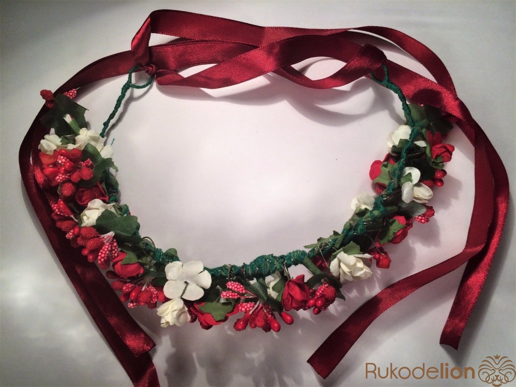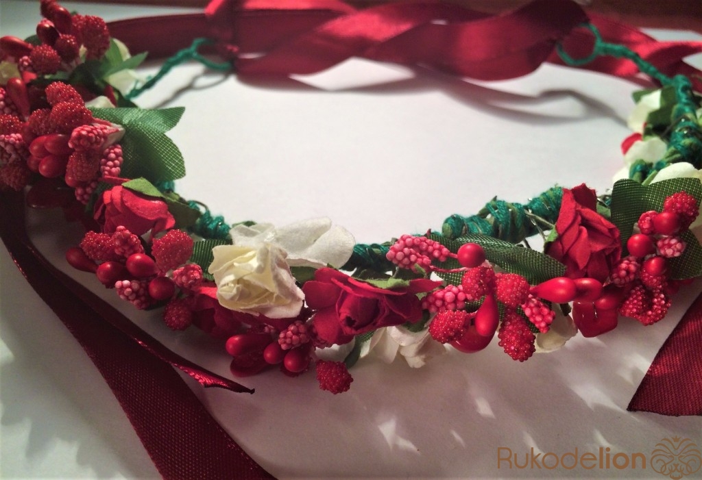Яркий ободок с красными и белыми цветами и вкраплениями коралла.