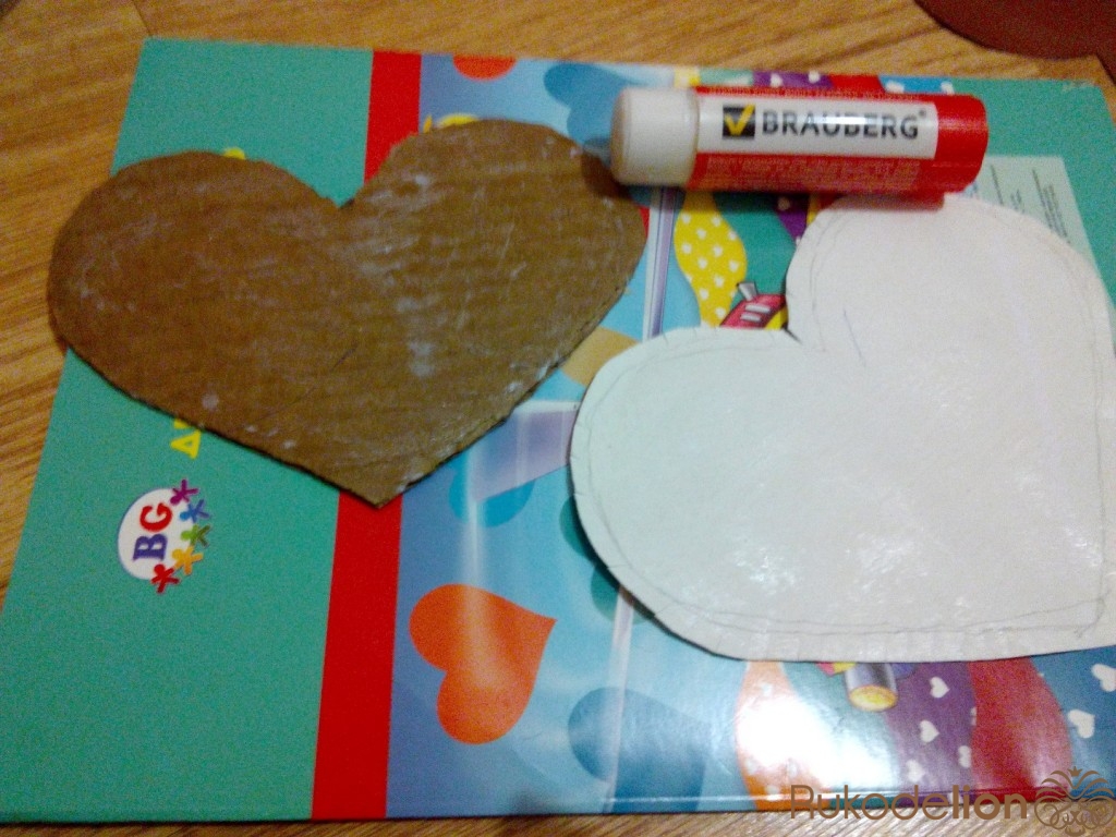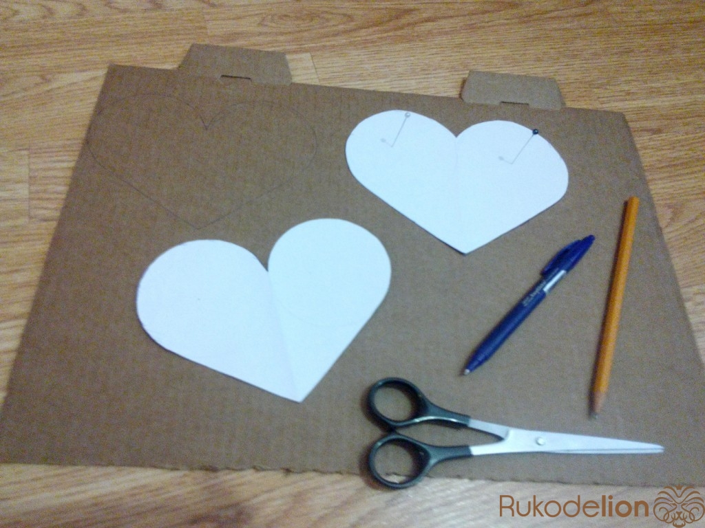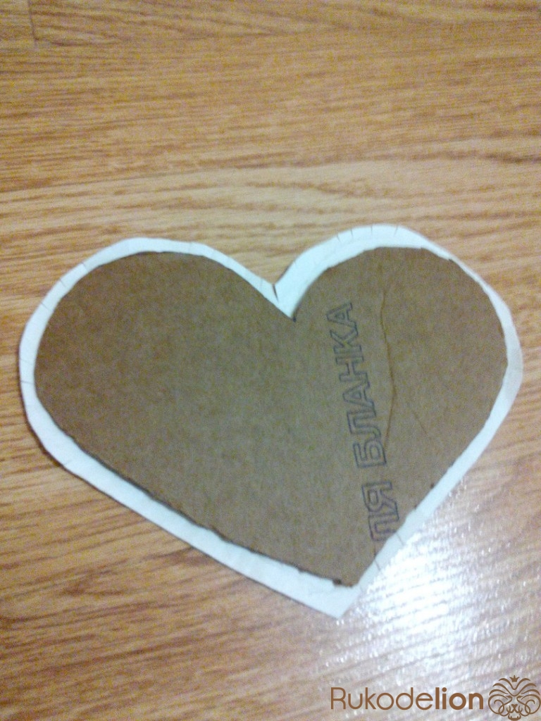 1. Вырезаем из бумаги шаблон в форме сердца. По шаблону рисуем две детали в форме сердца на плотном картоне, вырезаем их (картон лучше вырезать канцелярским ножом). У нас получились крышка и дно коробочки. Сантиметровой лентой измеряем боковую часть сердца, это будет длина боковой стенки коробочки, ширину определяйте сами (в данном случае 6 см.) Нам понадобится две таких детали (боковые стороны коробочки). Итак, у нас получились две детали в форме сердца (крышка, дно) и две прямоугольных детали (боковые стороны).