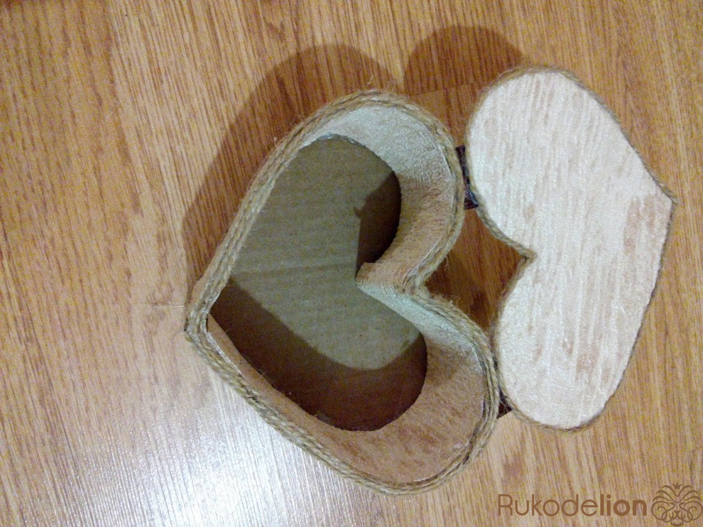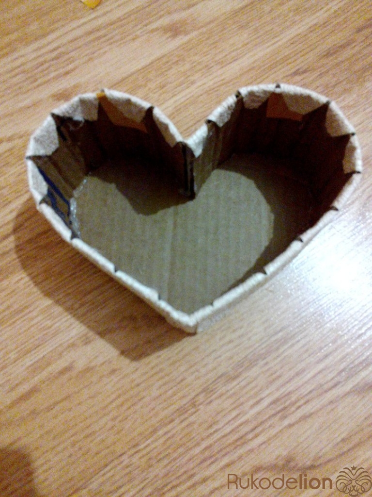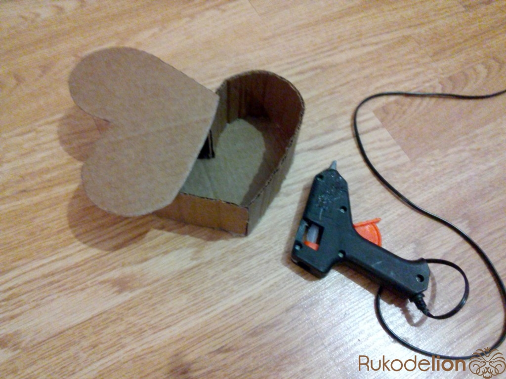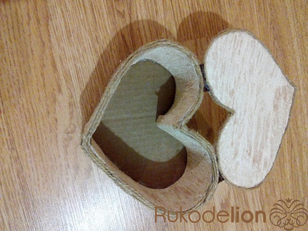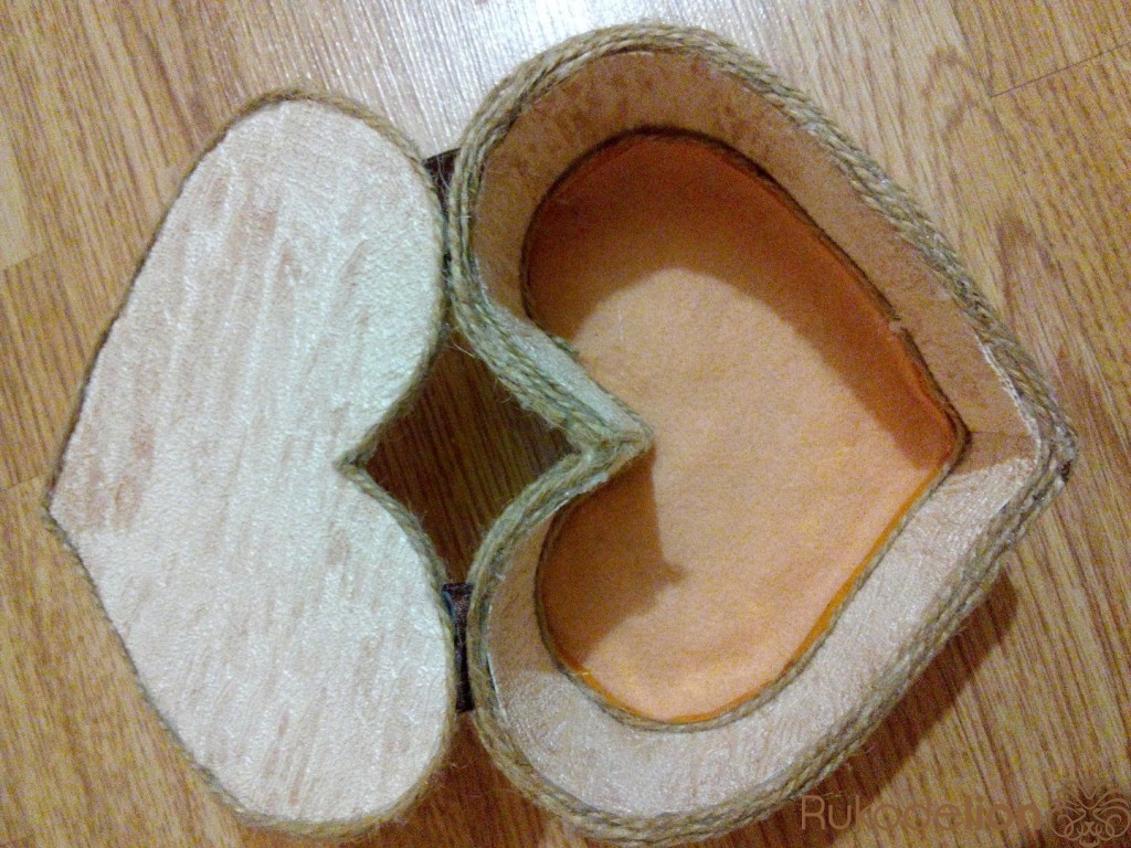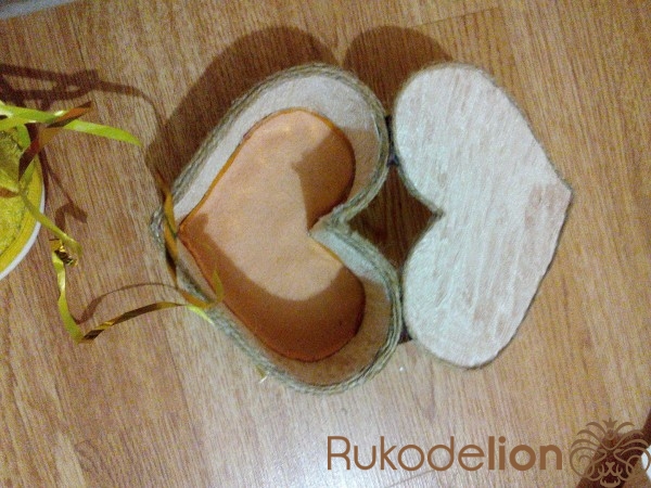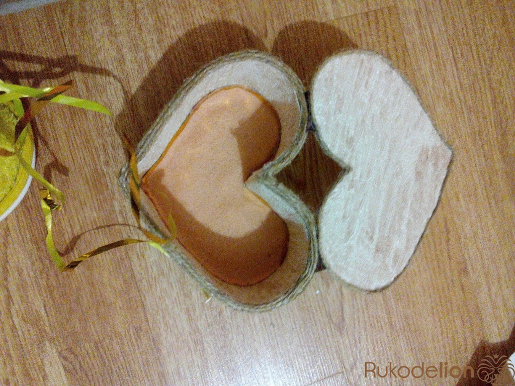 3. Приступаем к формированию каркаса. Две прямоугольных детали (для боковых стенок) необходимо хорошо «промять», чтобы они лучше загибались. Затем поочередно приклеиваем одну и вторую деталь к основанию (дну) коробочки. Итак, каркас готов. Приступаем к упаковке. Начнем с упаковки крышки. Для этого берем сердце из бумаги большего размера и по его краям делам надрезы (для отгиба). Приклеиваем бумажную деталь к основной при помощи клея-карандаша, оставляя место для отгиба. Затем, с помощью клеевого пистолета приклеиваем отгиб к внутренней стороне крышки. Внешняя сторона готова. Крышка коробочки будет крепиться лентами. В местах крепления крышки на двухсторонний скотч крепим ленты длиной 3-4 см, оставляя свободный край для дальнейшего крепления к коробке. Ленты с двух сторон необходимо заранее обжечь, чтобы они не расползались. На внутреннюю сторону крышки на двухсторонний приклеиваем сердце из бумаги, подготовленное для внутренней стороны. Затем контур сердца декорируем шпагатом. Приступаем к упаковке самой коробочки. Сначала обклеим боковые стороны. По краям прямоугольников большего размера вырезаем зубчики (для отгиба). Поочередно клеим их на внешнюю сторону боковых стенок. Отгибы приклеиваем клеевым пистолетом с одной стороны (вовнутрь коробочки) и с другой (на внешнюю сторону дна коробочки). Для упаковки дна приклеиваем заранее подготовленное сердце из бумаги к внешней стороне дна. Декорируем шпагатом по краю основания, как и в случае с крышкой. Приступаем к упаковке внутренней части коробочки. Для начала нам необходимо соединить крышку с основанием. Для этого вовнутрь коробочки на двухсторонний скотч приклеиваем свободные края лент крышки. Далее приклеиваем прямоугольные детали из бумаги по внутренним сторонам стенок на двухсторонний скотч. Декорируем верхний край шпагатом. На дно коробочки приклеиваем сердце из фетра. Внутри коробочки по краю основания декорируем золотой лентой и шпагатом.
