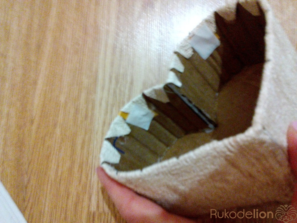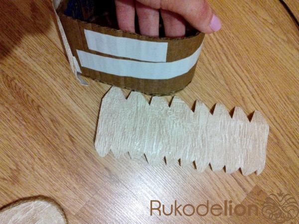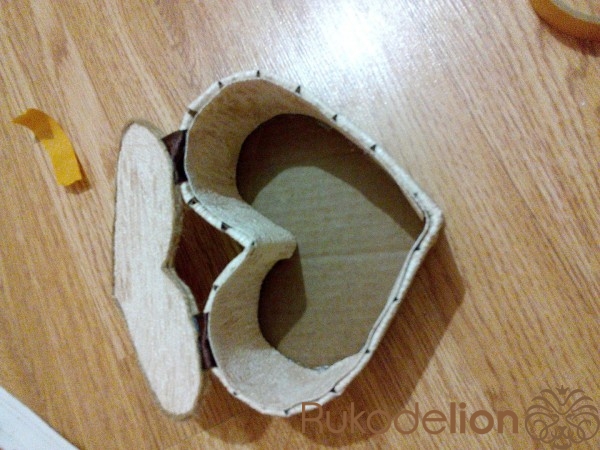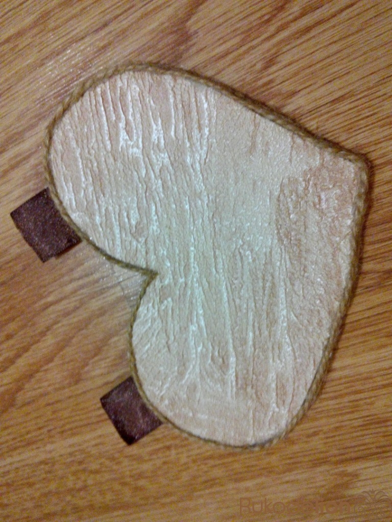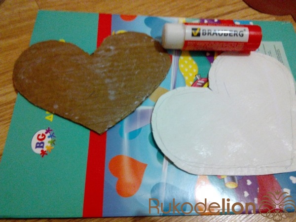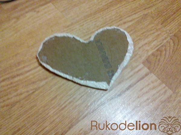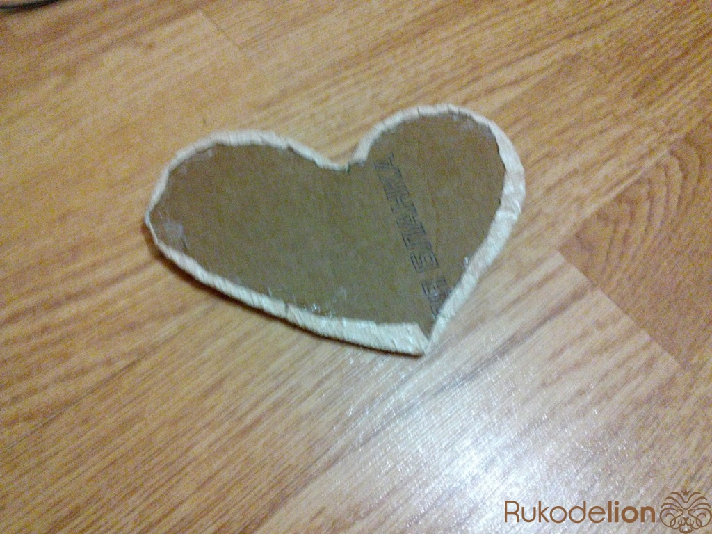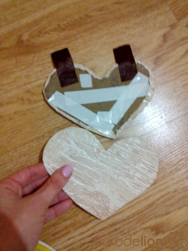 3. Приступаем к формированию каркаса. Две прямоугольных детали (для боковых стенок) необходимо хорошо «промять», чтобы они лучше загибались. Затем поочередно приклеиваем одну и вторую деталь к основанию (дну) коробочки. Итак, каркас готов. Приступаем к упаковке. Начнем с упаковки крышки. Для этого берем сердце из бумаги большего размера и по его краям делам надрезы (для отгиба). Приклеиваем бумажную деталь к основной при помощи клея-карандаша, оставляя место для отгиба. Затем, с помощью клеевого пистолета приклеиваем отгиб к внутренней стороне крышки. Внешняя сторона готова. Крышка коробочки будет крепиться лентами. В местах крепления крышки на двухсторонний скотч крепим ленты длиной 3-4 см, оставляя свободный край для дальнейшего крепления к коробке. Ленты с двух сторон необходимо заранее обжечь, чтобы они не расползались. На внутреннюю сторону крышки на двухсторонний приклеиваем сердце из бумаги, подготовленное для внутренней стороны. Затем контур сердца декорируем шпагатом. Приступаем к упаковке самой коробочки. Сначала обклеим боковые стороны. По краям прямоугольников большего размера вырезаем зубчики (для отгиба). Поочередно клеим их на внешнюю сторону боковых стенок. Отгибы приклеиваем клеевым пистолетом с одной стороны (вовнутрь коробочки) и с другой (на внешнюю сторону дна коробочки). Для упаковки дна приклеиваем заранее подготовленное сердце из бумаги к внешней стороне дна. Декорируем шпагатом по краю основания, как и в случае с крышкой. Приступаем к упаковке внутренней части коробочки. Для начала нам необходимо соединить крышку с основанием. Для этого вовнутрь коробочки на двухсторонний скотч приклеиваем свободные края лент крышки. Далее приклеиваем прямоугольные детали из бумаги по внутренним сторонам стенок на двухсторонний скотч. Декорируем верхний край шпагатом. На дно коробочки приклеиваем сердце из фетра. Внутри коробочки по краю основания декорируем золотой лентой и шпагатом.