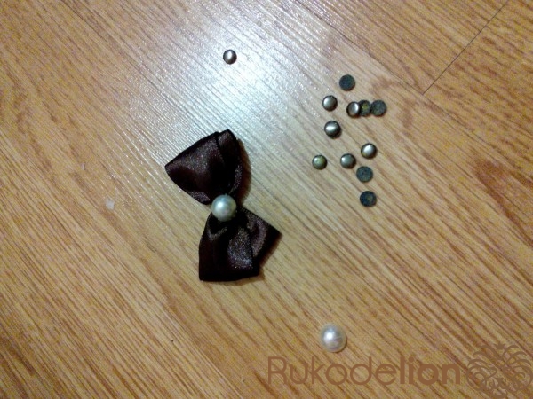 • Бусины, стразы, бант из атласной ленты, золотистая лента;