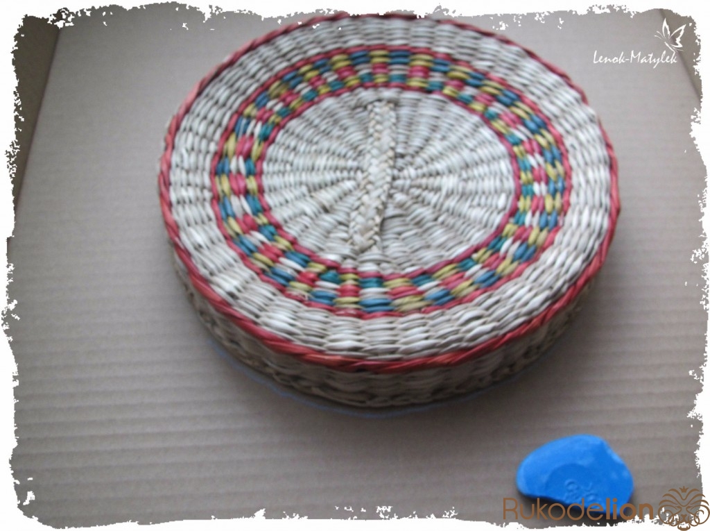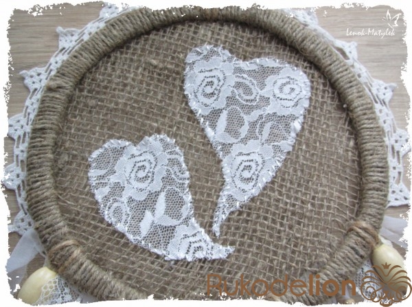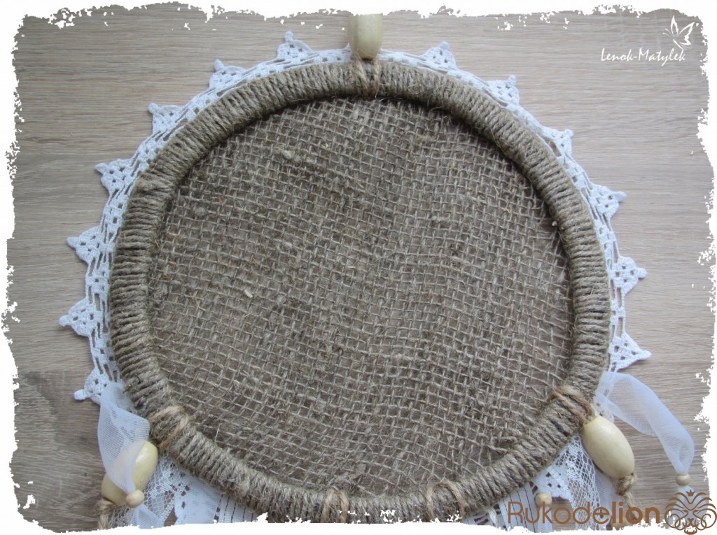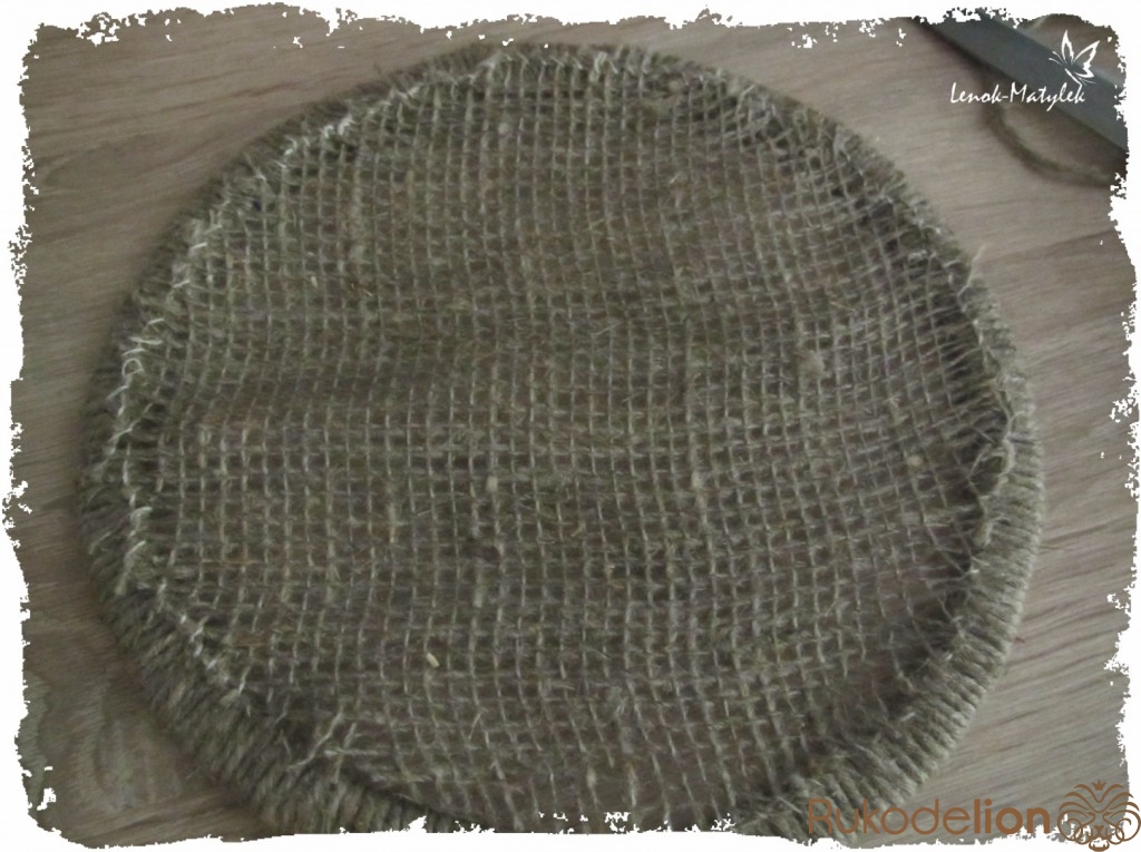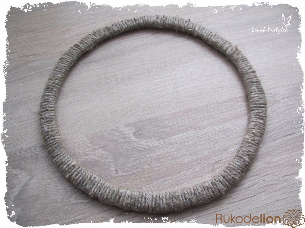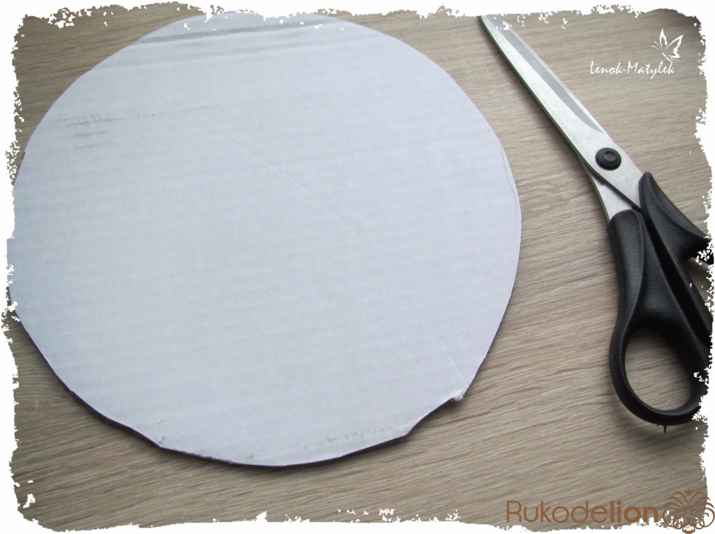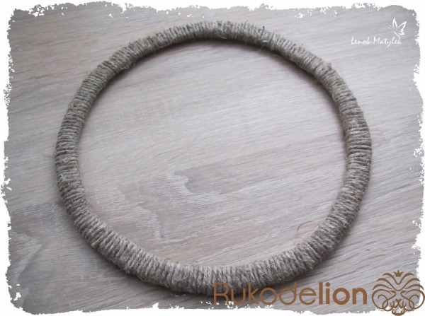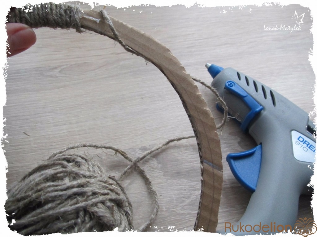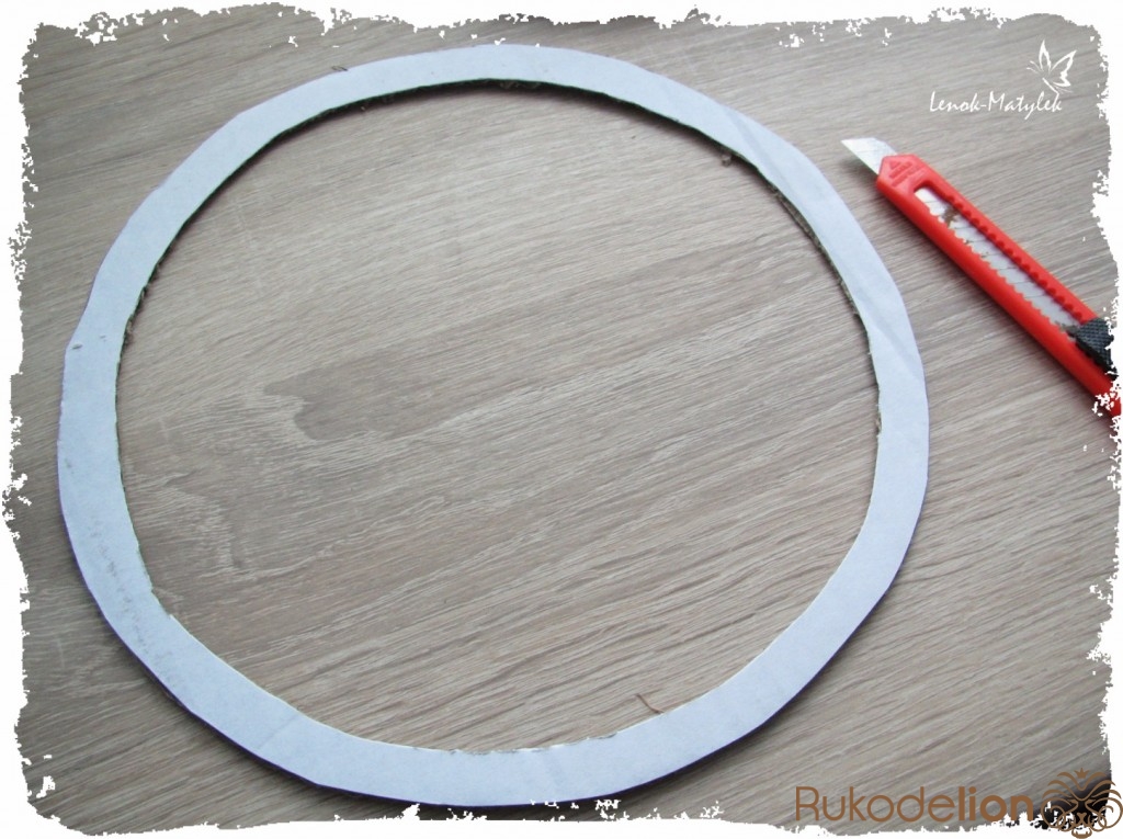 На куске картона рисуем круг диаметром 20 см (обвела то, что было под рукой :) ), вырезаем. Далее внутри рисуем еще один круг, поменьше (диаметром 18 см). При помощи канцелярского ножа вырезаем и его. Получился вот такой «бублик», который декорируем бечевкой при помощи клея-пистолета.