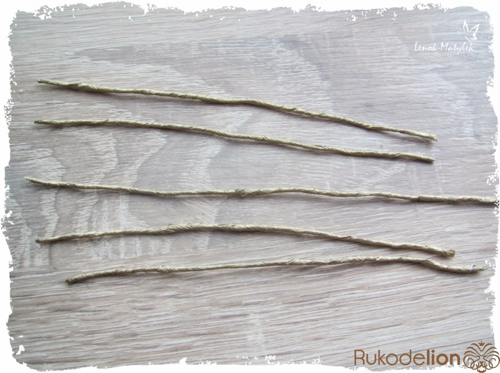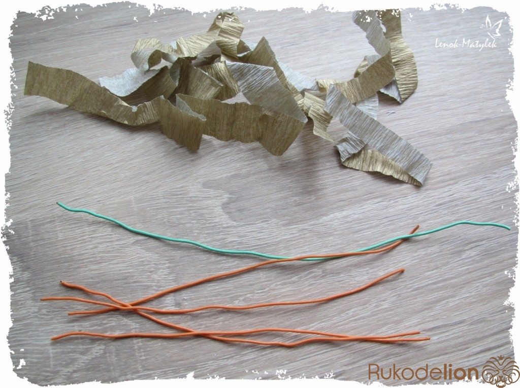 Рисуем, вырезаем. Нарезаем нужной длины проволоку. Обклеиваем ее гофрированной бумагой при помощи клея ПВА. Получившиеся палочки приклеиваем к "перышкам".