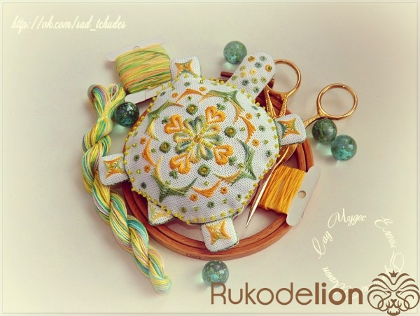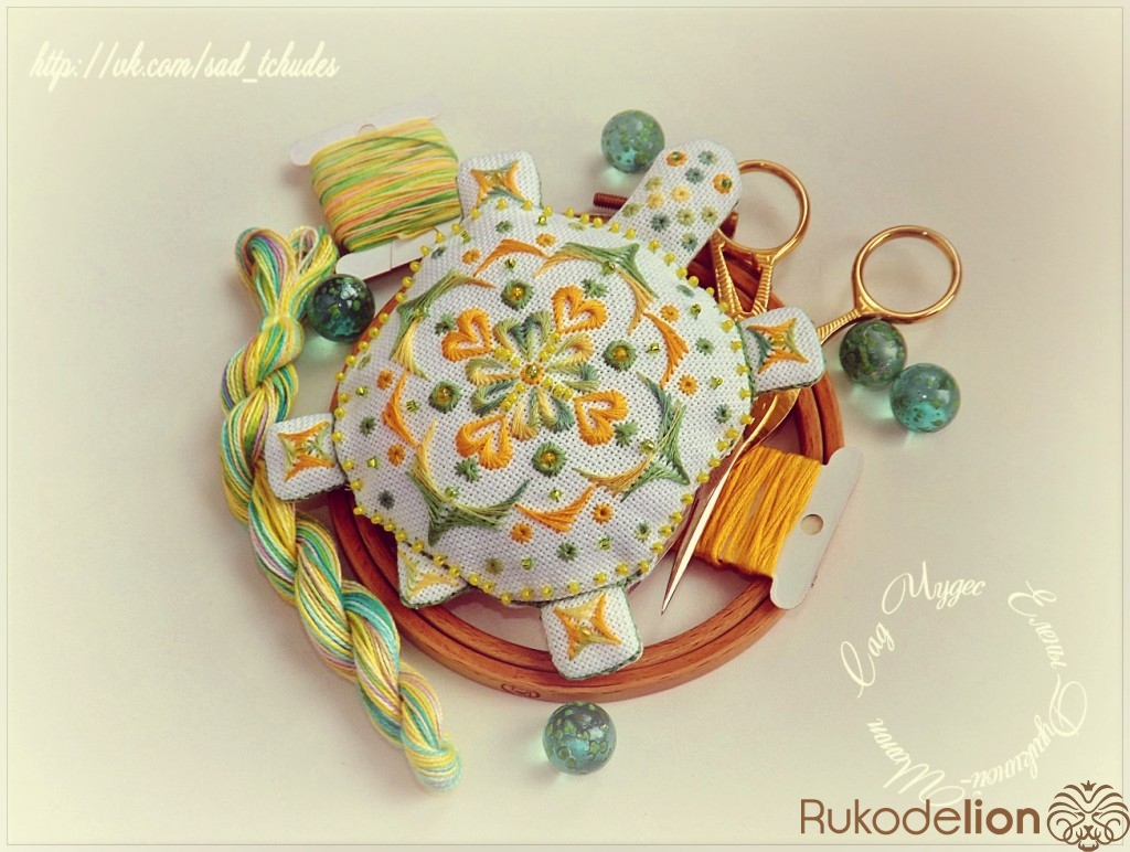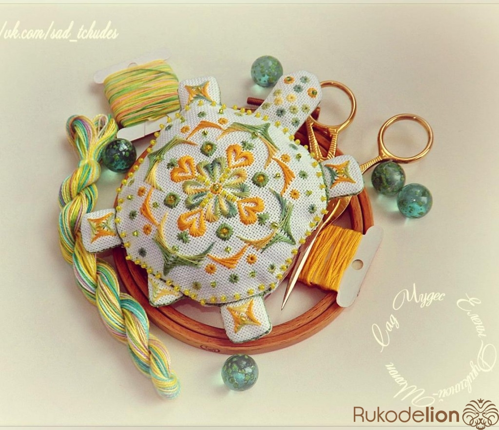 Игольница- игрушка в виде черепашки украшена вышивкой в технике декоративных счетных швов по собственному дизайну.
