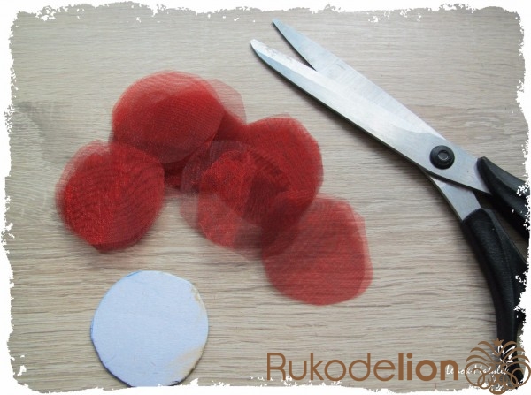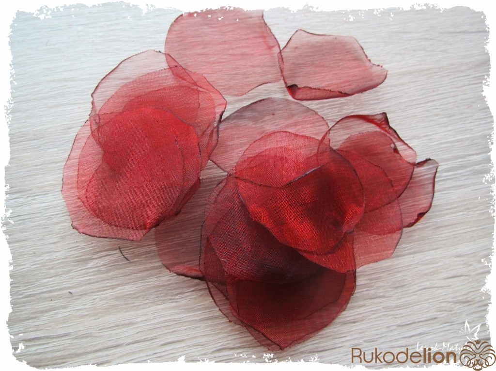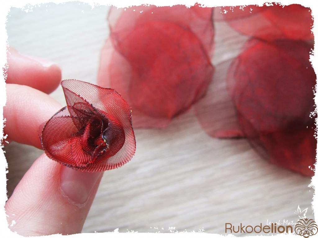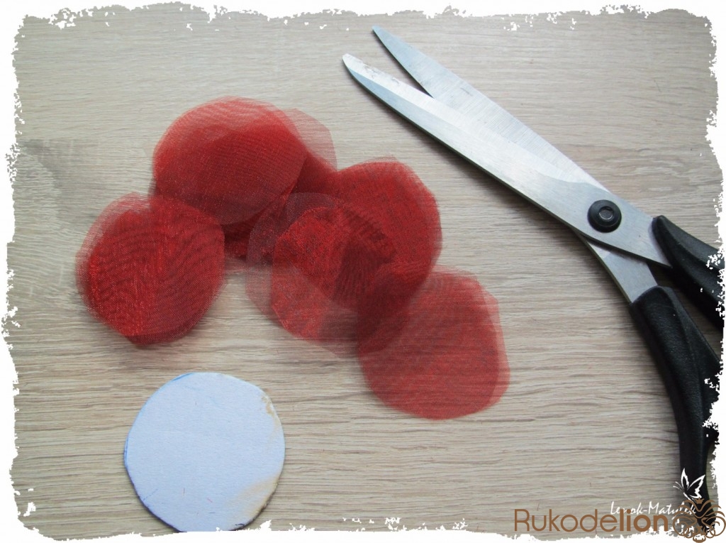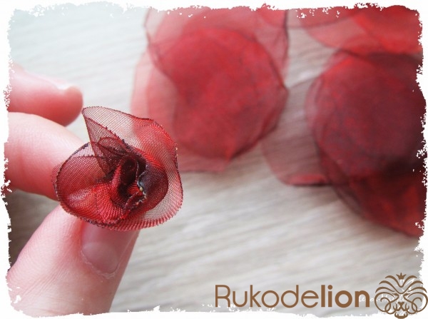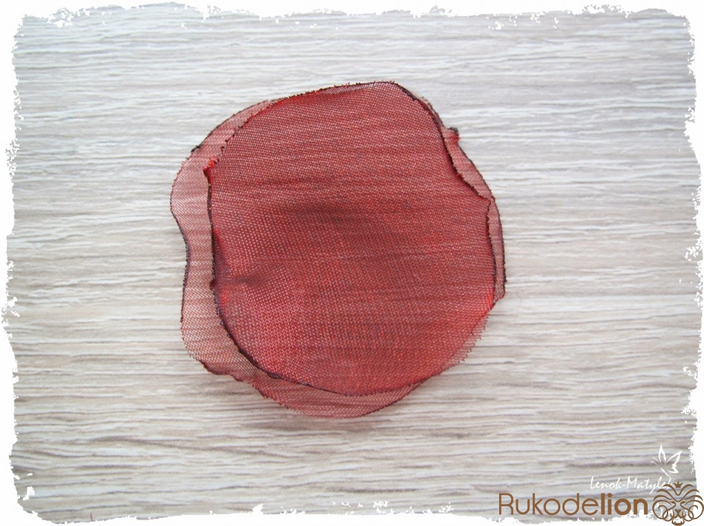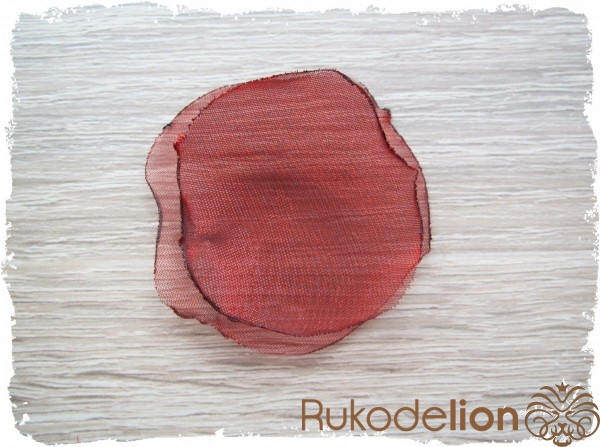 Наш обруч будет украшаться розочками, сделанными из разных тканей разными способами. Итого, будет четыре вида розочек. Приступаем к изготовлению розочек под номером 1. Для изготовления этого вида цветов мы будем использовать органзу. При помощи трафарета из ткани вырезаем кружочки диаметром 4 см. Обжигаем над свечкой. Затем берем вместе по два кружечка и складываем пополам, скручиваем. Формируем розочку, сшиваем, чтобы она не раскрутилась. Точно таким же способом сворачиваем остальные розочки.