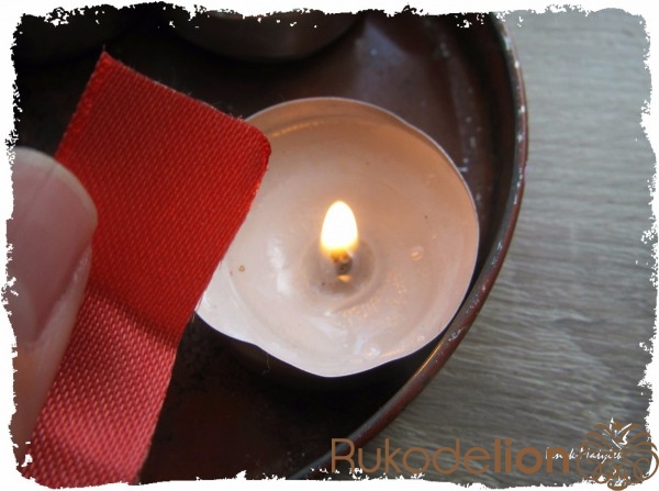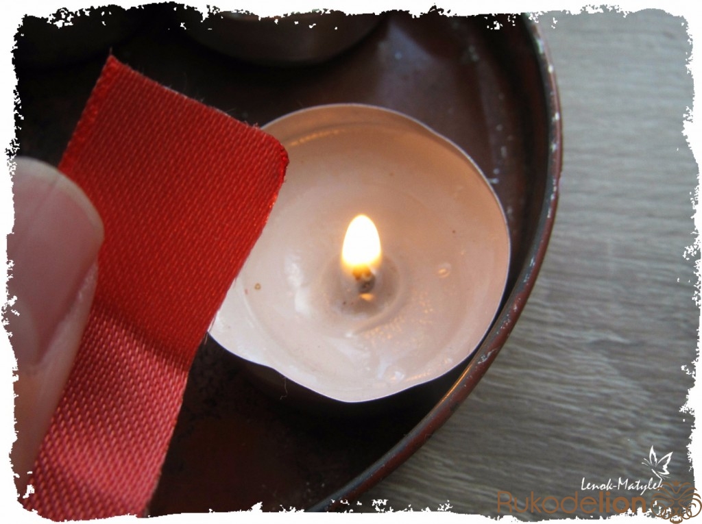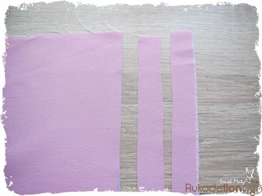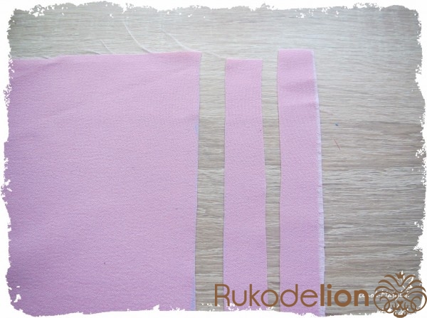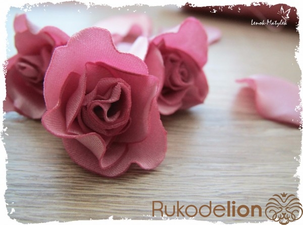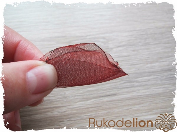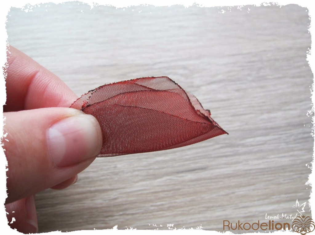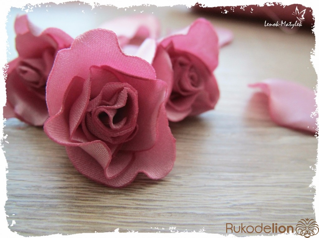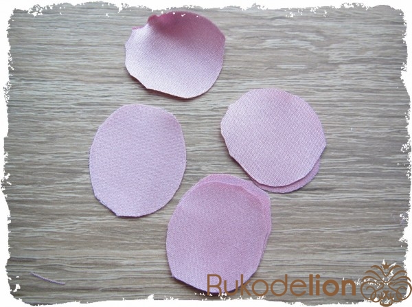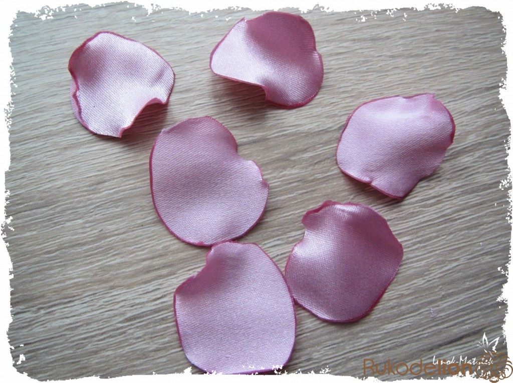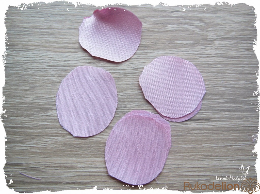 На очереди розочки под номером 3. Их мы будем изготавливать из атласной ткани. Так же, как при изготовлении розочек №2 отмеряем и отрезаем полоски шириной 3 см., но так, чтобы ткань тянулась по горизонтали. Далее с одной стороны полоски обжигаем над свечкой, немного потягивая, чтобы они стали  «волнистыми». Также вырезаем из ткани лепестки овальной формы, примерно 1,5 на 2 см. с расчетом, что на одну розочку понадобится 5 лепестков. Их также обжигаем. Затем скручиваем полосочку трубочкой, фиксируем ниткой «хвостик» и при помощи лепестков формируем окончательный вид розочек №3.