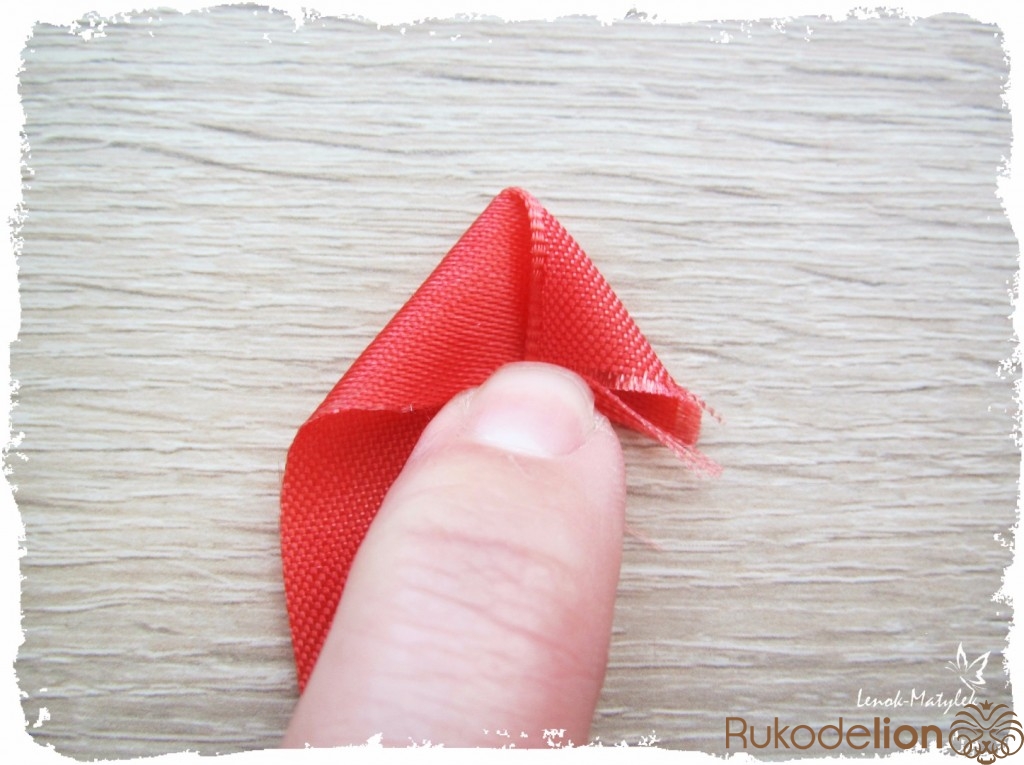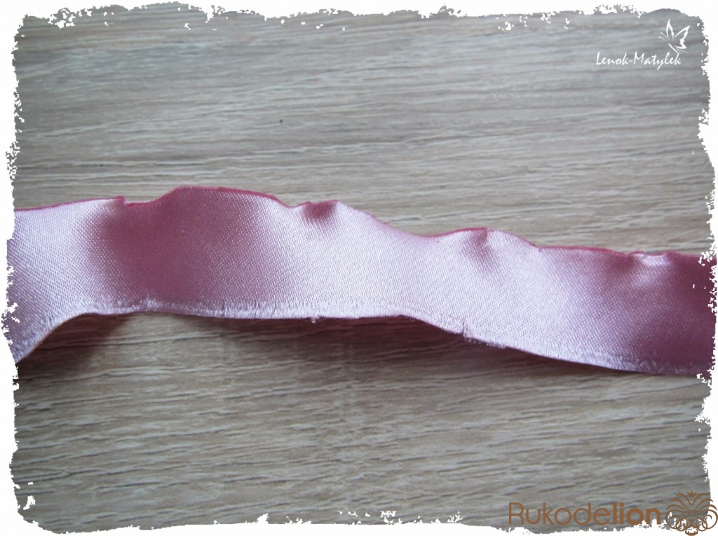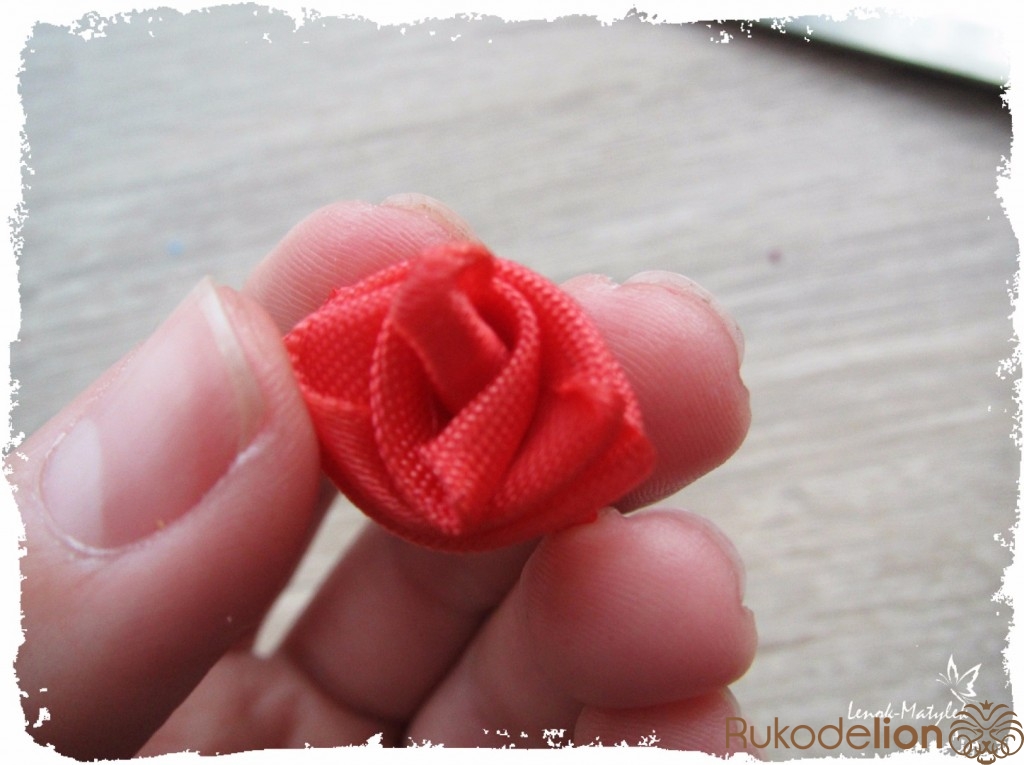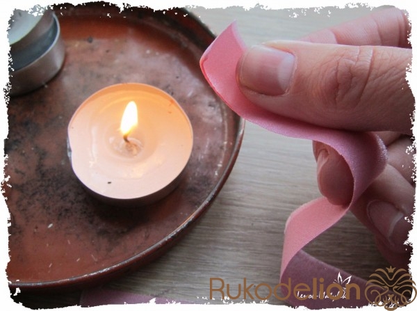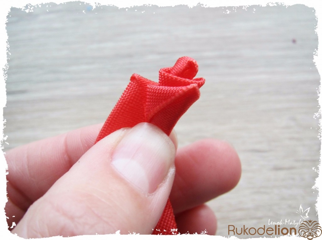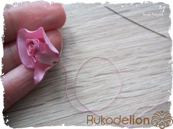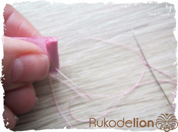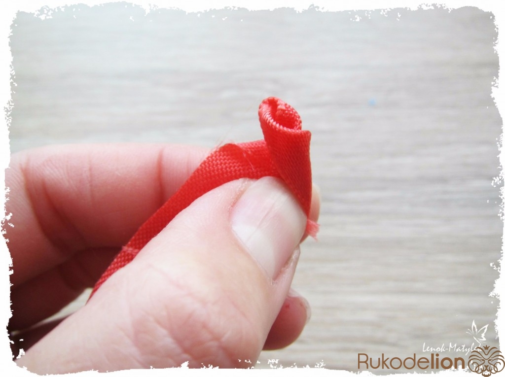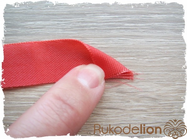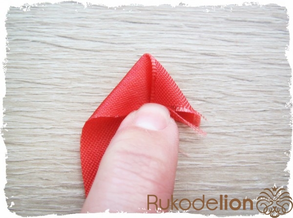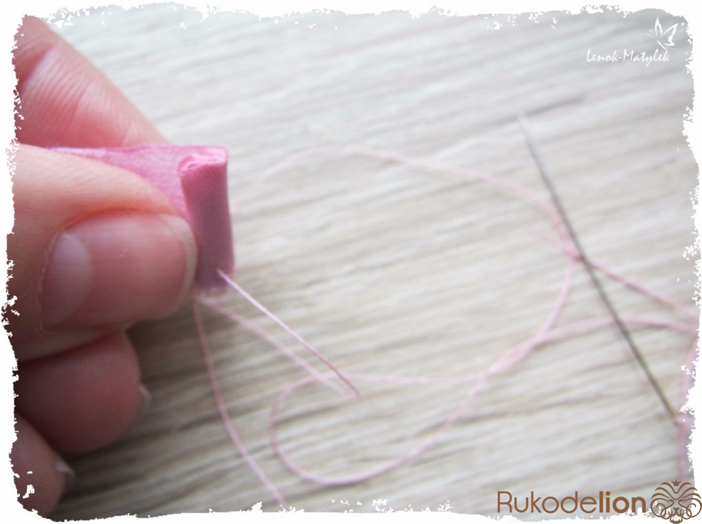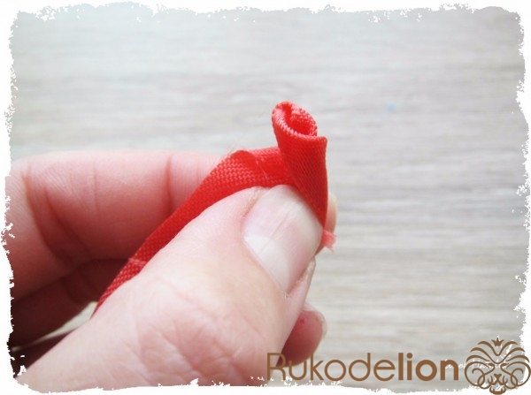 Приступаем к изготовлению четвертого вида розочек. Для этого будем использовать атласную ленту шириной 3,5 см. Разрезаем ее пополам вдоль. Получившиеся полоски также обжигаем с той стороны, где был разрез. Затем путем складывания ленты формируем розочку. Основание также сшиваем, чтобы наша розочка не раскрутилась.