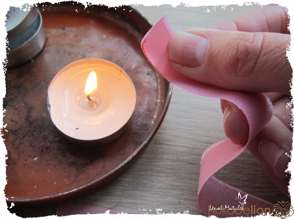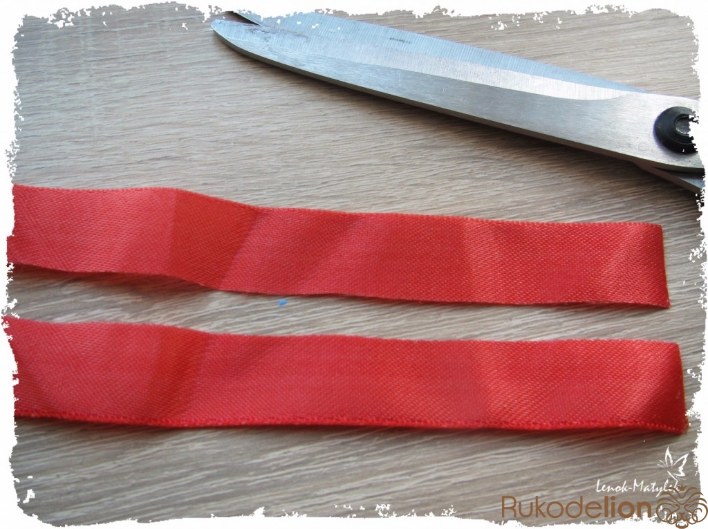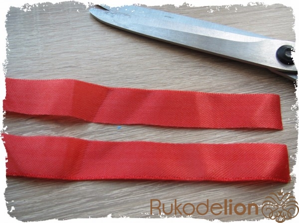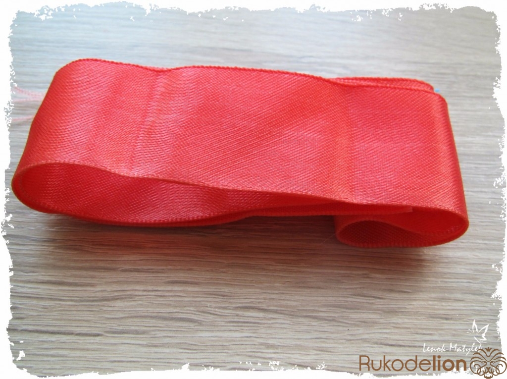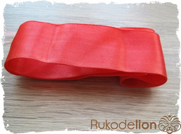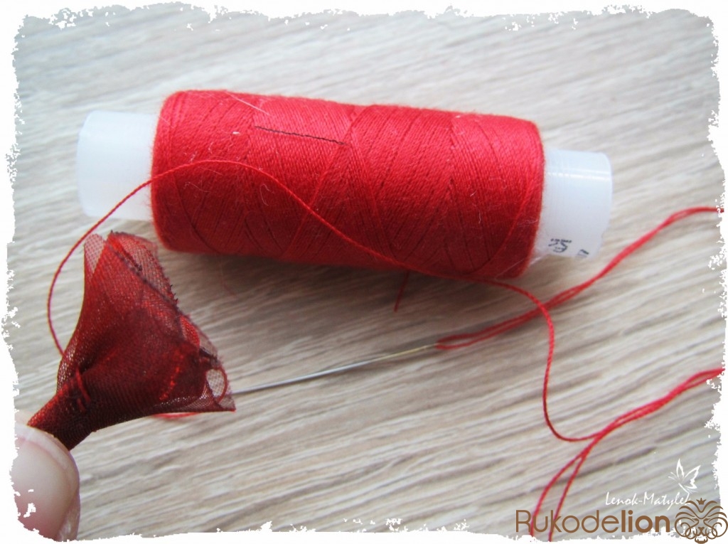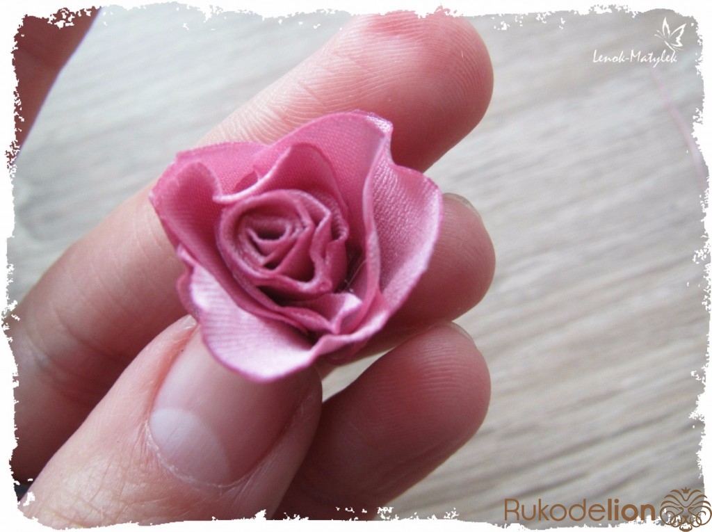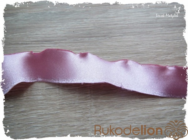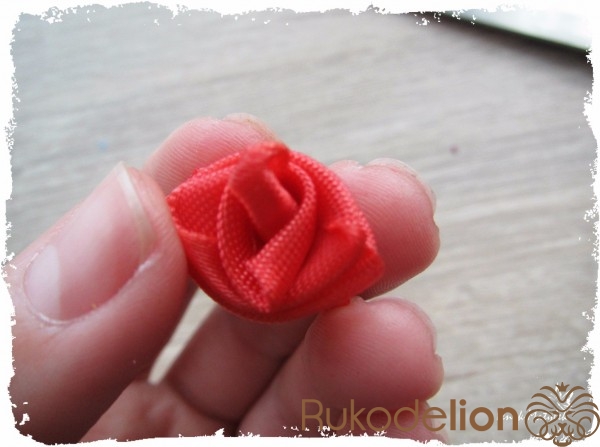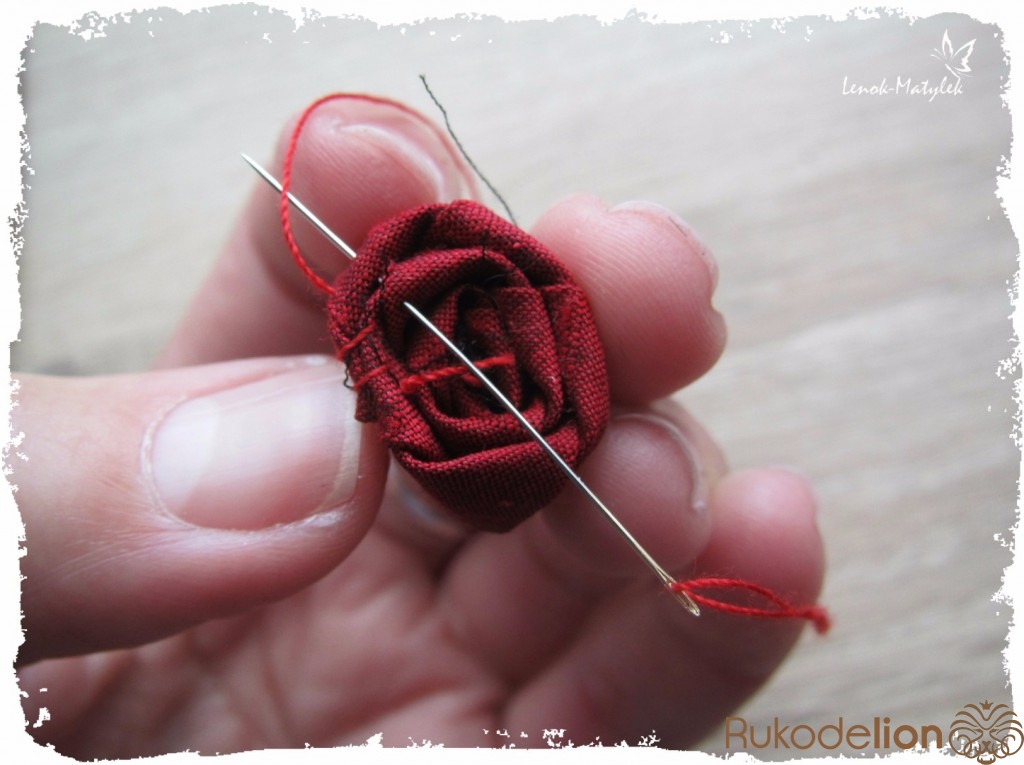 Приступаем к изготовлению четвертого вида розочек. Для этого будем использовать атласную ленту шириной 3,5 см. Разрезаем ее пополам вдоль. Получившиеся полоски также обжигаем с той стороны, где был разрез. Затем путем складывания ленты формируем розочку. Основание также сшиваем, чтобы наша розочка не раскрутилась.