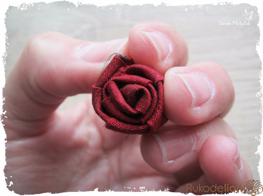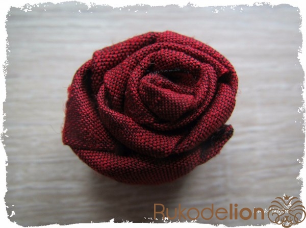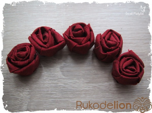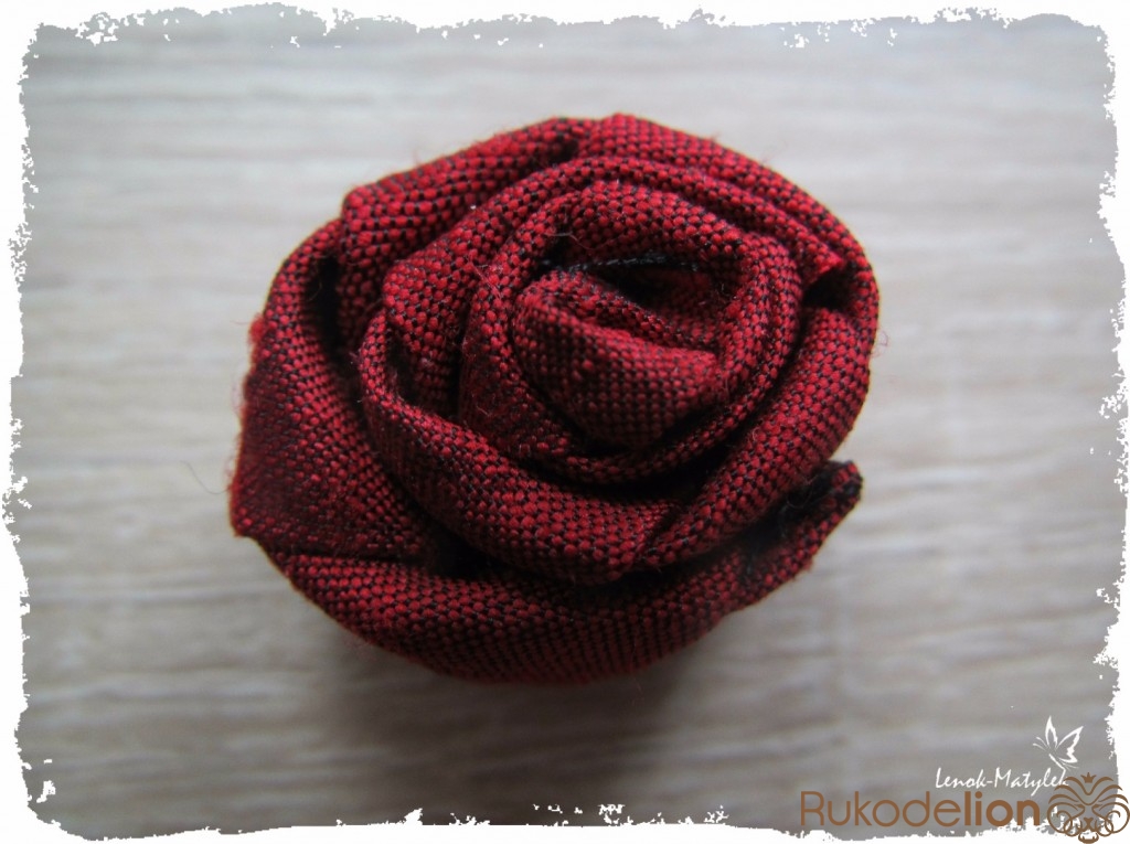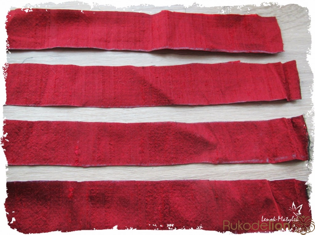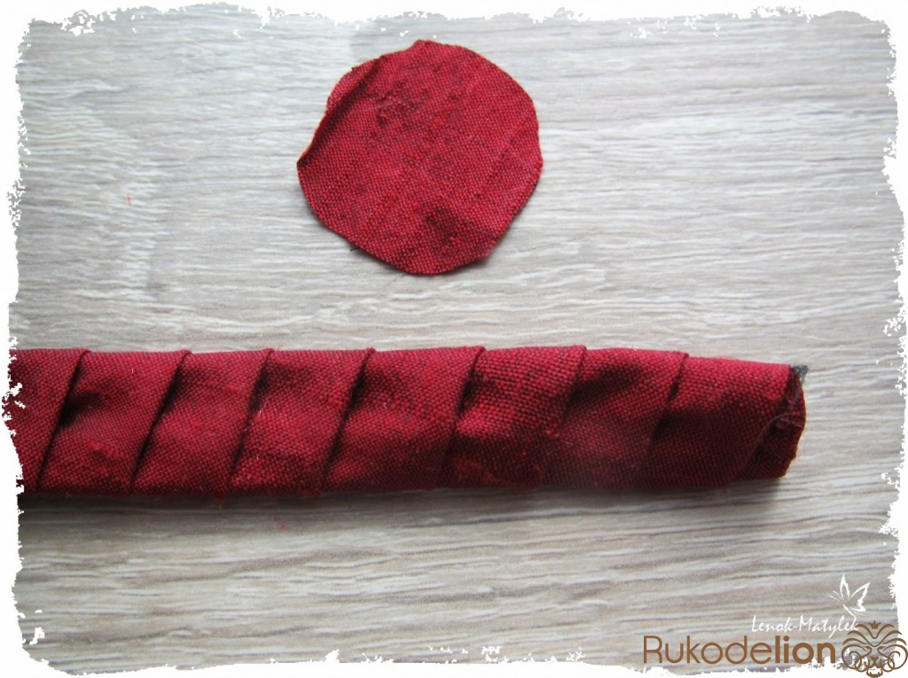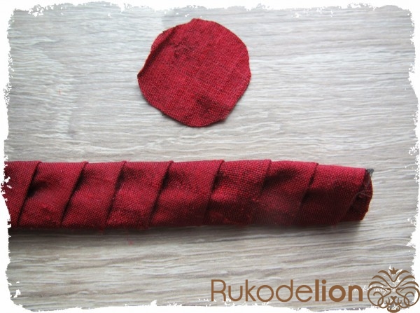 Приступаем к изготовлению розочек под номером 2. Для этого нам понадобится более плотная ткань. Отмеряем и отрезаем полоски шириной 3 см. и длиной 40 см.  Каждую полоску ткани складываем пополам и закручиваем вокруг тоненькой полоски картона (шириной 1,5 см). Картон аккуратно вытягиваем, а получившийся жгутик сворачиваем, формируя розочку, основание которой также сшивается для фиксации. Точно таким же способом скручиваются остальные  полоски ткани. Розочки под номером 2 готовы.