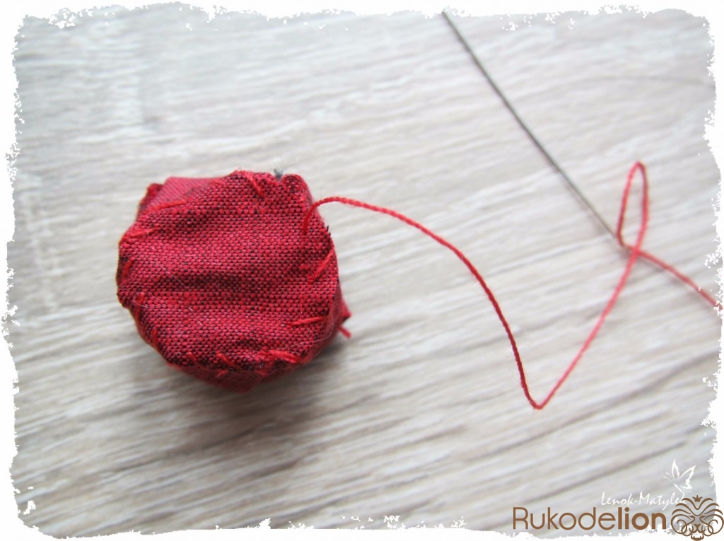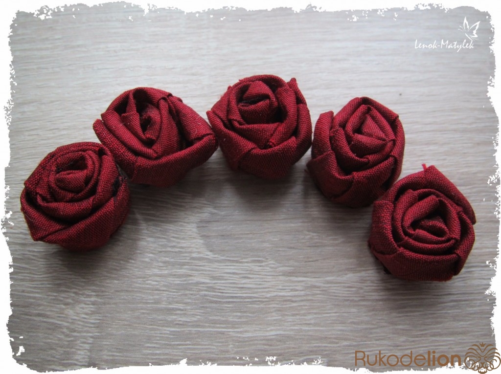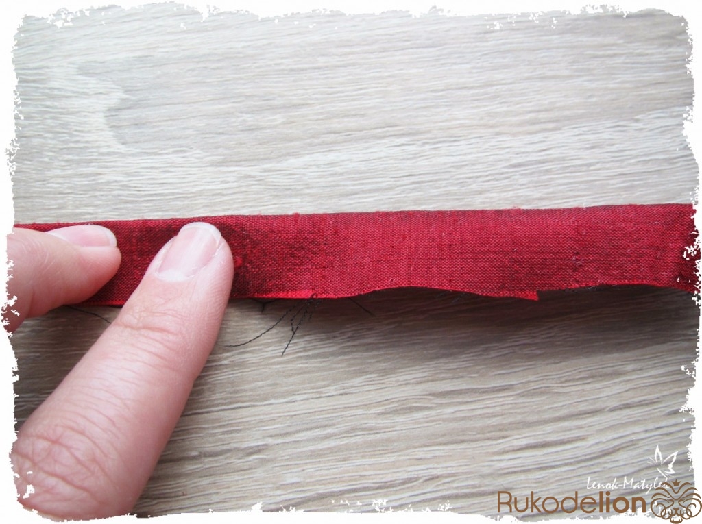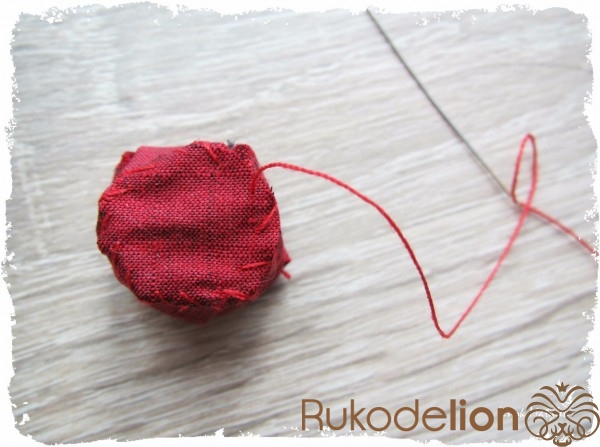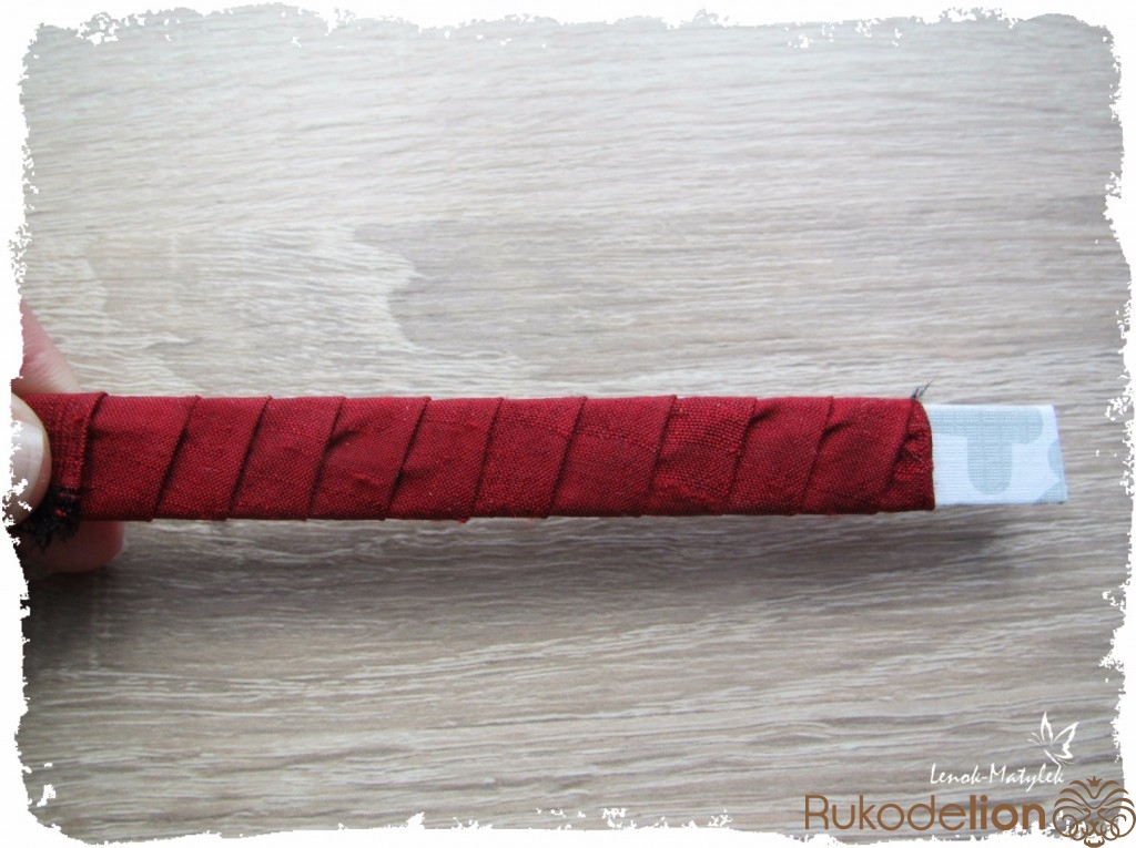 Приступаем к изготовлению розочек под номером 2. Для этого нам понадобится более плотная ткань. Отмеряем и отрезаем полоски шириной 3 см. и длиной 40 см.  Каждую полоску ткани складываем пополам и закручиваем вокруг тоненькой полоски картона (шириной 1,5 см). Картон аккуратно вытягиваем, а получившийся жгутик сворачиваем, формируя розочку, основание которой также сшивается для фиксации. Точно таким же способом скручиваются остальные  полоски ткани. Розочки под номером 2 готовы.